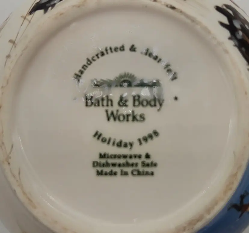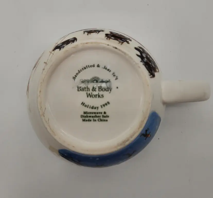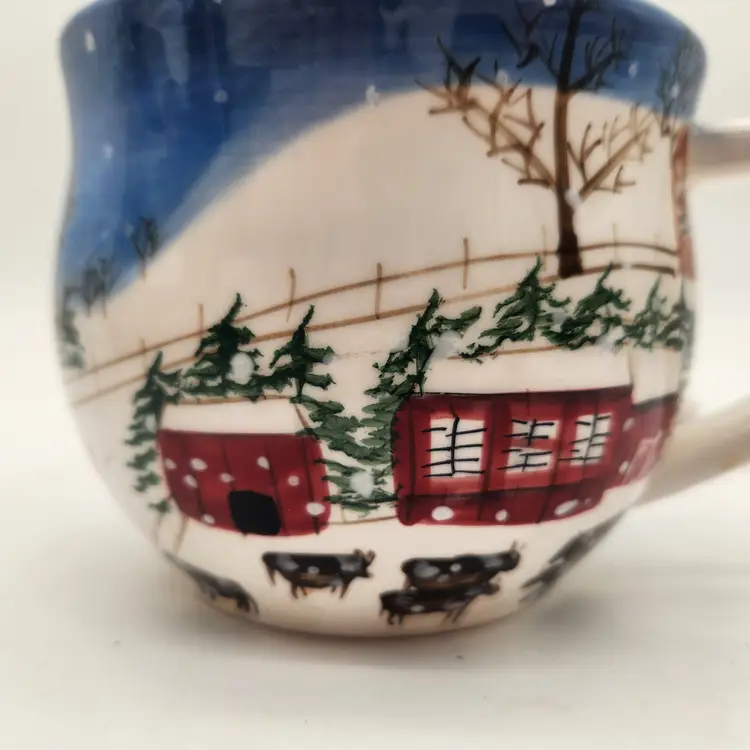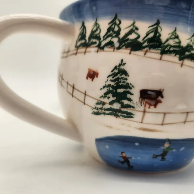 This is a whopper of a mug coming in at holding a full 24 oz. of the liquid goodness of your choice - it also would excel as the container for a gift of Holiday goodies! It's winter scene design makes it perfect for use all winter long. What's more - even with its size, it has a lovely shape with the body narrowing and the flaring out at the rim. Features: Dishwasher Safe, Microwave Safe, Suitable for Hot Beverages Measurements: 4 1/4" tall, 5 " diameter across the rim Like New Condition: no signs of wear. Keywords: Mistletoe Co mug, winter scene mug, holiday mug, Christmas mug, skating mug, farm scene mug, ceramic mug, coffee mug, tea cup, hot cocoa mug, dishwasher safe mug, microwave safe mug, gift idea, winter decor, countryside scene