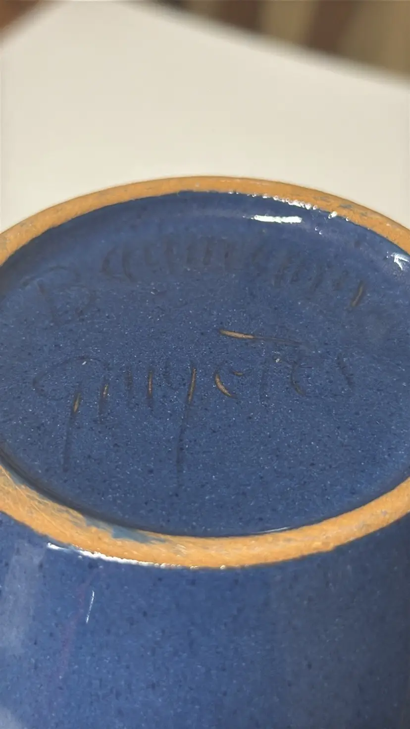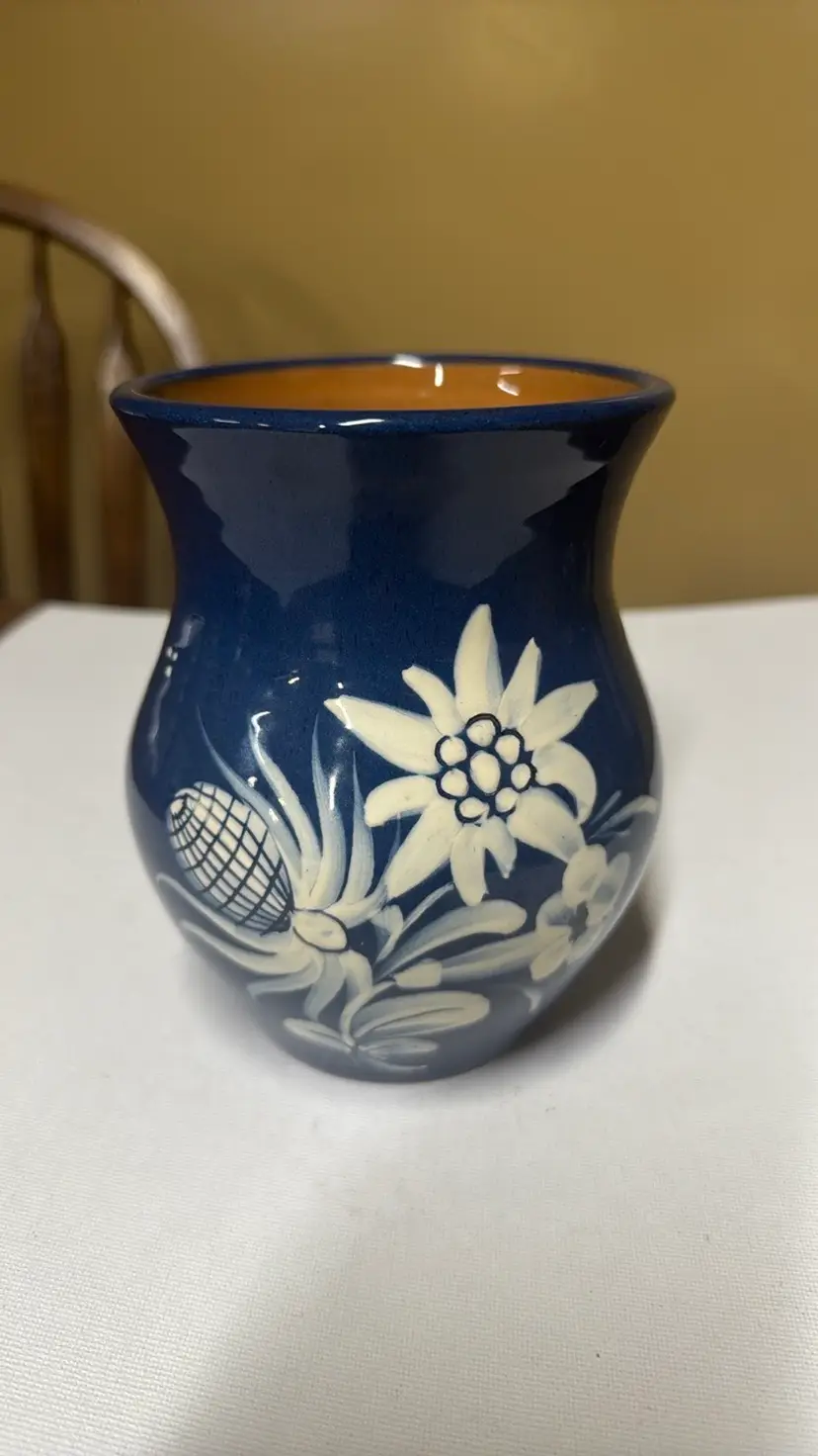 BAUMANN GRUYERES Pottery Vase made in Switzerland Red clay Signed by the artist 6” tall 4.25” diameter Beautiful blue with cream white glaze Excellent like new condition with no breaks or chips (112128253)