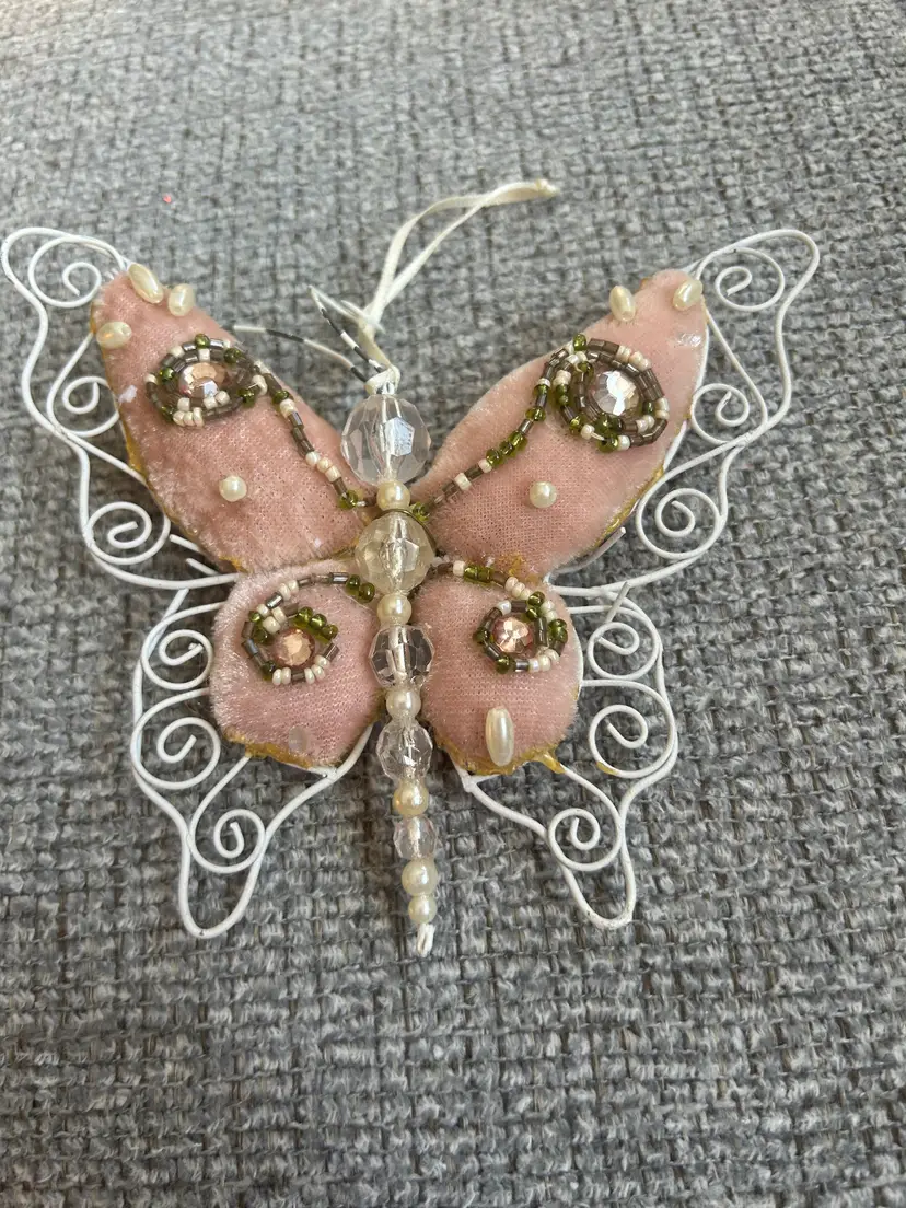 Delicate beaded butterfly ornament with intricate wire detailing and pink fabric wings. Perfect for adding a whimsical touch to your decor.