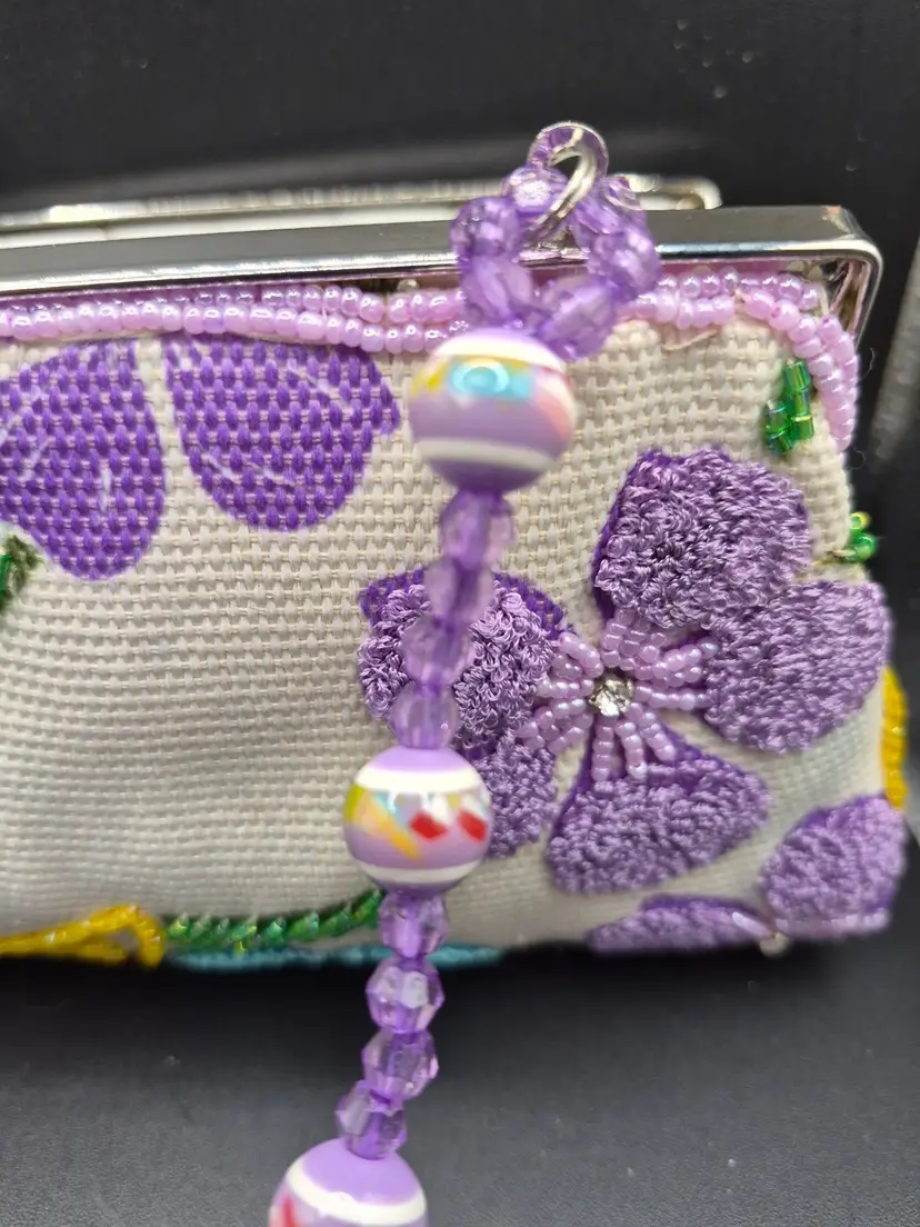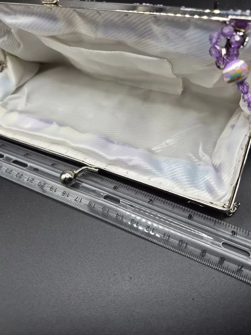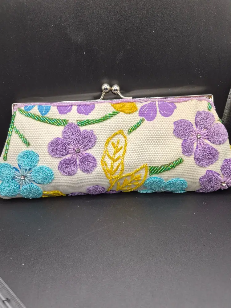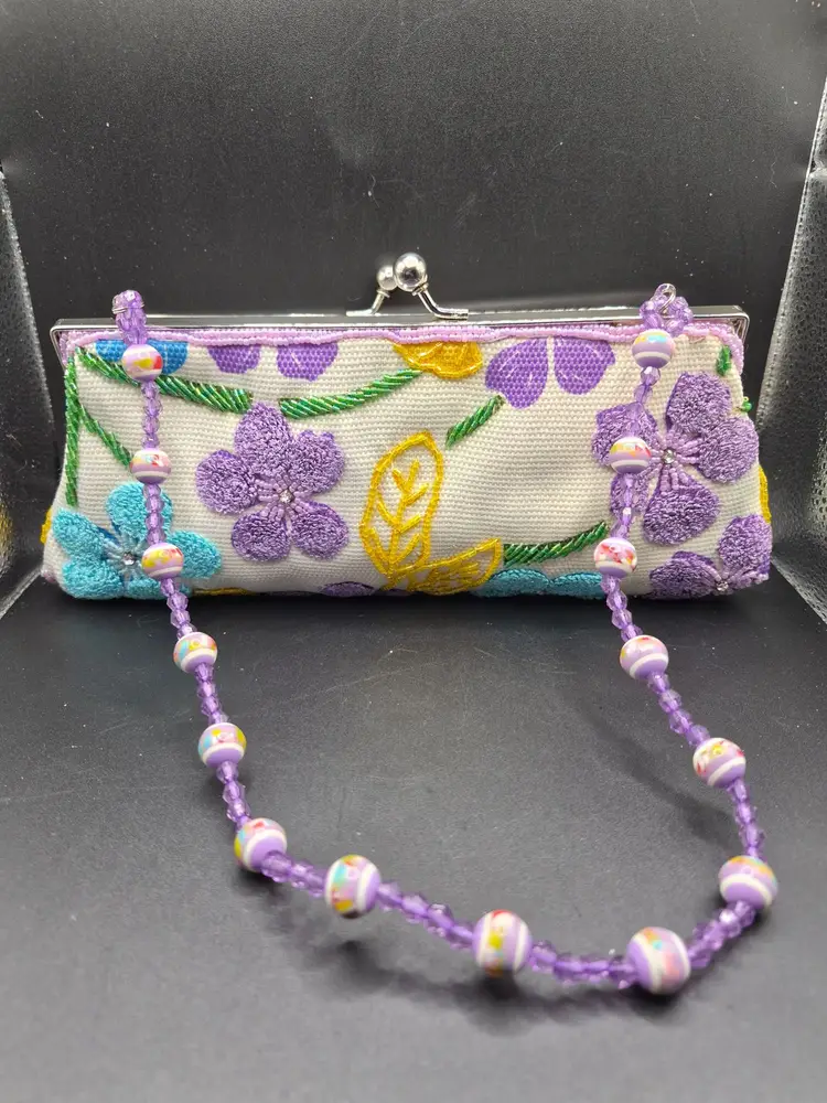 Beaded Floral Embroidered Clutch Purse With Beaded Strap & Silver Chain