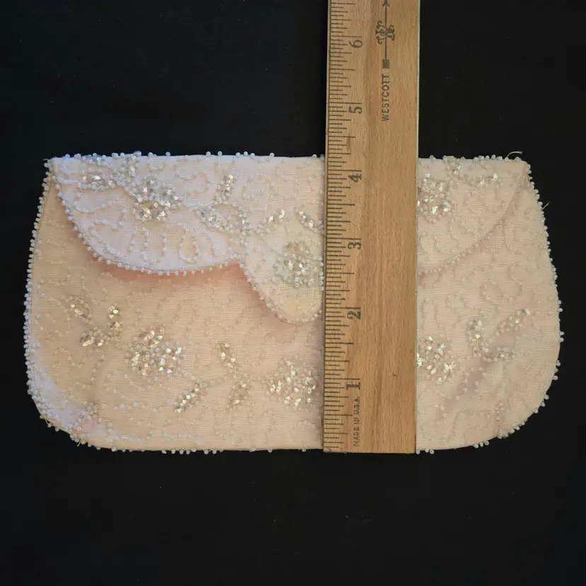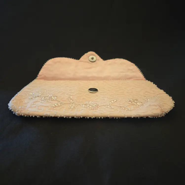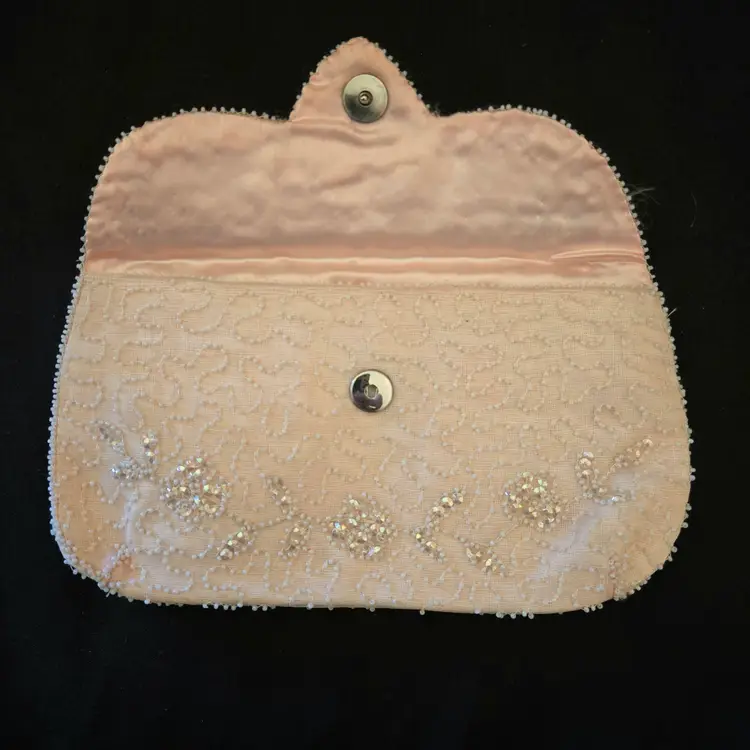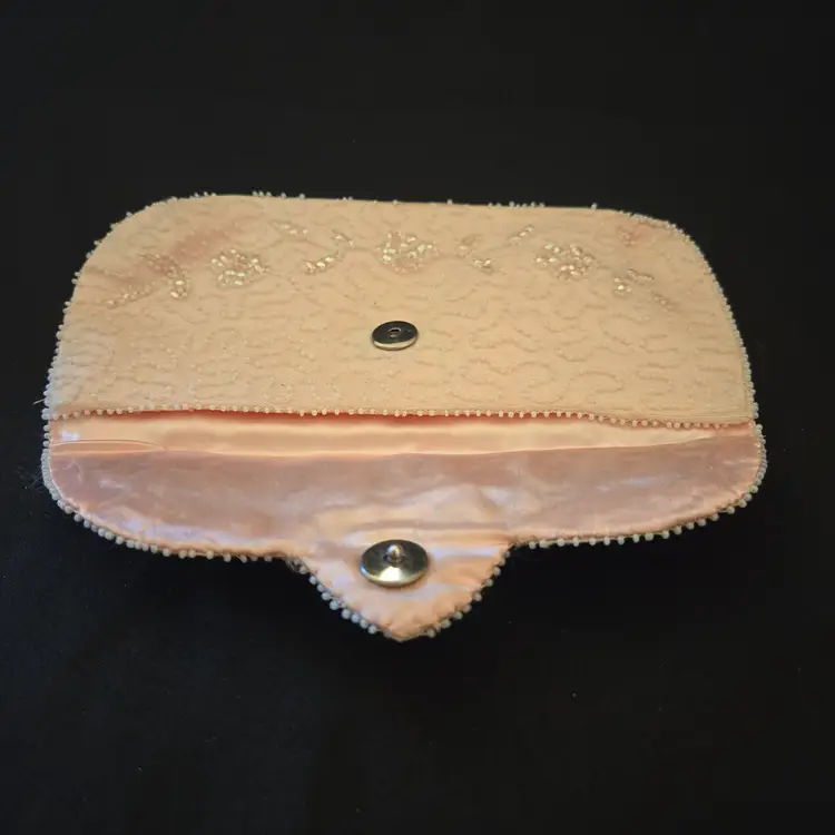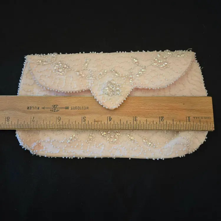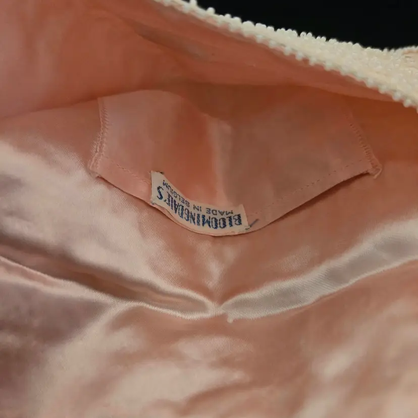 Beaded Snap Clutch Bag Handmade in Belgium for Bloomingdales 1950’s 4¼" × 7⅝" Vintage with original label inside. Used condition with creases, folds, bends, loose thread, might be missing beads, stains. Please view all the photos and ask any questions prior to purchase when possible.