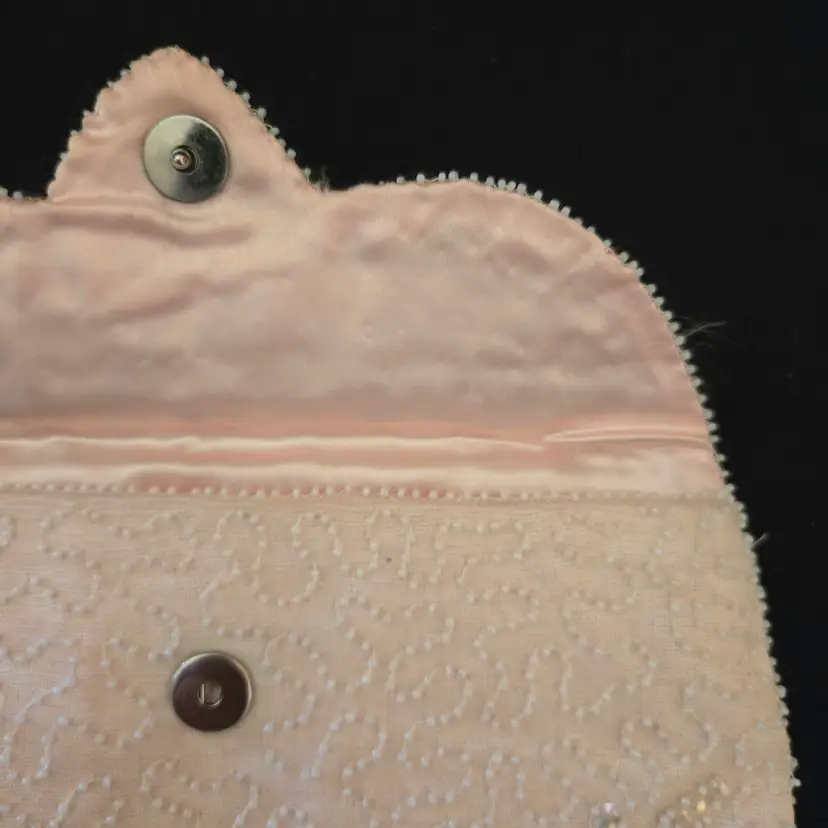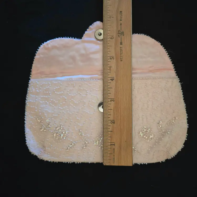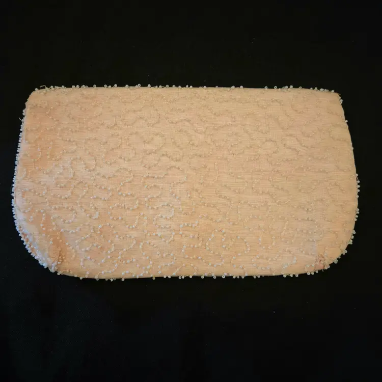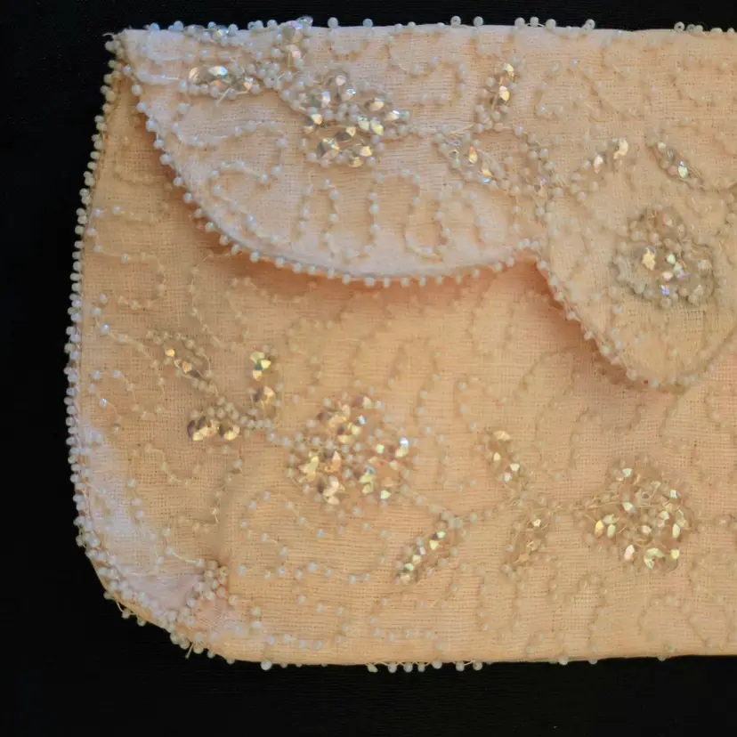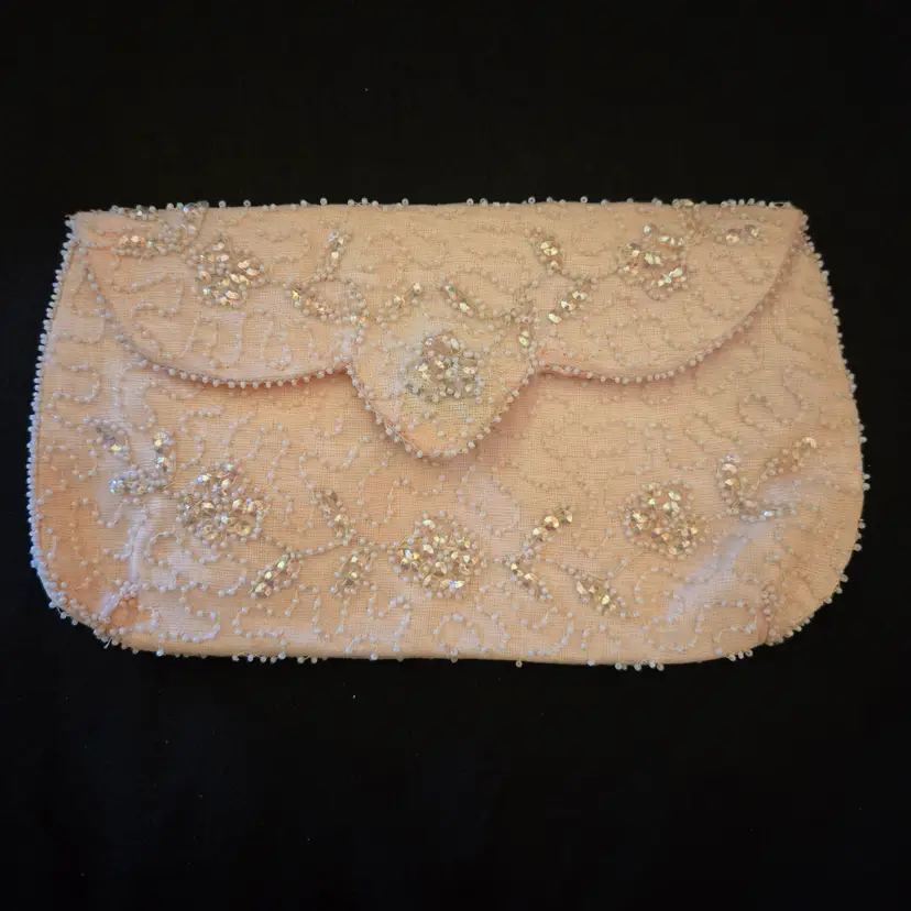 Beaded Snap Clutch Bag Handmade in Belgium for Bloomingdales 1950’s 4¼" × 7⅝" Vintage with original label inside. Used condition with creases, folds, bends, loose thread, might be missing beads, stains. Please view all the photos and ask any questions prior to purchase when possible.