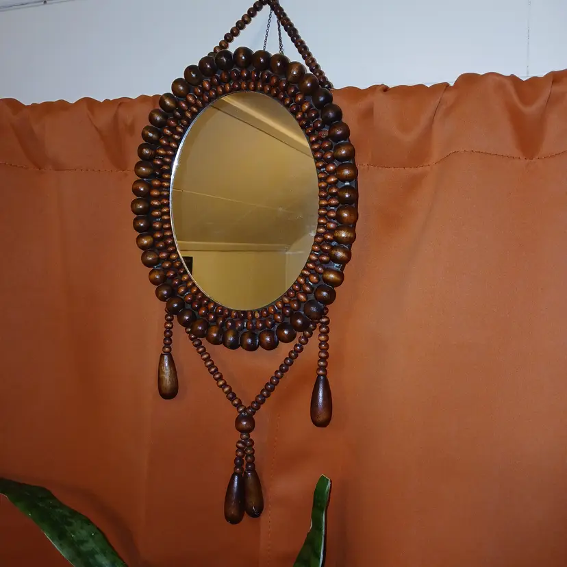 Oval Beaded wall mirror from 1970's, has wooden beads surrounding mirror. Measuring 101/2 × 81/2 for the frame and 221/2 from top hanger to bottom tassel
