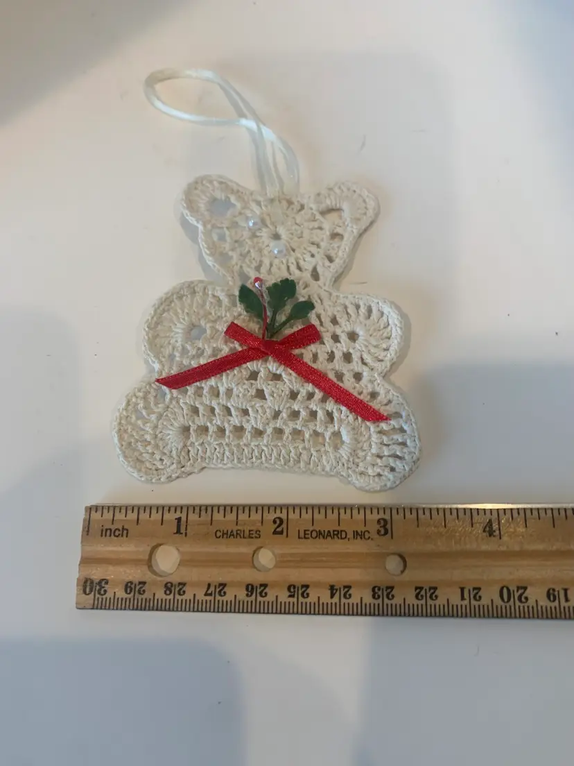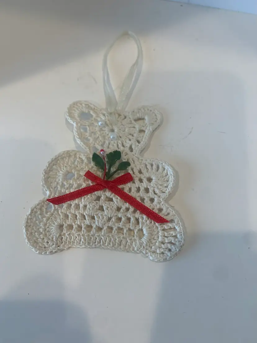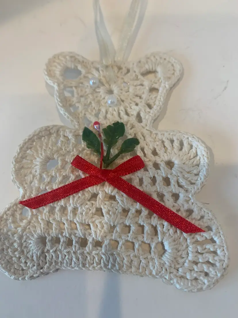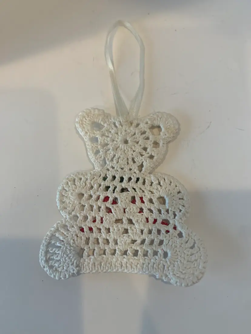 This ornament is a handmade crocheted teddy bear crafted from white yarn. The design features open, lacy stitching that gives it a delicate, vintage appearance. The bear has a rounded head, arms, and legs, and a simple loop of white ribbon attached at the top for hanging on a Christmas tree.