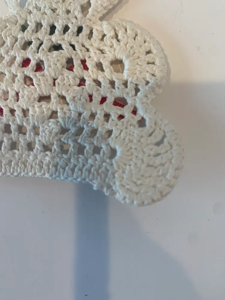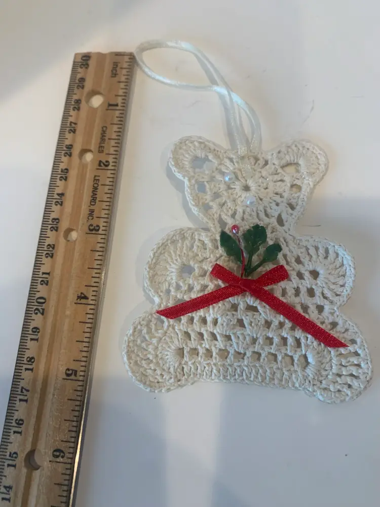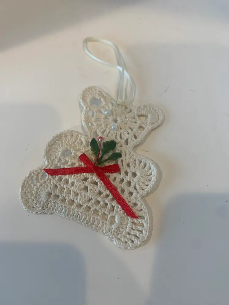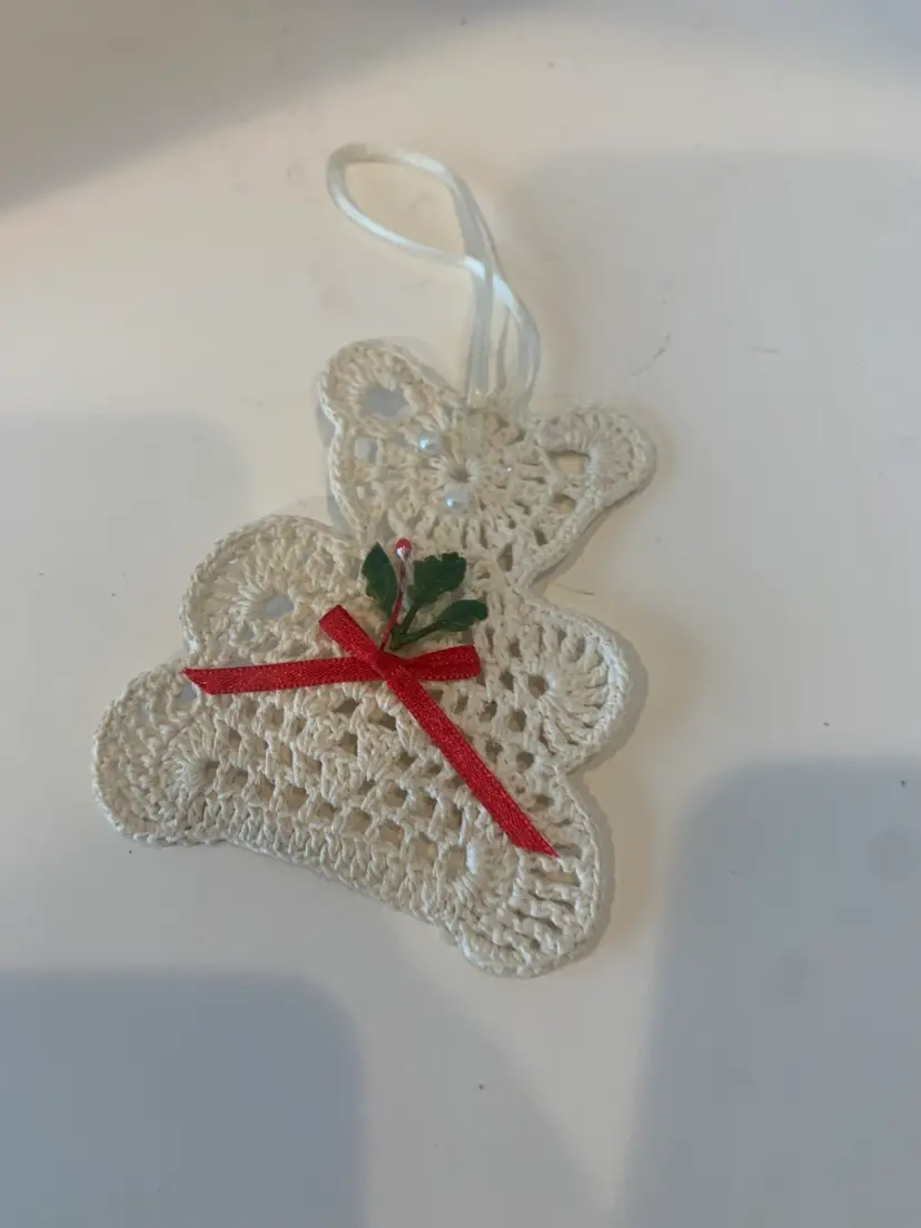 This ornament is a handmade crocheted teddy bear crafted from white yarn. The design features open, lacy stitching that gives it a delicate, vintage appearance. The bear has a rounded head, arms, and legs, and a simple loop of white ribbon attached at the top for hanging on a Christmas tree.