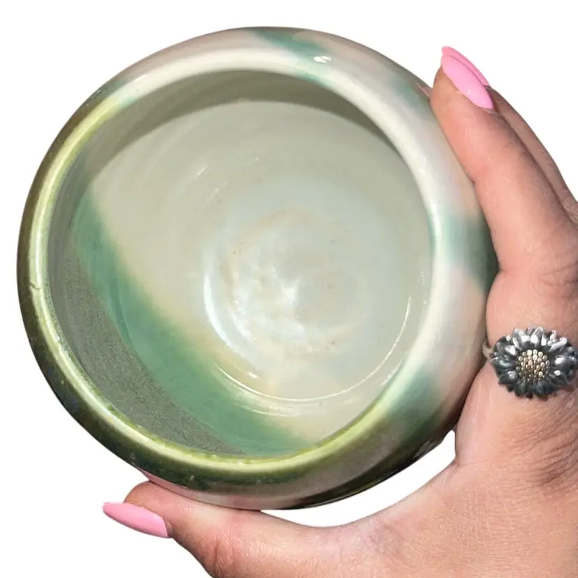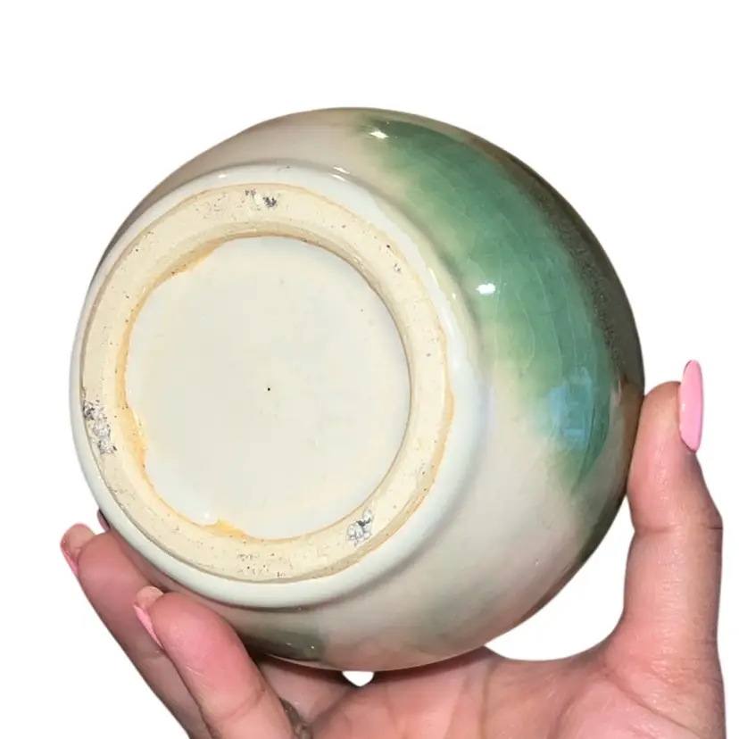 it is signed by the artist but like underneath the glaze on the bottom. Diameter is 3 inches and the height is 4 1/2 inches.
