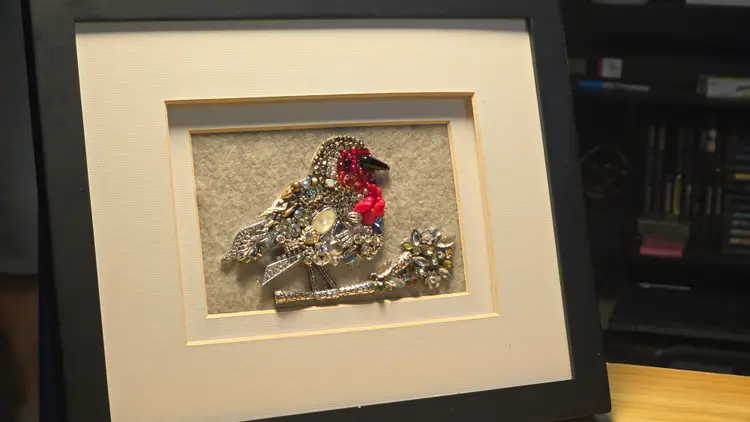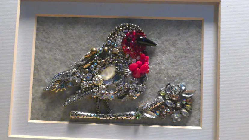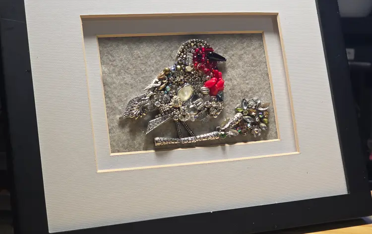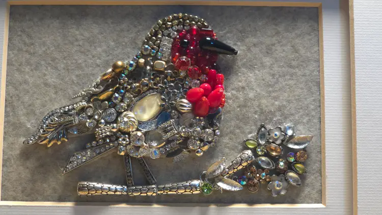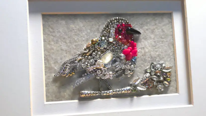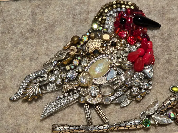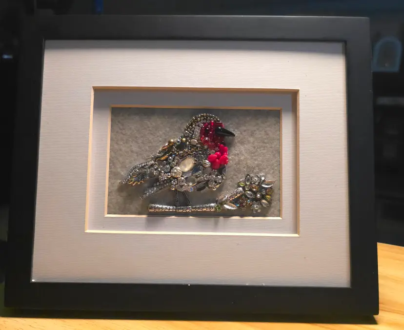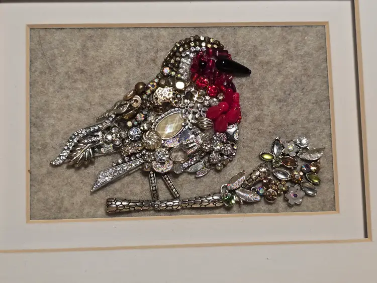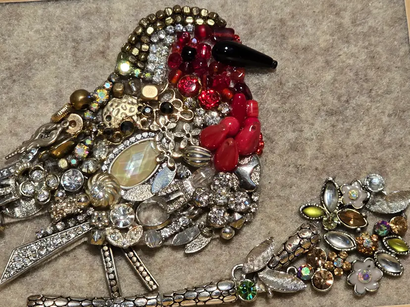 This is a beautiful handmade jewelry art piece featuring a robin sitting on a branch. It’s created using a mix of vintage and modern costume jewelry, rhinestones, beads, and sparkling accents to form the shape of the bird. Each piece is individually placed, giving the artwork great texture, shine, and detail.