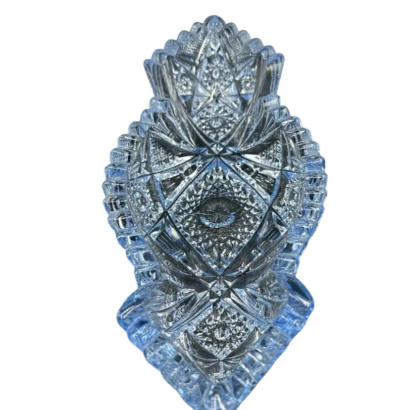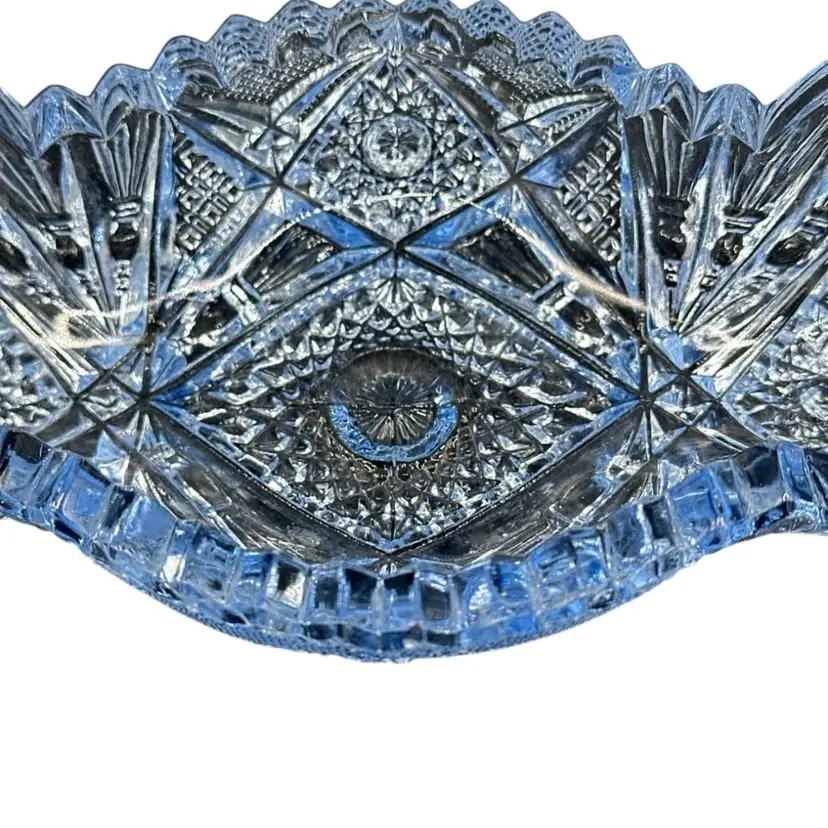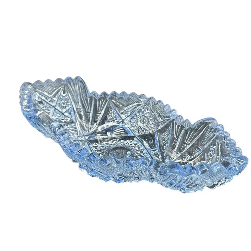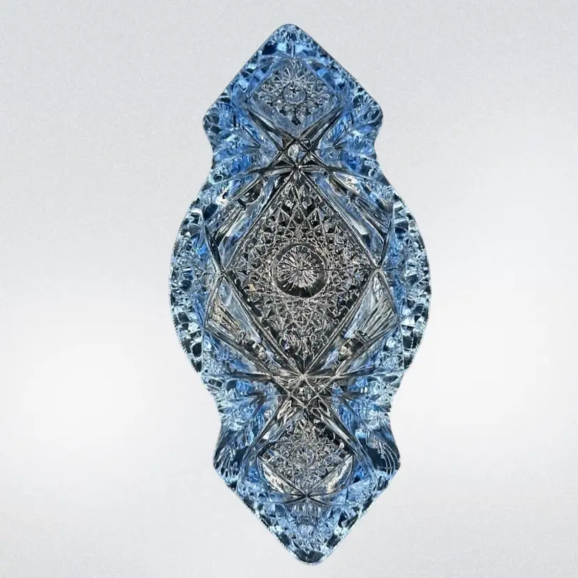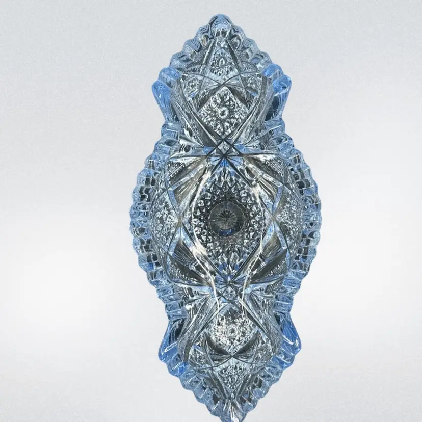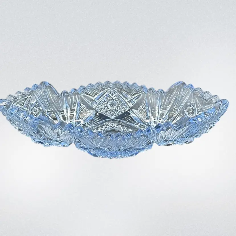 This beautiful sky blue Imperial Glass Co antique serving dish in the "Nucut" pattern #564O is a vintage piece from America in the 1950s. The oval-shaped bowl features a glossy finish and a stunning art deco style with a diamond theme. Measuring 7.5 inches in length, 3.5 inches in width, and 2 inches in height, this decorative bowl is a unique addition to any collection or as a standalone piece for all occasions. Hand wash only to preserve its original charm and vintage appeal.No chips, no cracks