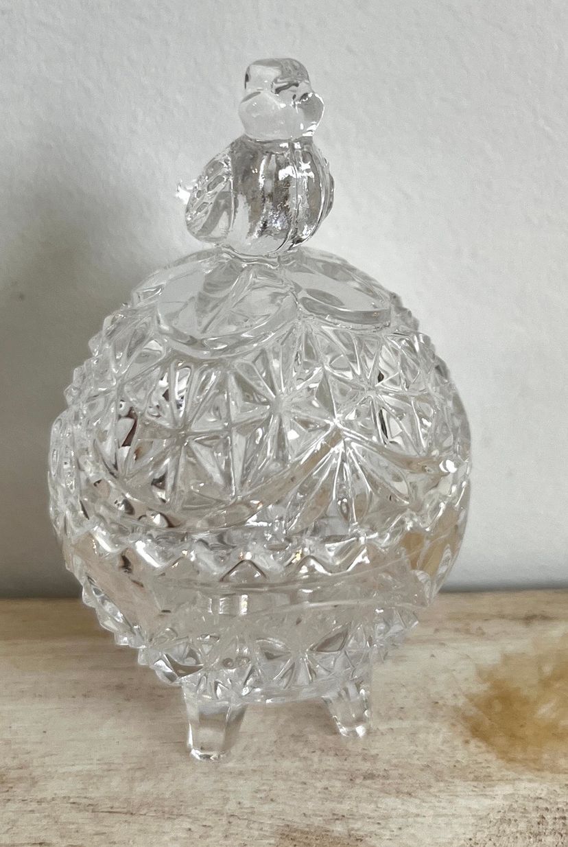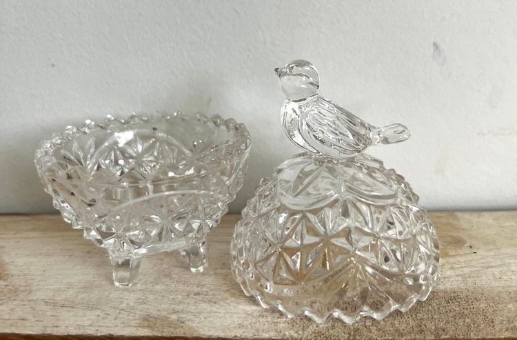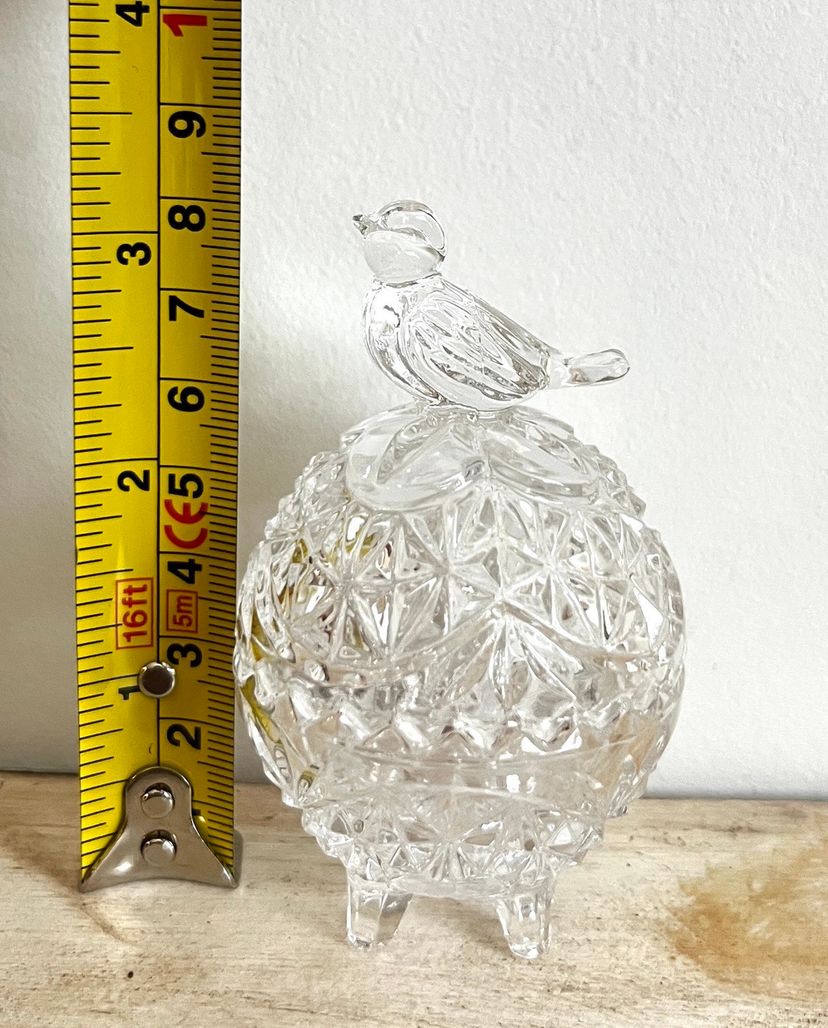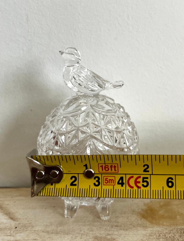 This beautiful Trinket dish is beautifully detailed with zigzag edges, 4 Footed and little bird on the lid.
