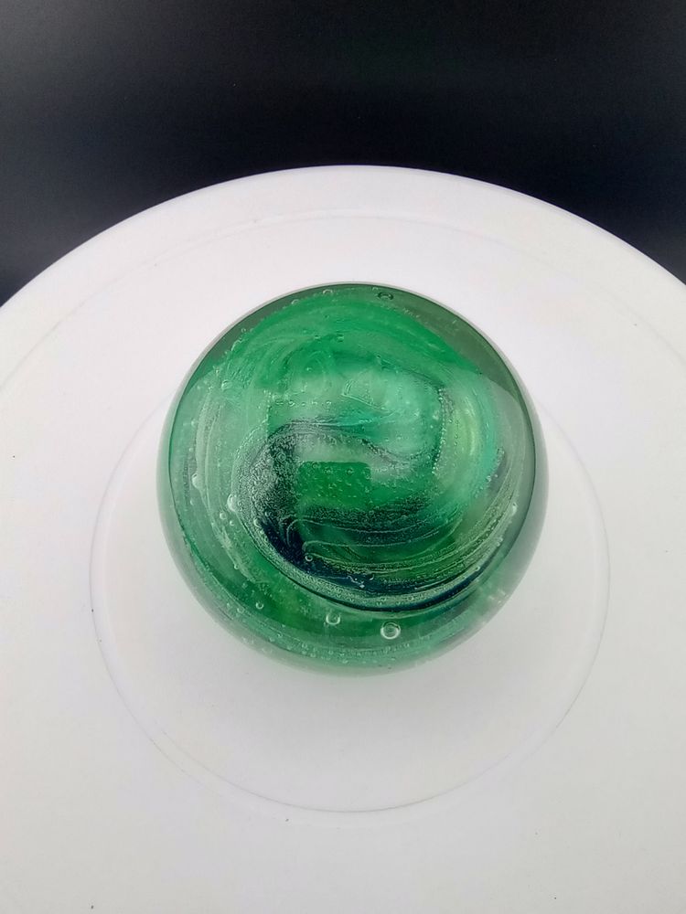 This beautiful paperweight from Ireland is swirled with shades of green, almost creating a galaxy inside the glass. It's mesmerizing and in excellent condition with no chips or cracks and a very clear flame stamp on the pontil. Approximately 3.5" tall and 3.5" wide