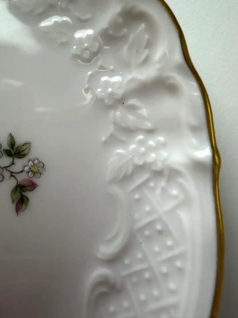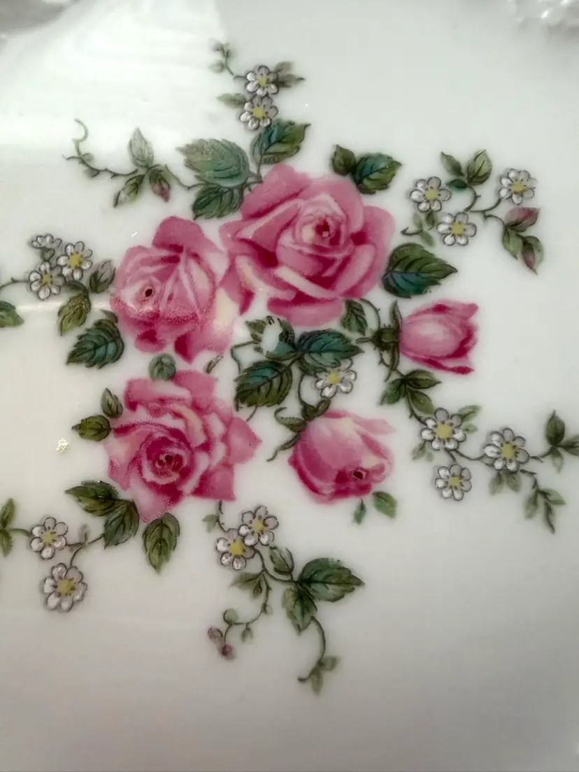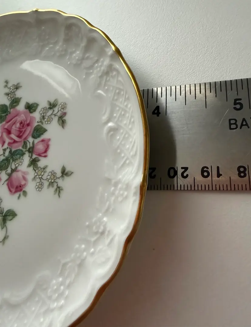 Beautiful pink roses and a gorgeous embossed trim define this trinket plate.
