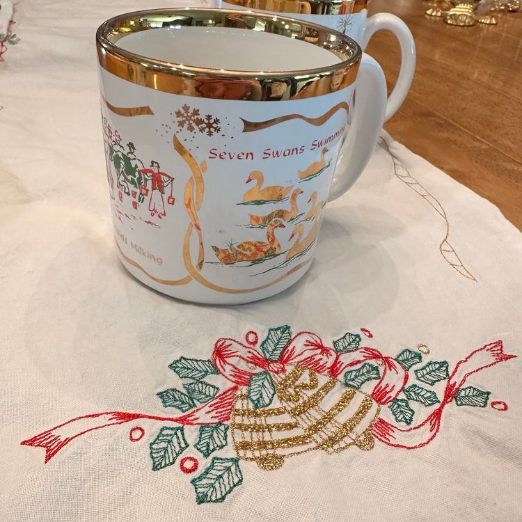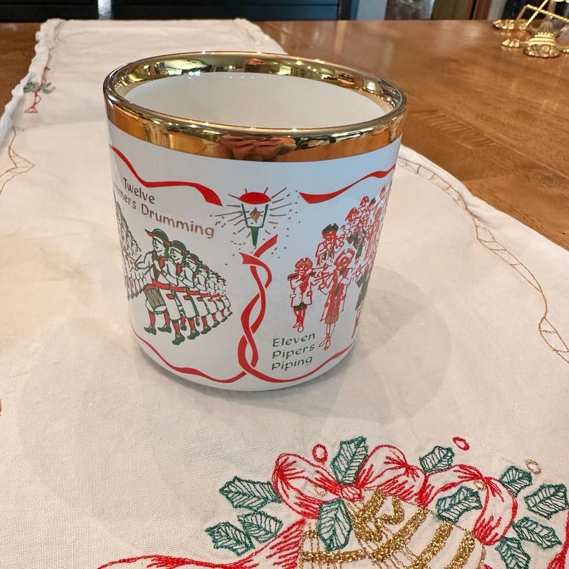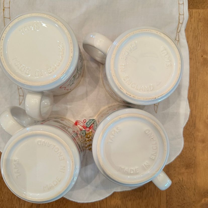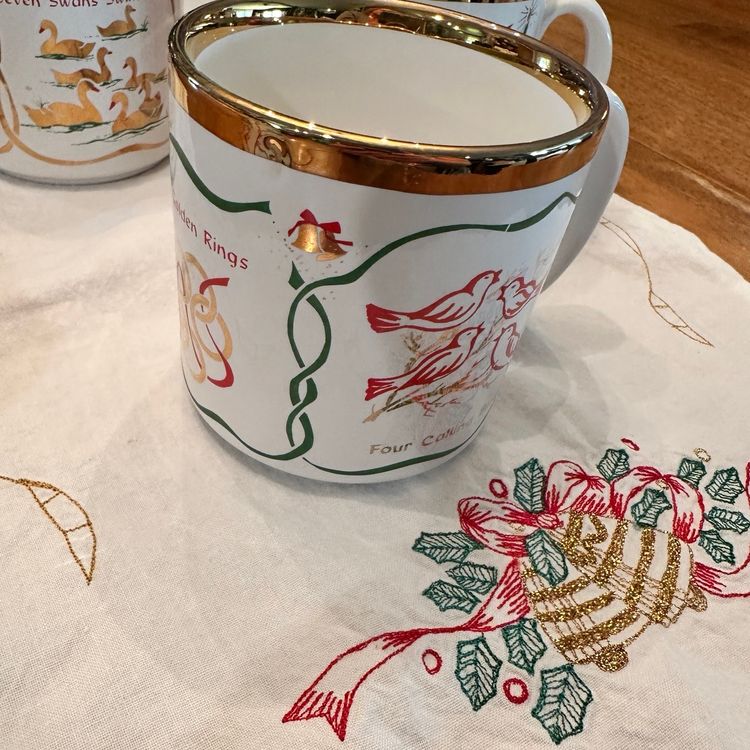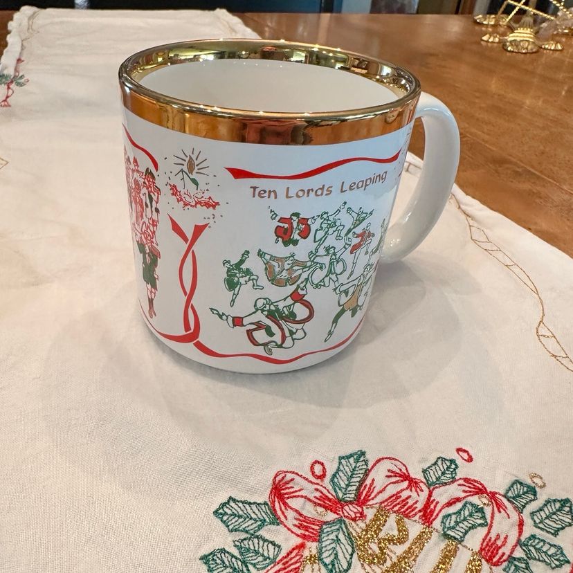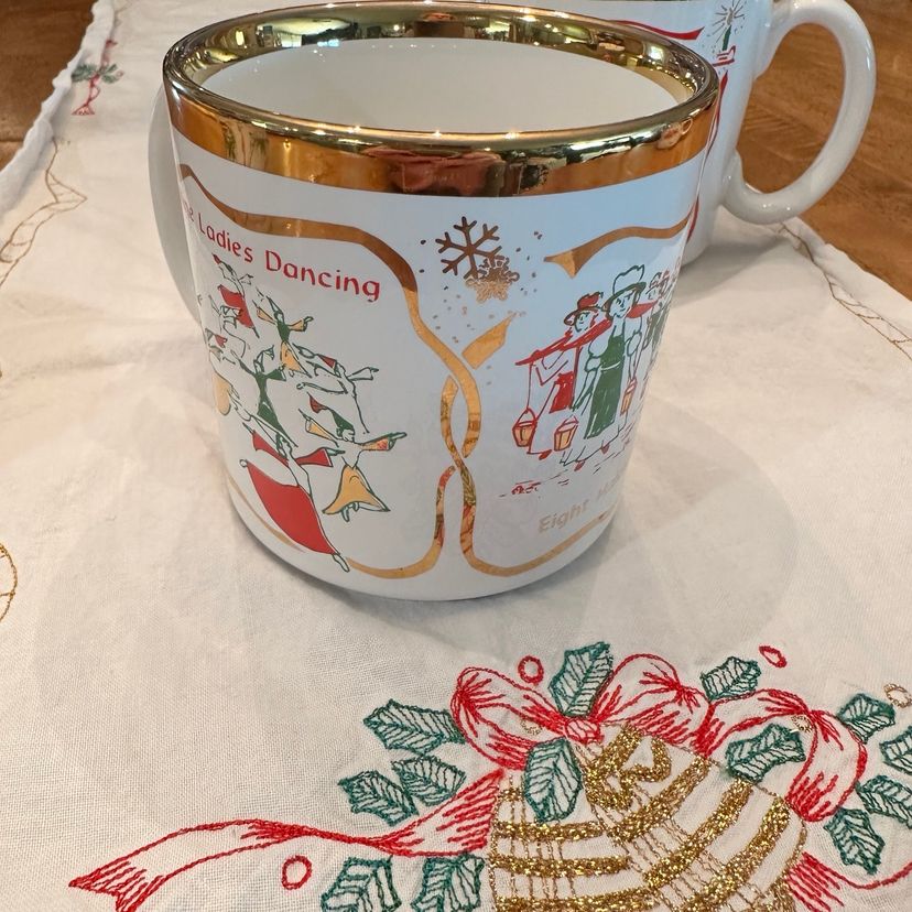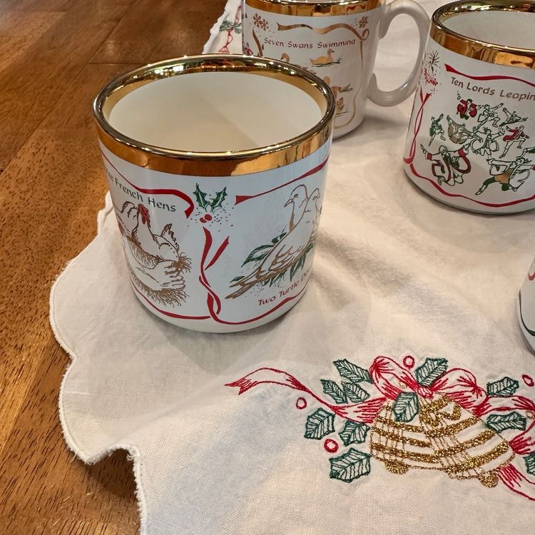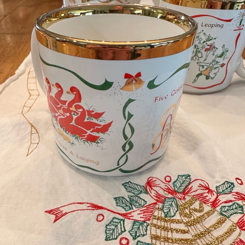 Beautiful Vintage Twelve Days of Christmas Mugs made in England By TAMS. Features 3 Song Motifs on each mug with gold accents. Perfect for Christmas Morning Brunch!