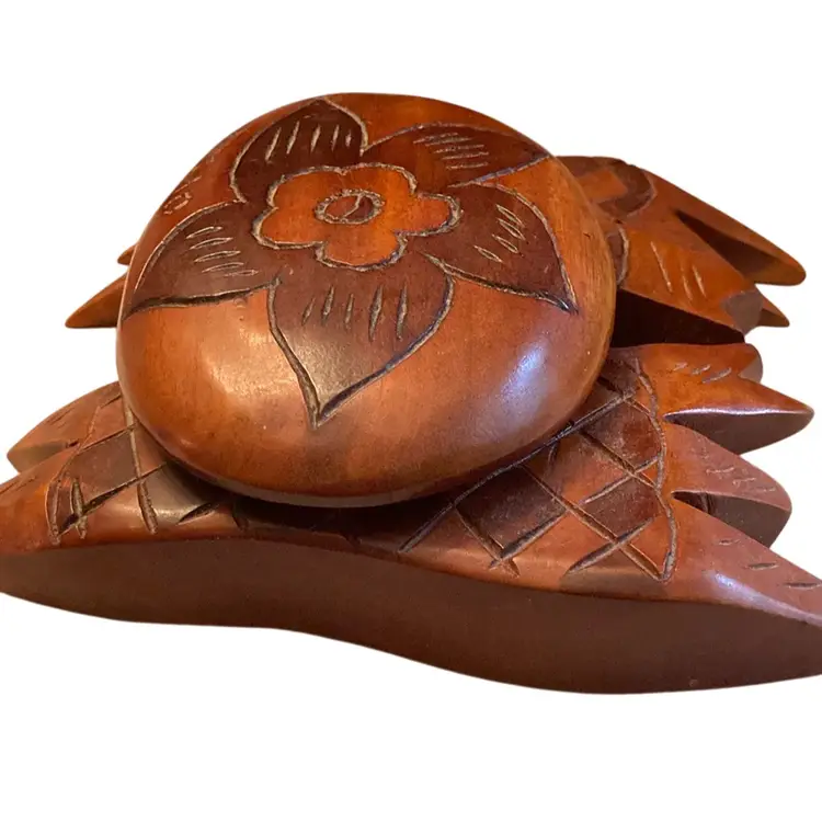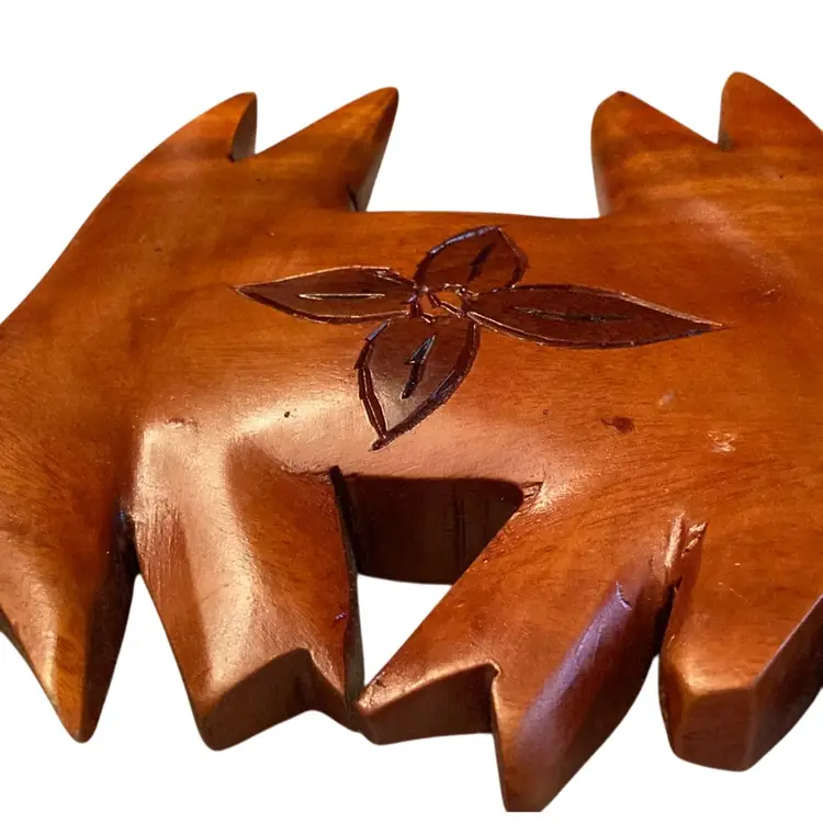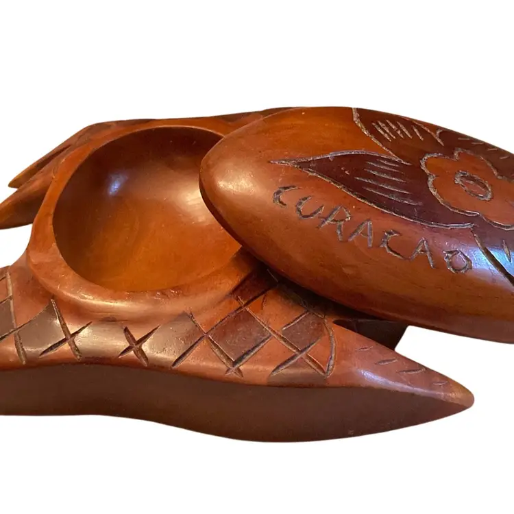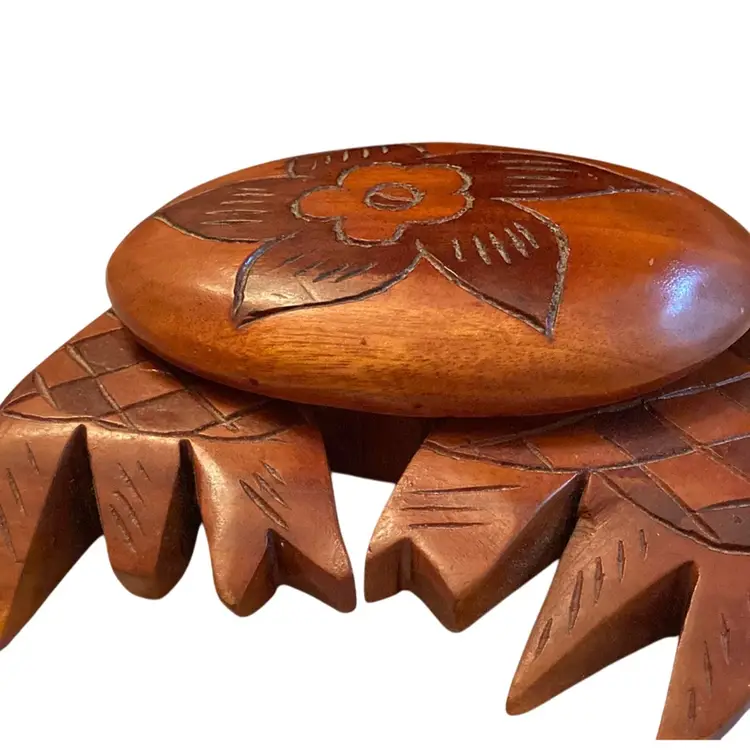 Beautifully carved crab with a flower on the top and bottom. 5” x 6” has he name Curaçao on lid which is a Caribbean Island. Great condition.
