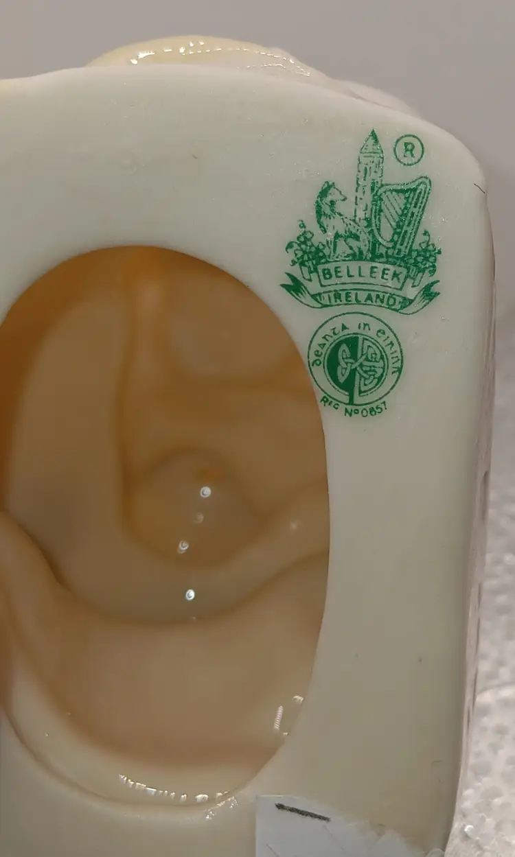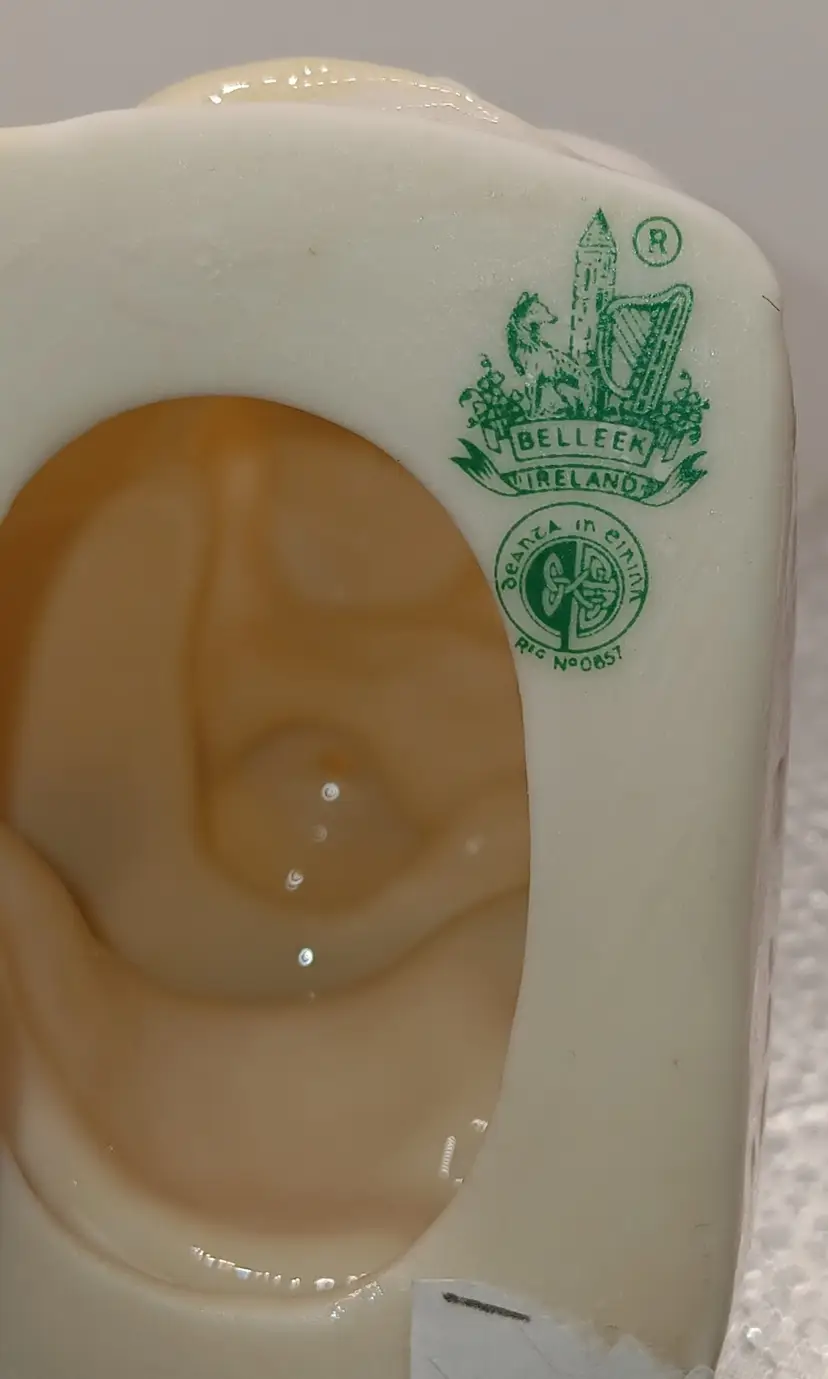 A porcelain Leprechaun sitting on a mushroom. Has a lusterware glaze. Excellent condition no chips or cracks. Has the Belleek stamp on the bottom.