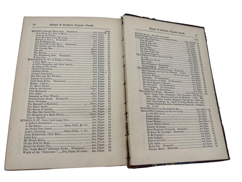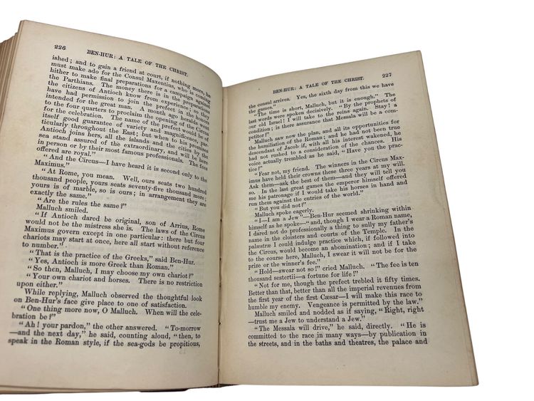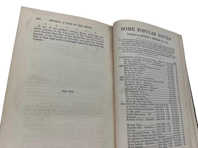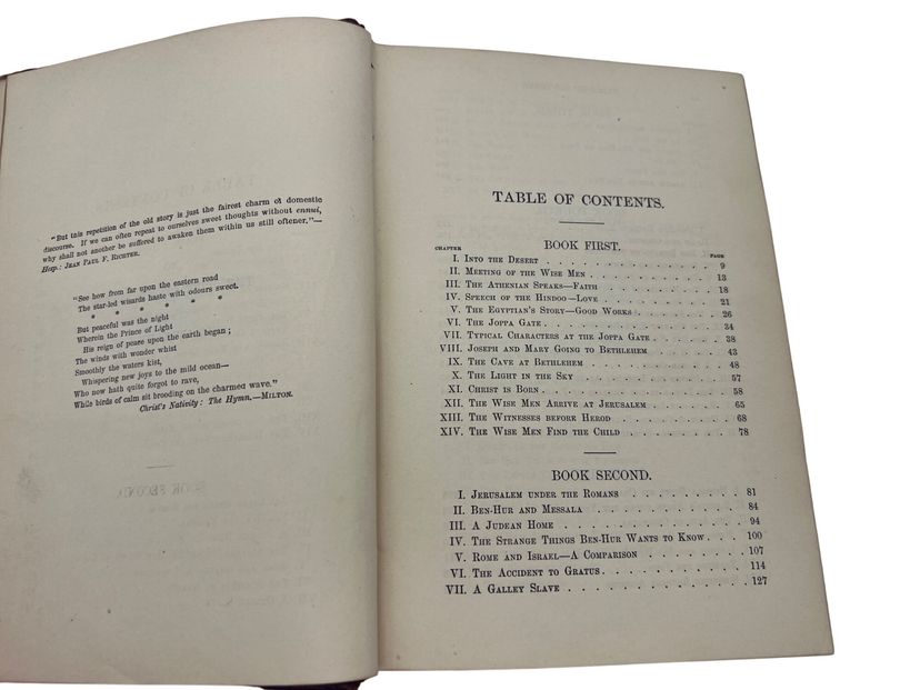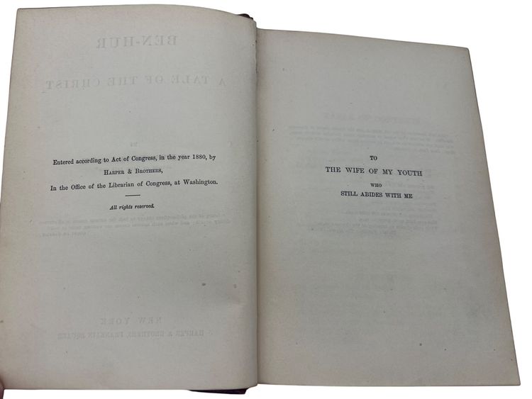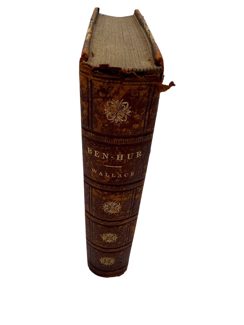 Antique edition of "Ben-Hur: A Tale of the Christ" by Lew Wallace, published in 1880 by Harper & Brothers. Hardcover features a marbled design with leather binding. The book is a historical fiction novel that follows the epic journey of Judah Ben-Hur, a Jewish nobleman in first-century Jerusalem. The novel weaves themes of betrayal, revenge, redemption, and faith, culminating in Ben-Hur's spiritual transformation through his encounters with Jesus Christ.