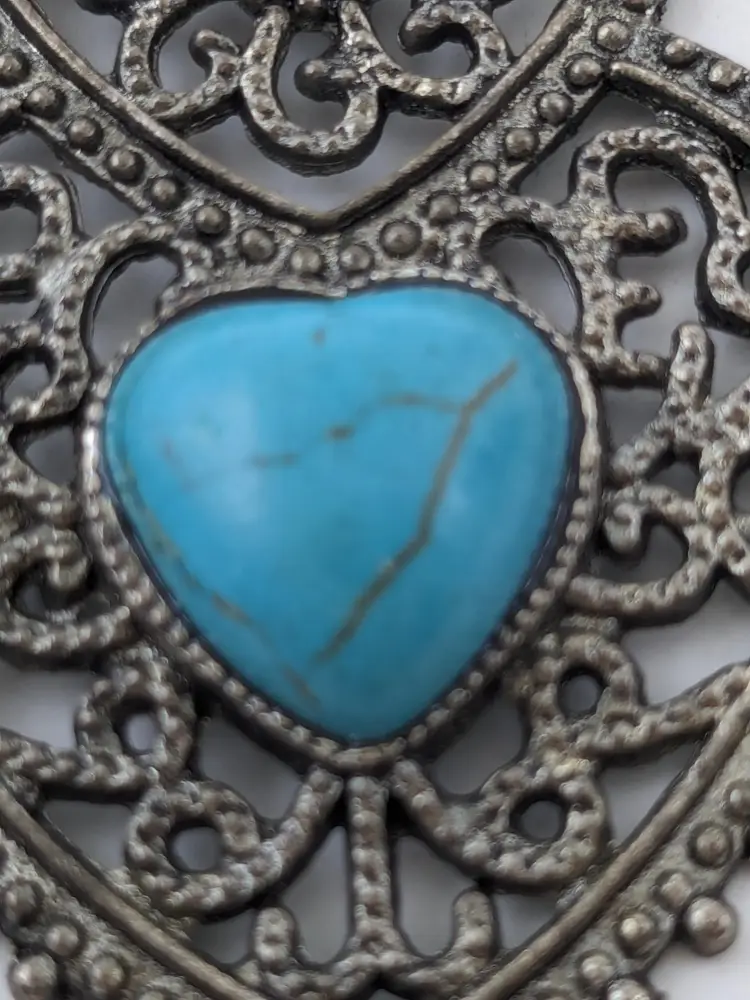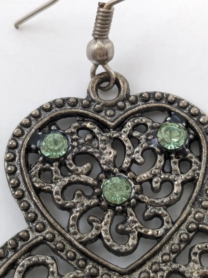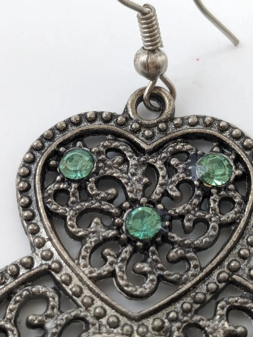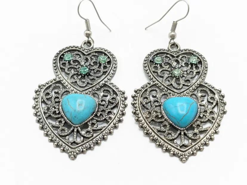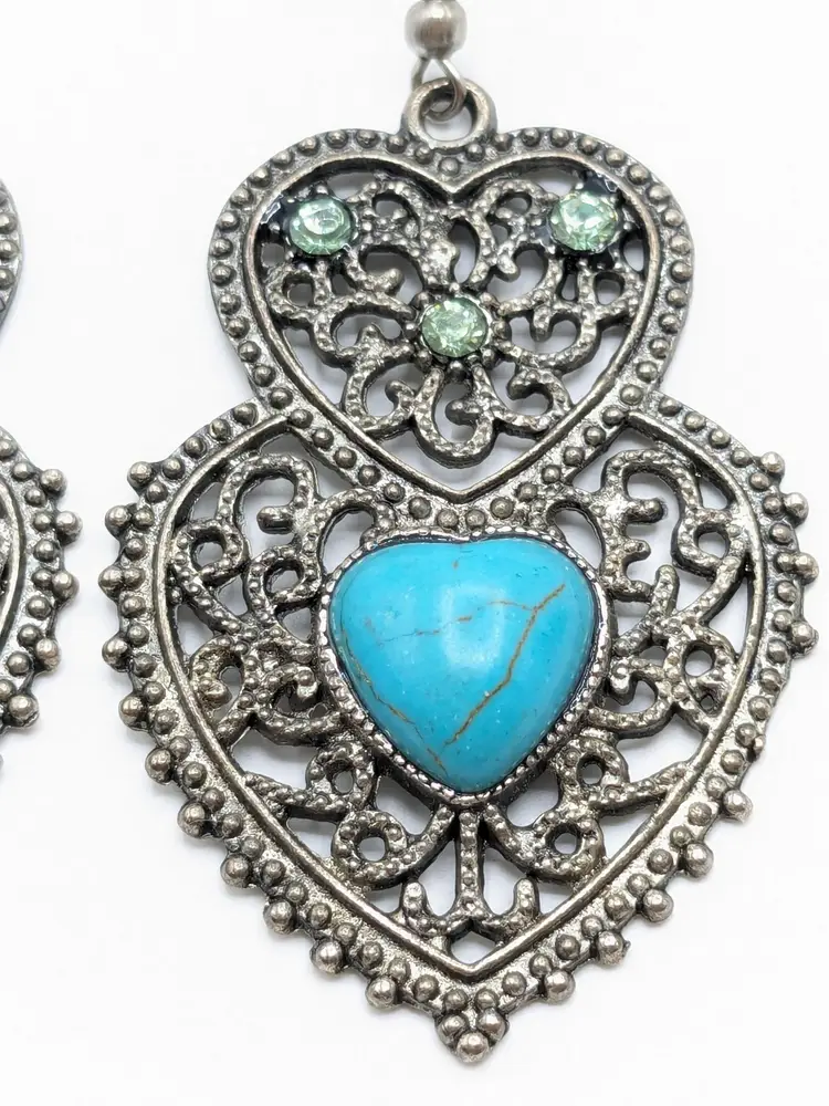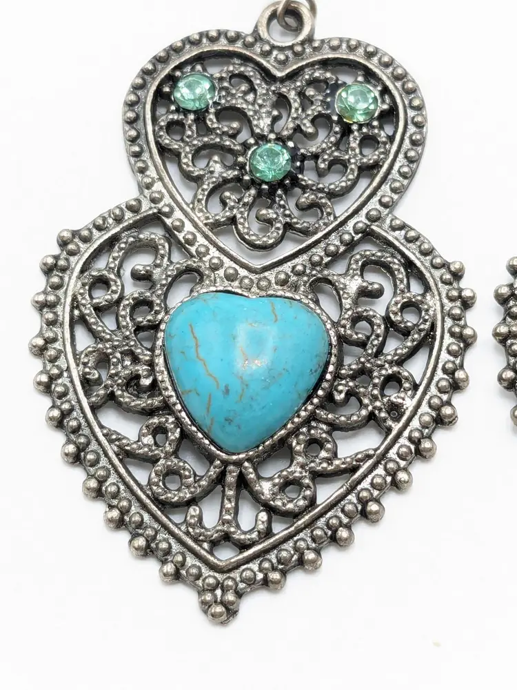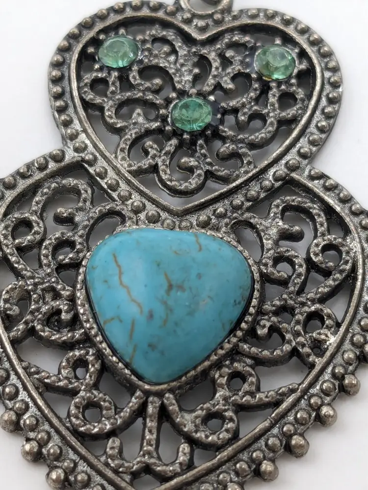 Good condition. Top heart has three green crystals. Bottom heart has faux turquoise. Silver tone. Measures 2 1/2". (EN1)