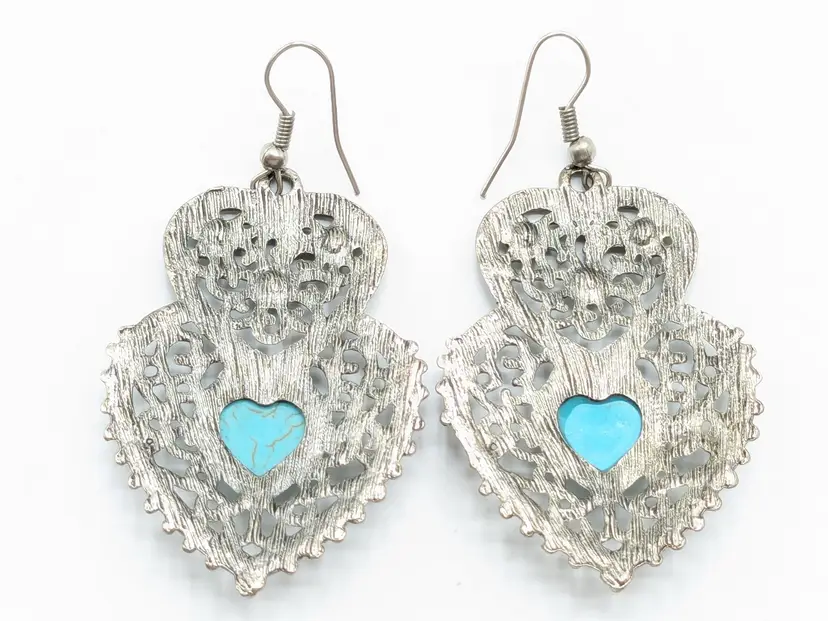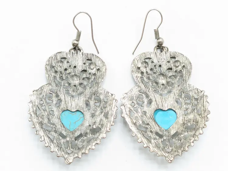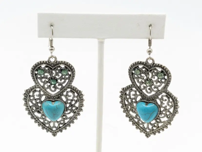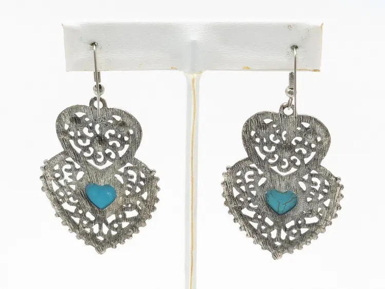 Betsey Johnson Double Heart Turquoise Pierced Drop Earrings Silver Tone