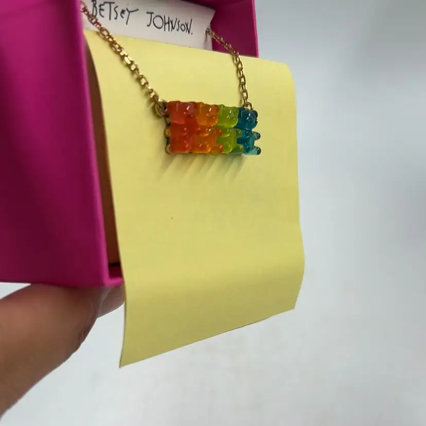 Betsy Johnson Multi Colored Gummy Bear Neckless And Earrings With Original Box. Costume jewelry with a gold tone finish. Is adjustable to shorten the length. The little red gummy bear has a manufacturing flaw he has a little piece sticking out.