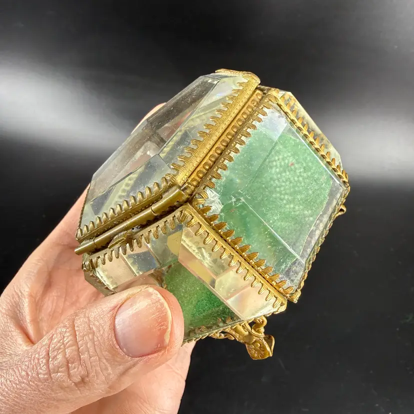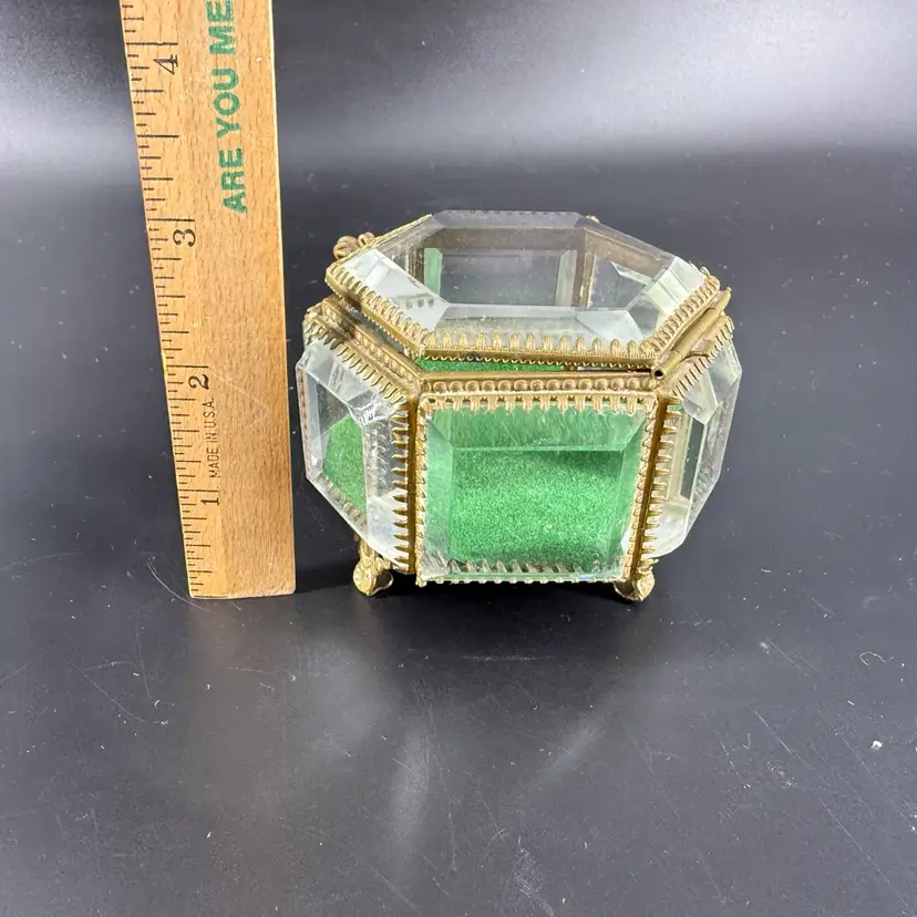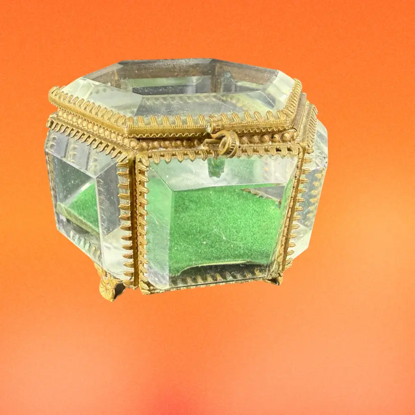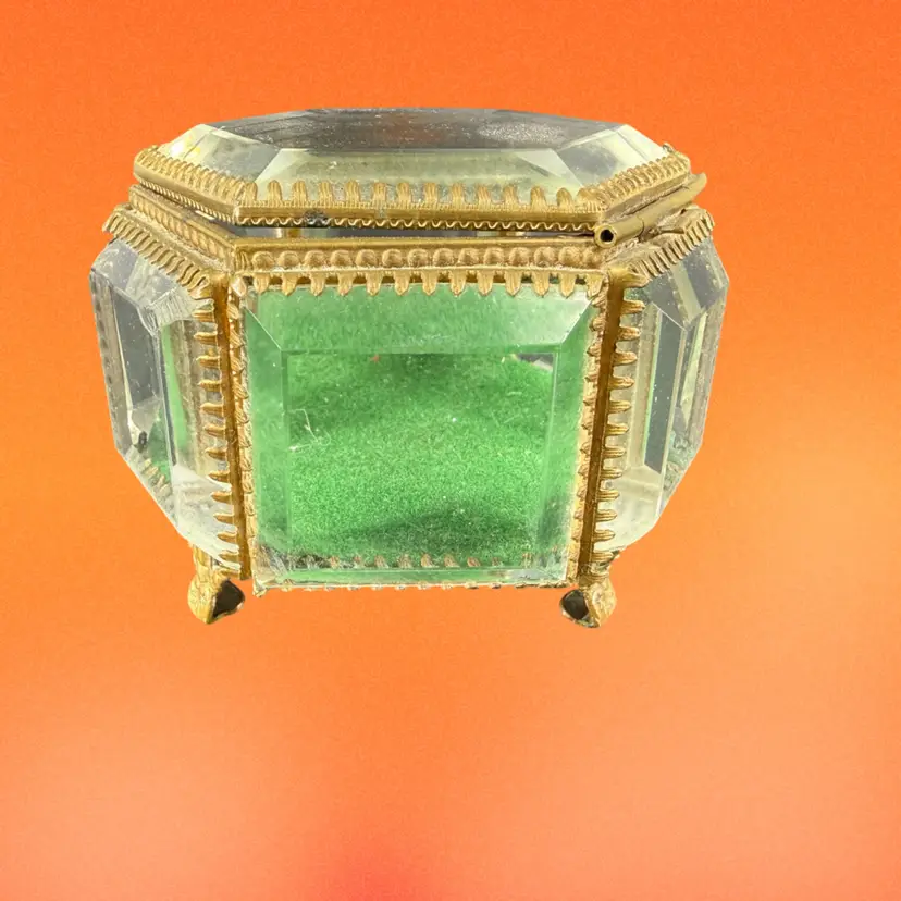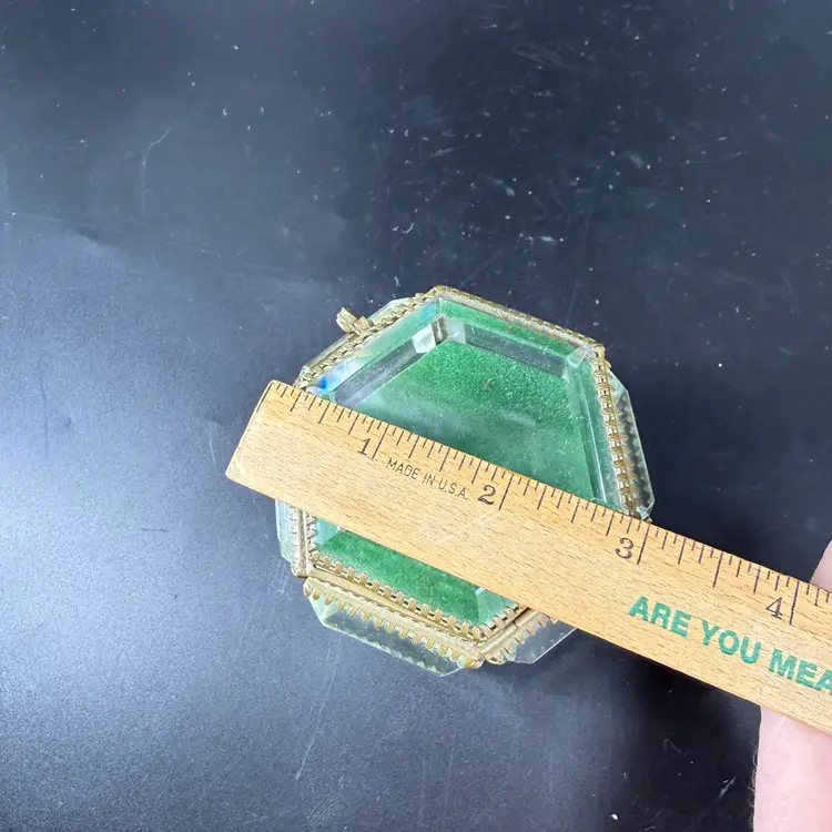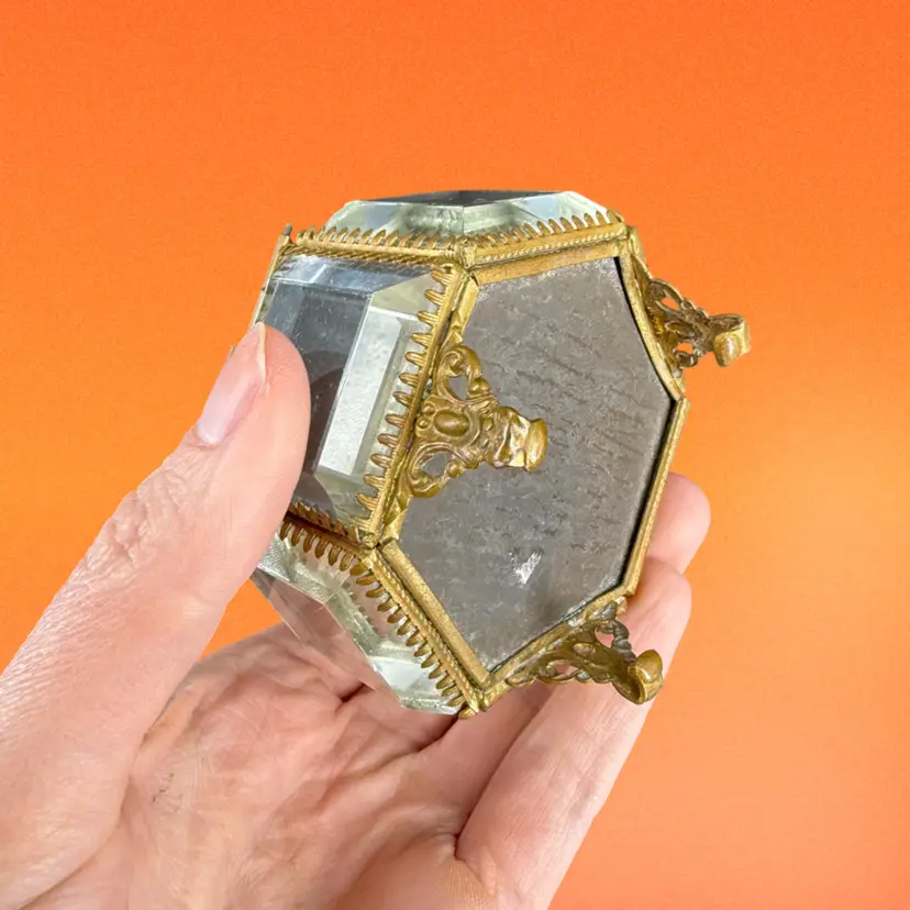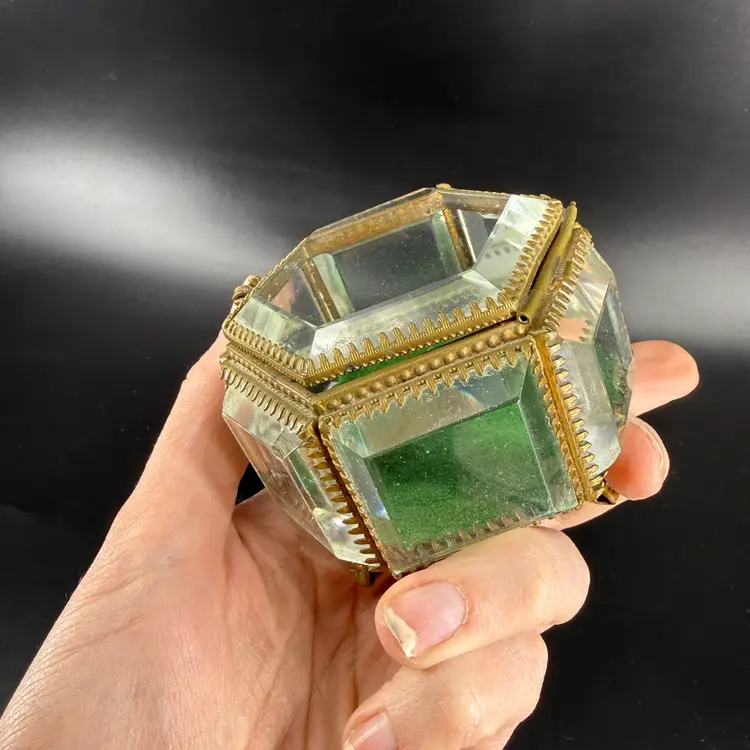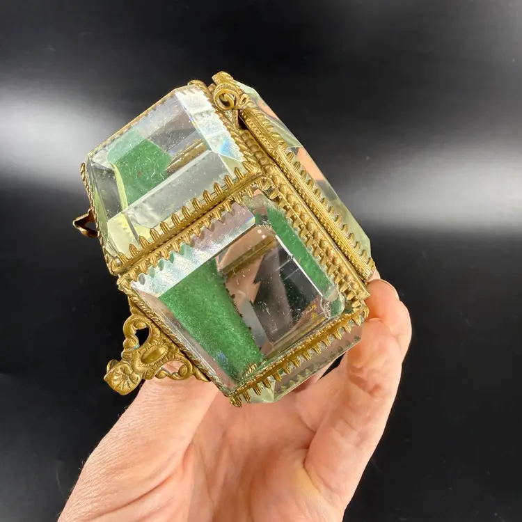 This beveled glass casket box is being sold as is do to chipping on the corners. It measures approx 3” wide.