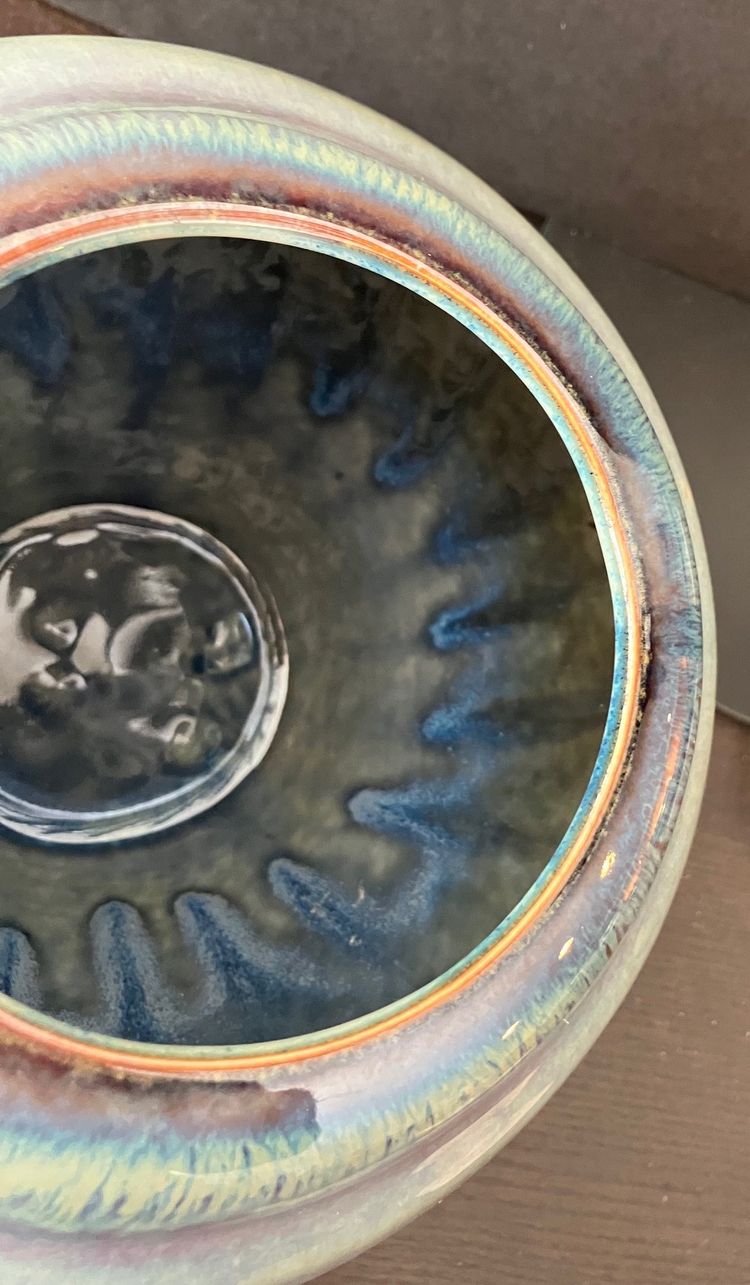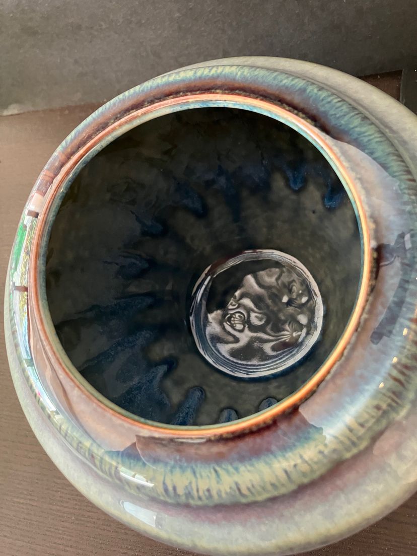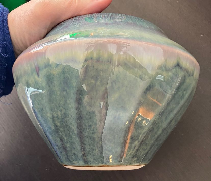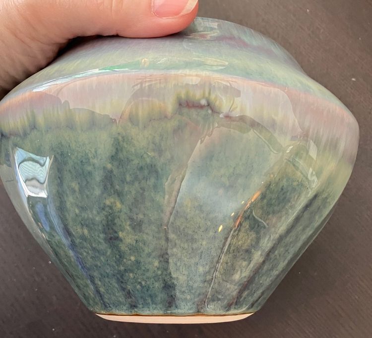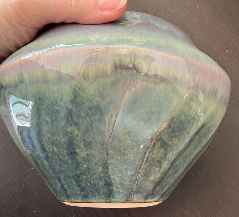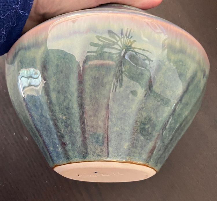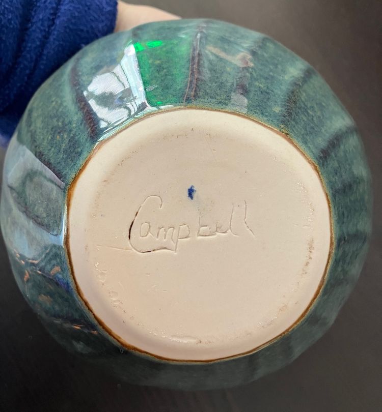 Beautiful. No condition issues. Signed "Campbell" on the bottom. Since this does not have the classic Campbell signature but looks exactly like a Bill Campbell item, I contacted a Bill Campbell Facebook group and they said that sometimes a Bill Campbell employee signs the bottom when items are taken out of the kiln. Measurements: 5" tall and 7" at its greatest diameter.