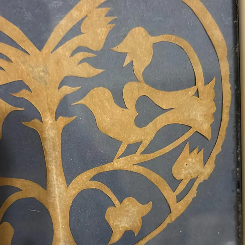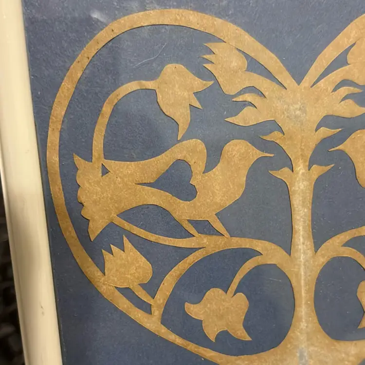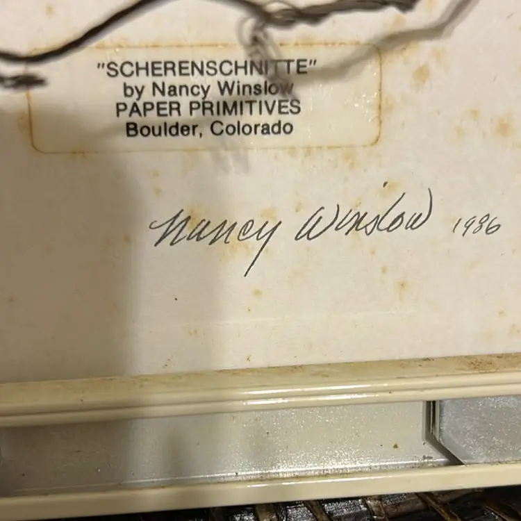 This is a framed piece of Scherenschnitte (German for "scissor cuts") folk art, a traditional form of paper cutting. The artwork features a symmetrical design of a tree with birds and tulips within a heart shape. This style of paper cutting is a rich heritage of the Pennsylvania Dutch community in the United States. The piece appears to be vintage and is signed with Nancy Winslow at the bottom of the design. It is a form of decorative art often used for valentines or home decor.