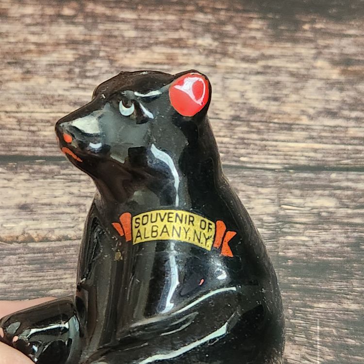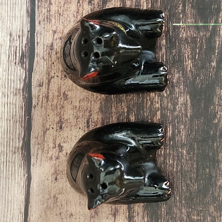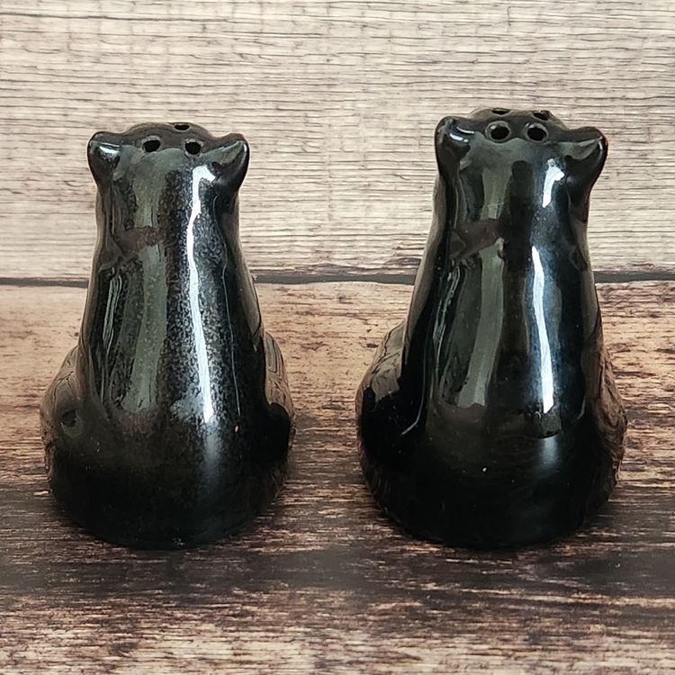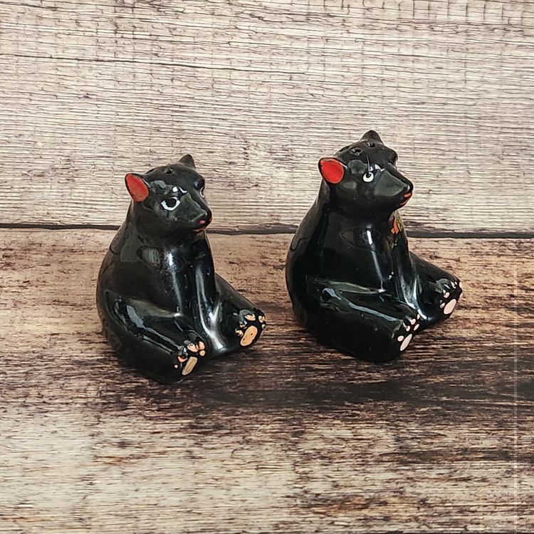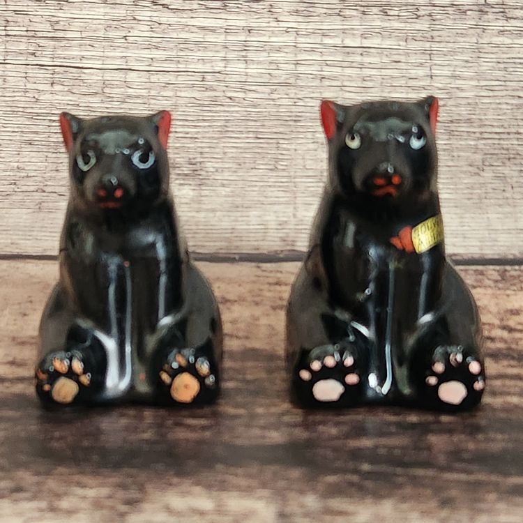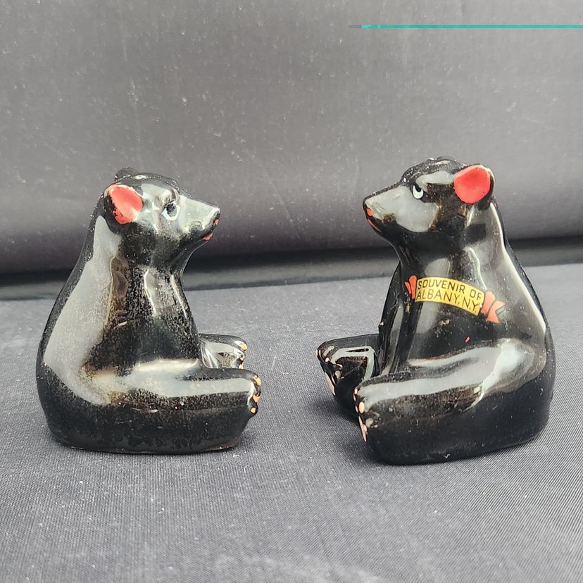Cute kitschy black bear salt & pepper set, made in Japan. Probably from the 1960s, these have their original corks. One has a banner that says "Albany, NY" and one is missing his - makes it easier to tell salt from pepper that way. If you don't like the banner it can be easily removed. These came from the estate of a collector and I think they were a display piece only.