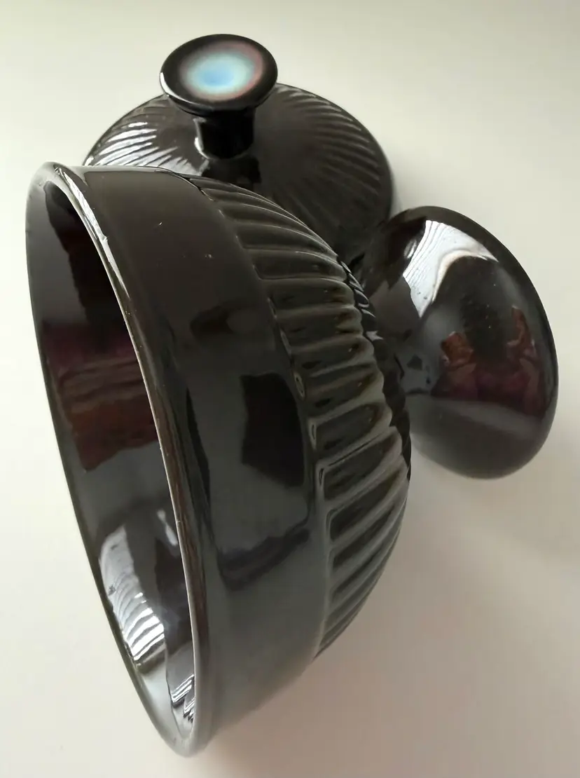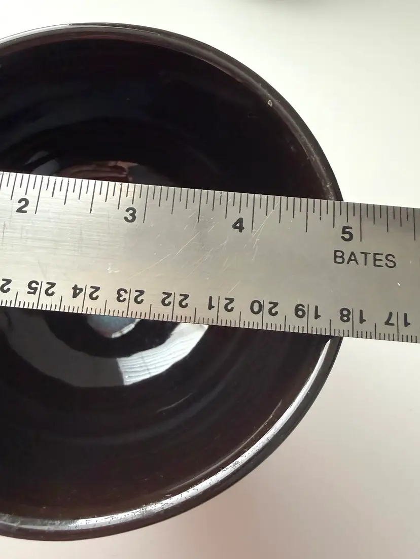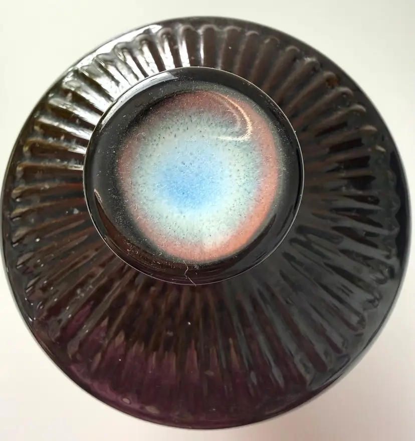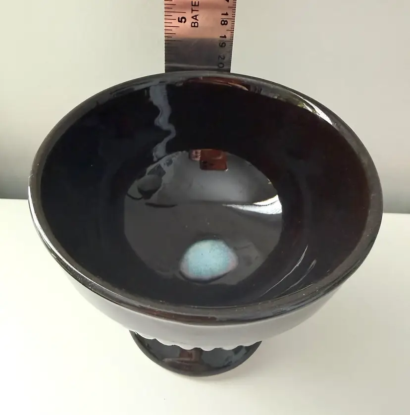 Appears to ceramic, but no matter what, this candy dish is cute. Elegant shape with just a little bit of blue to set it apart.