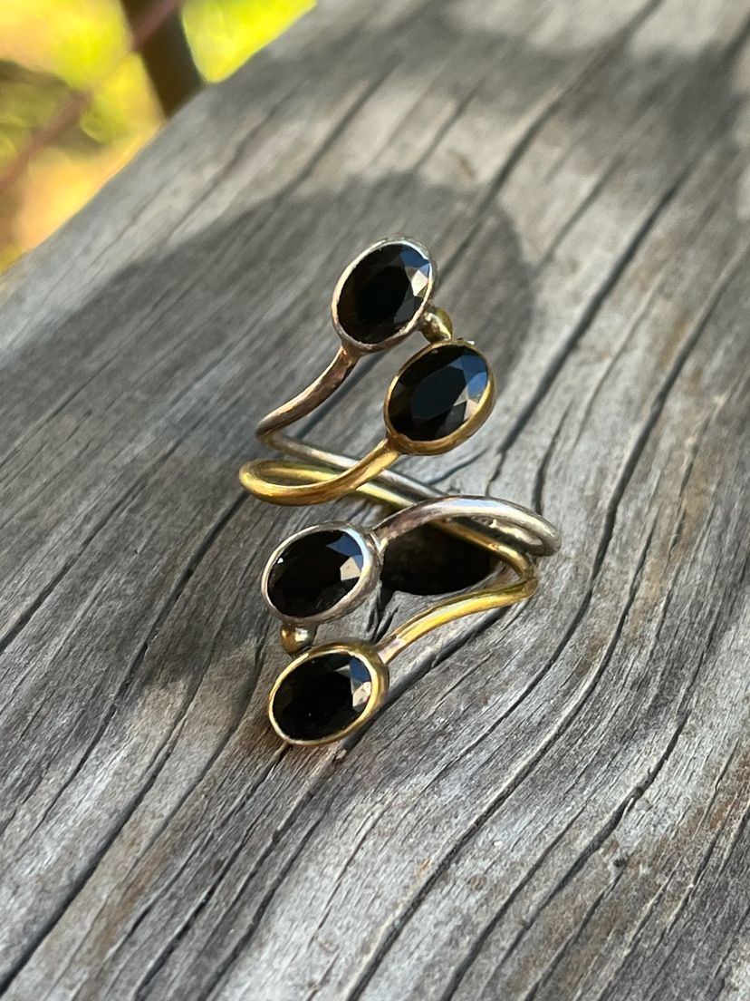 A beauty! A Black Obsidian ring. A combination of brass and silver. It is somewhat adjustable due to its design. As it sits right now it is for a size 8 1/2. It could be squeezed to allow a size 8 or expanded to a size 9. Vintage. New old stock.
