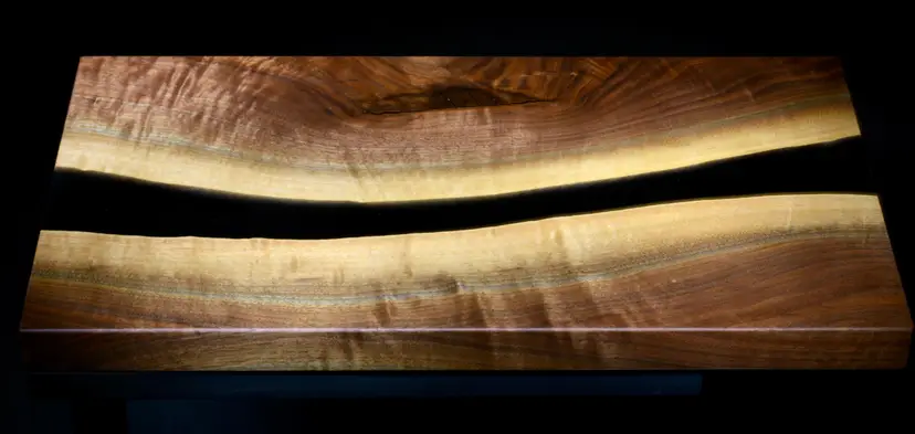 A slim silhouette with the same “river” drama as a full-size table. Crafted from American Black Walnut, the top is book-matched around a jet-black epoxy resin channel that flows the full 21-inch length. The contrast amplifies the curl, sapwood glow, and chatoyance in the grain while locking the two halves together for life.