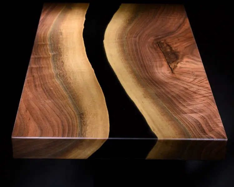 SPECIFICATIONS Dimensions: 21″ L × 11″ W × 25.5″ H Weight: ~13 lb Wood Species: Black Walnut - native Black Walnut Base: Steel Powder-Coated Epoxy Resin Details: UV-stable, pigment-rich black river between slabs