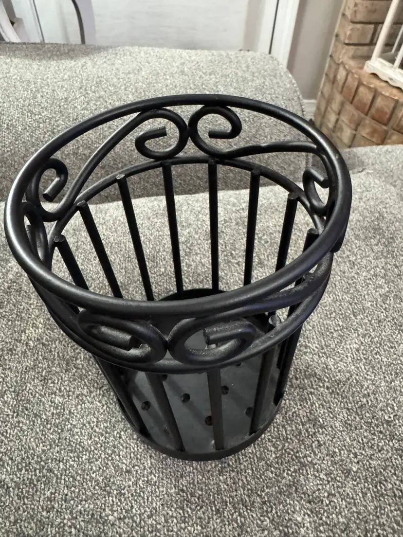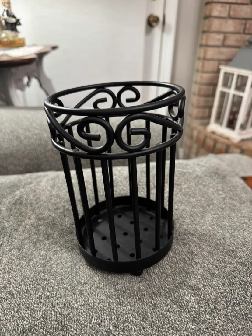This wrought iron utensil holder can hold utensils or large glass jar candles. 5” X 7”