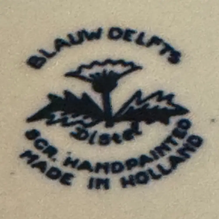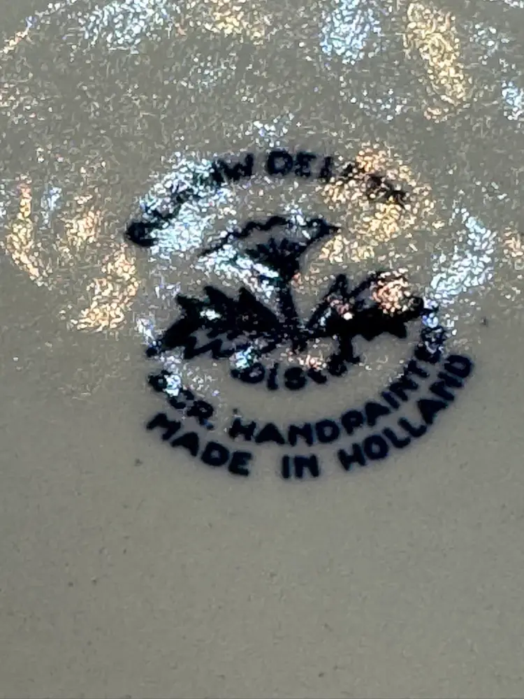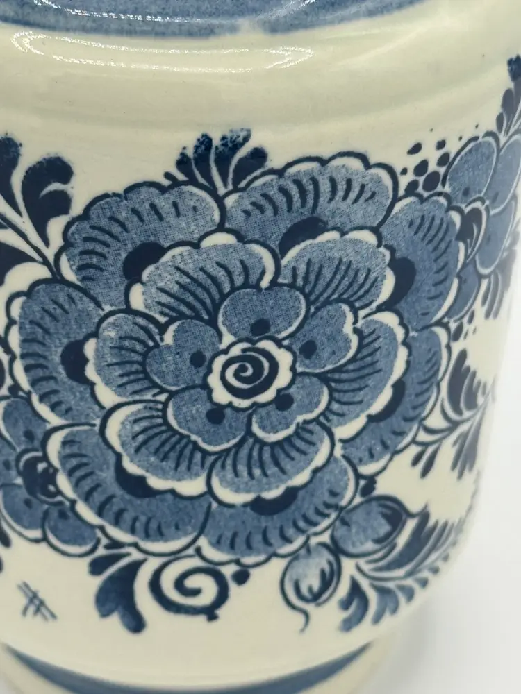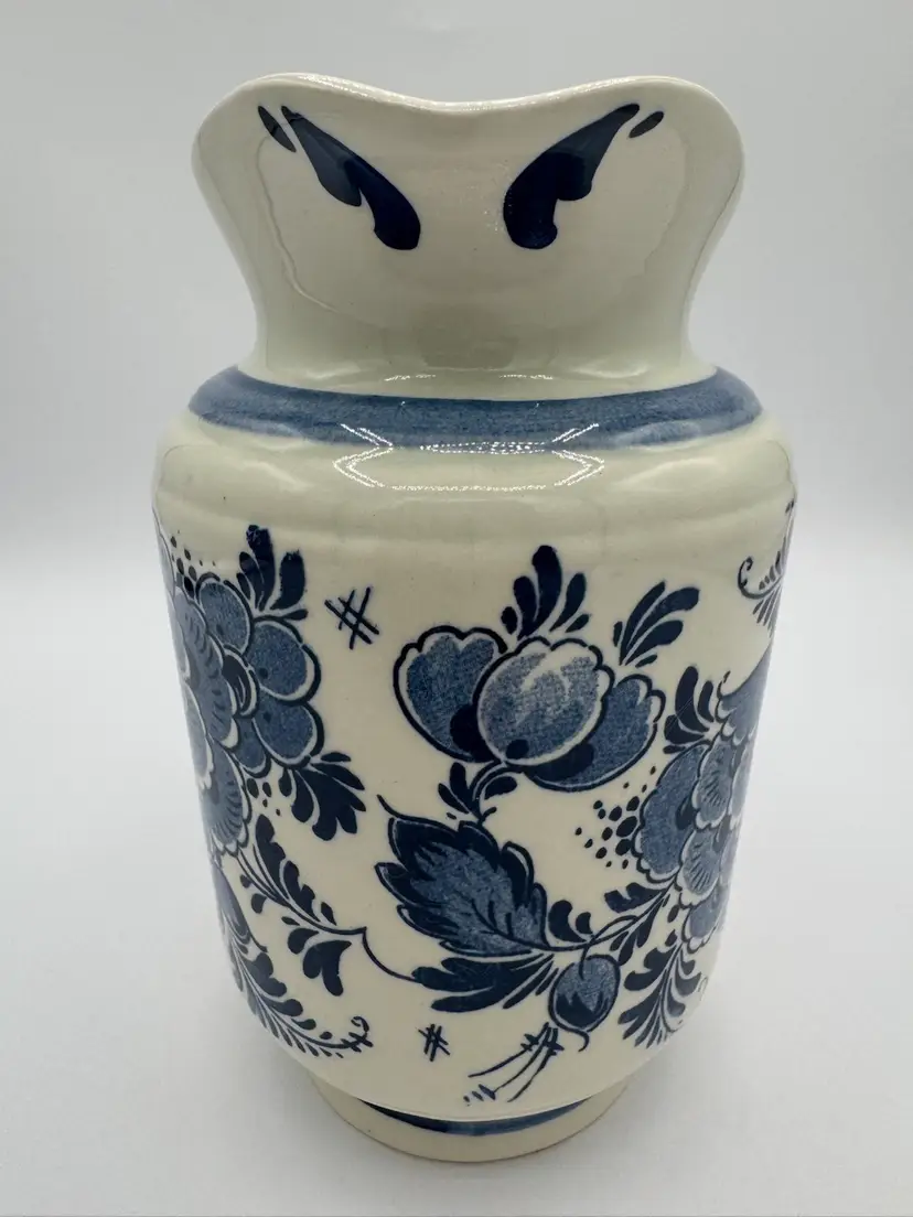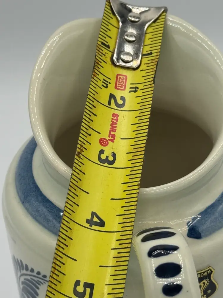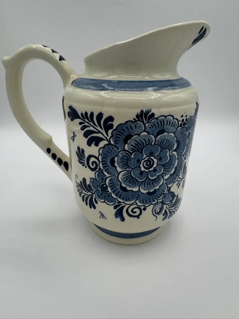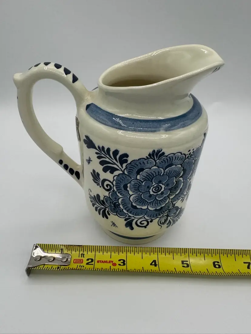 This Delftware pitcher is 6” in height and 6” wide with a 3 1/2” opening. It has the original sticker on the side and is marked on bottom. In excellent condition with no chips or cracks.
