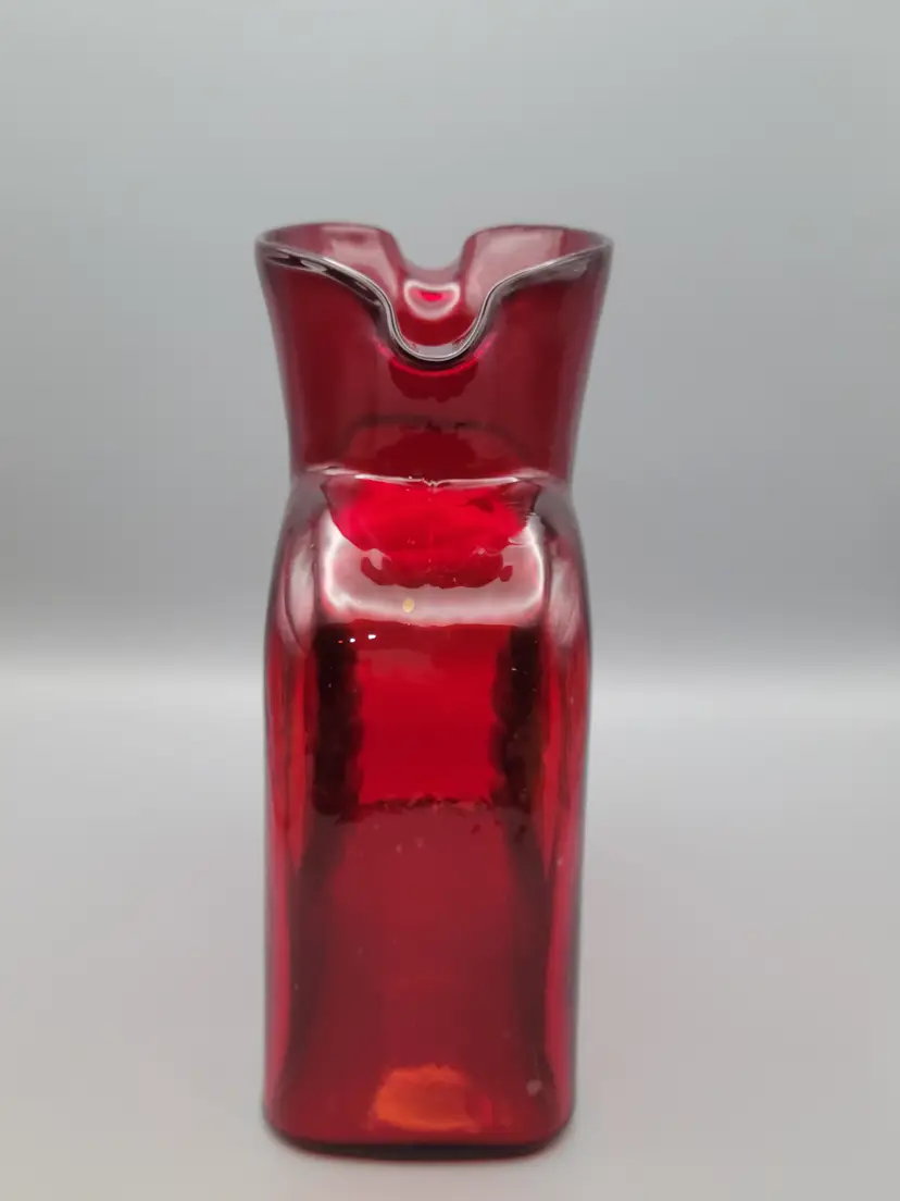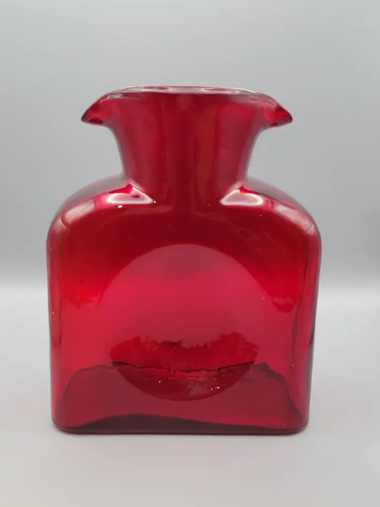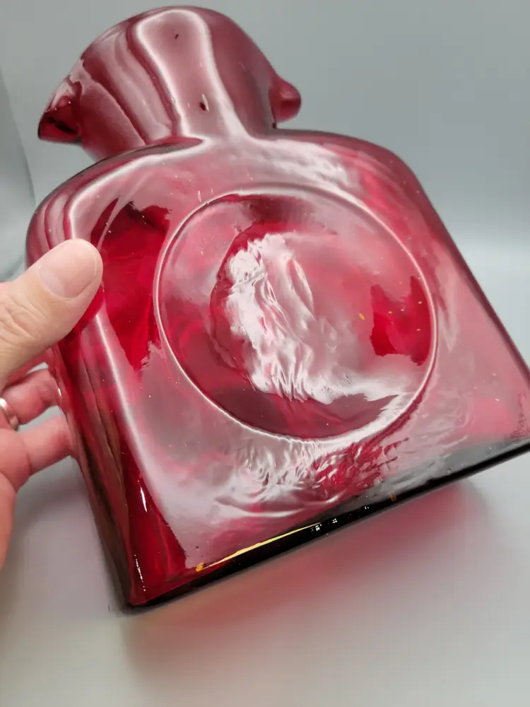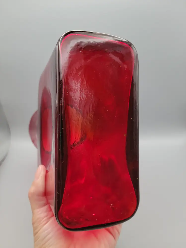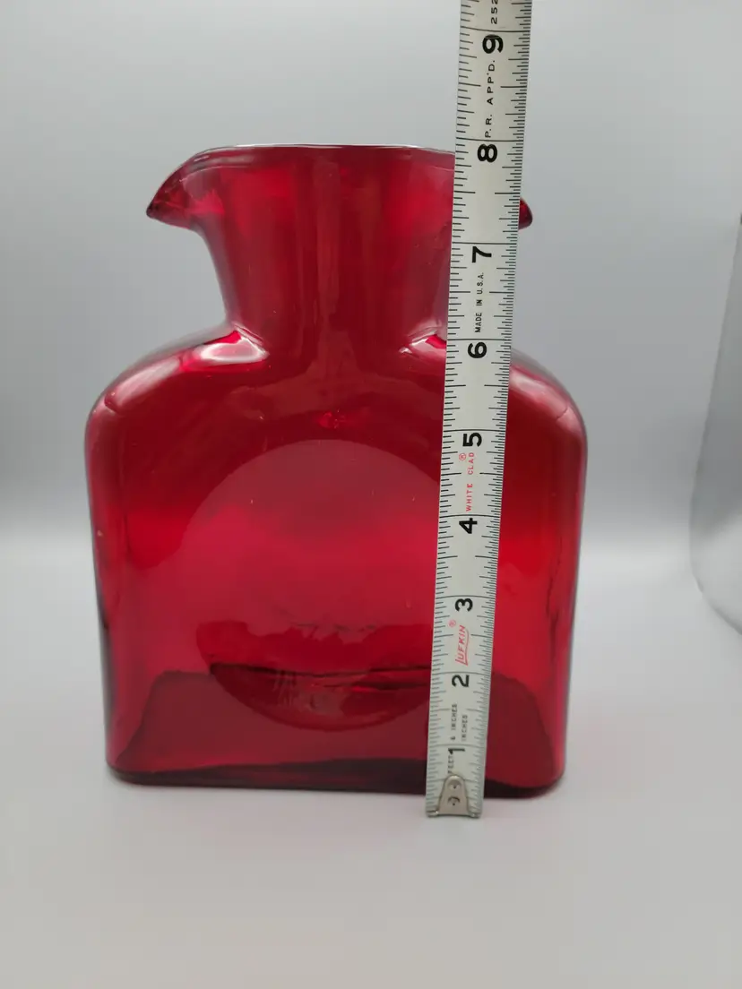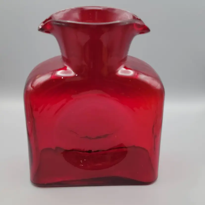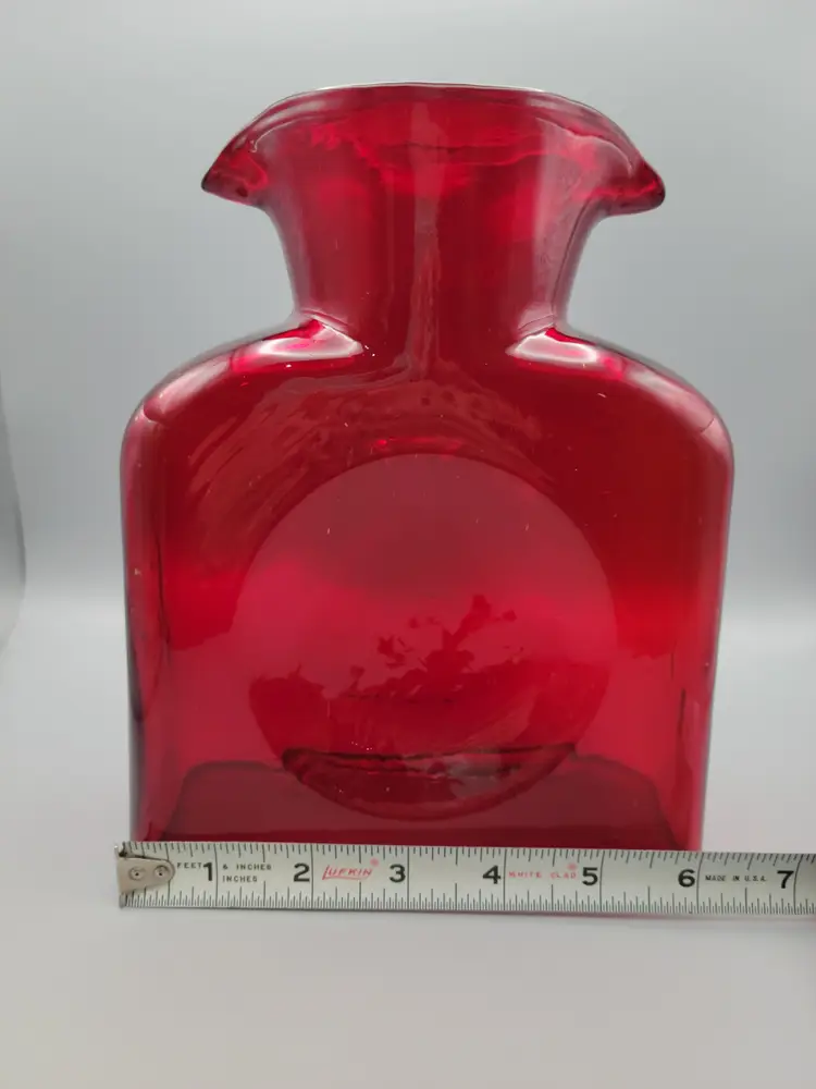 This beautiful deep ruby red water bottle is unmarked and does not have a sticker. It is in good condition with no chips or cracks, but unfortunately does have surface scratches as seen in picture. Measures 8 inches tall, 6 inches wide, 3 inches deep and is slightly heavier than my other Blenko water bottles weighing 2 lbs 9.6 oz. Thank you for looking and have a great day!