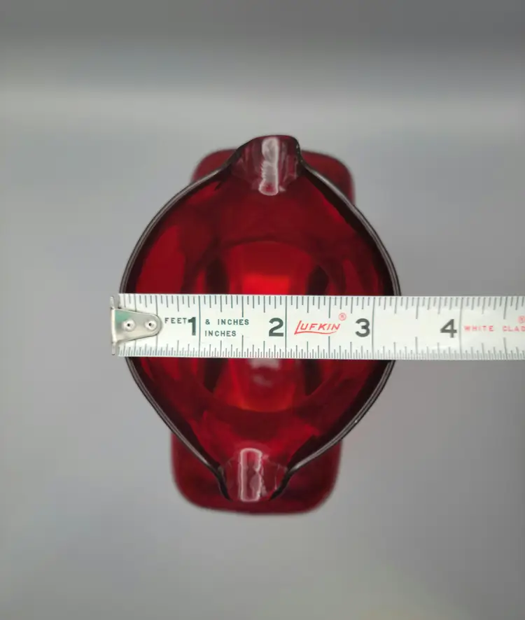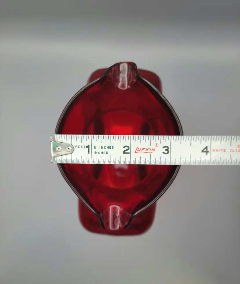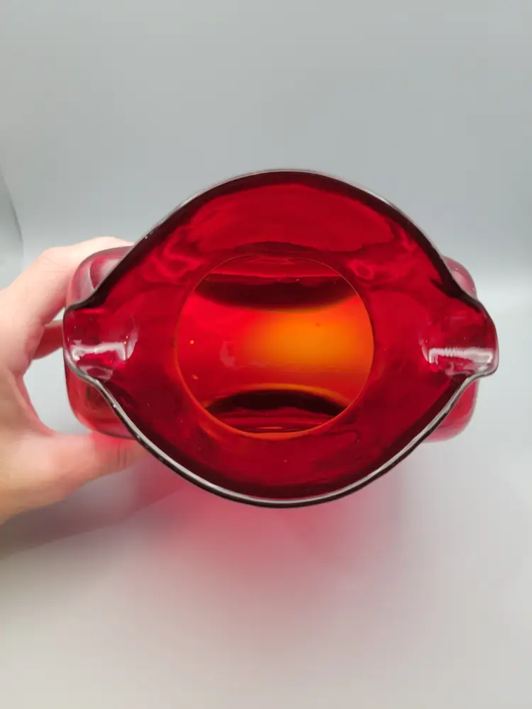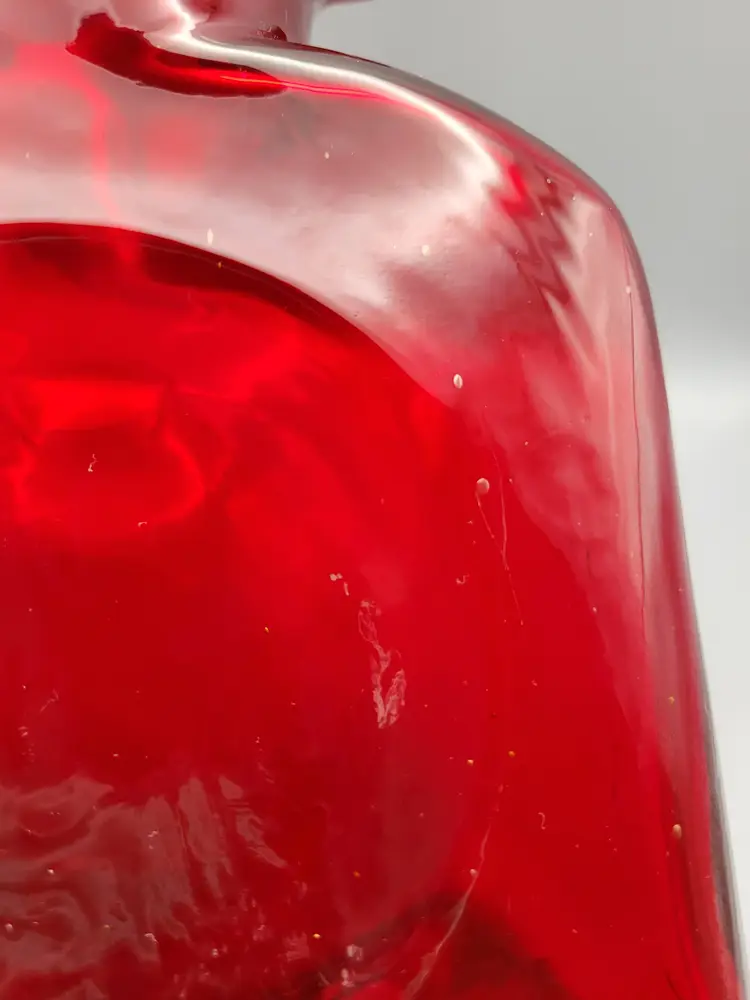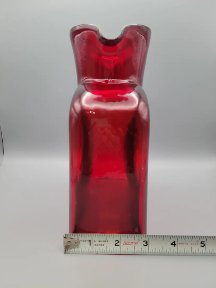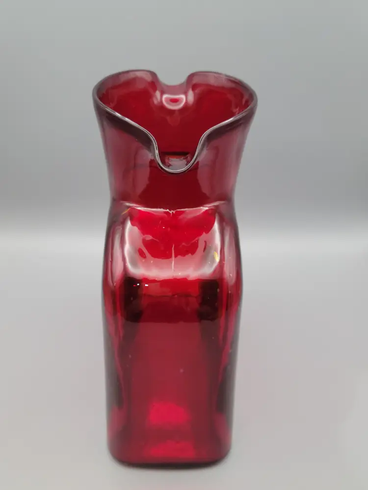 This beautiful deep ruby red water bottle is unmarked and does not have a sticker. It is in good condition with no chips or cracks, but unfortunately does have surface scratches as seen in picture. Measures 8 inches tall, 6 inches wide, 3 inches deep and is slightly heavier than my other Blenko water bottles weighing 2 lbs 9.6 oz. Thank you for looking and have a great day!
