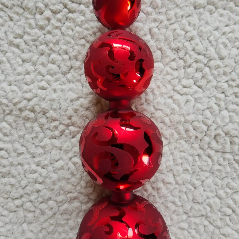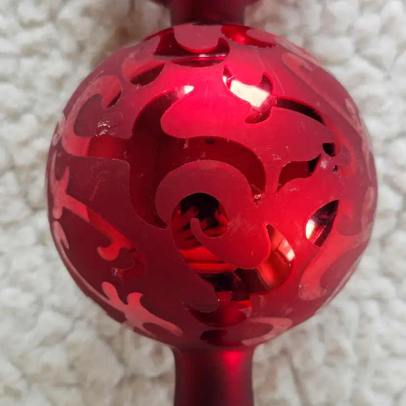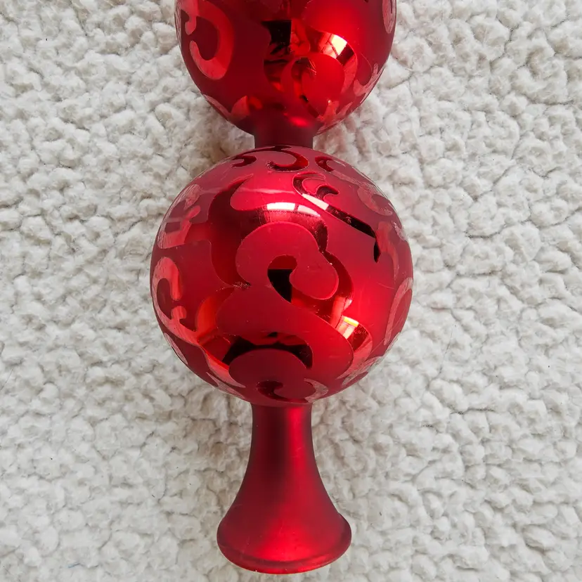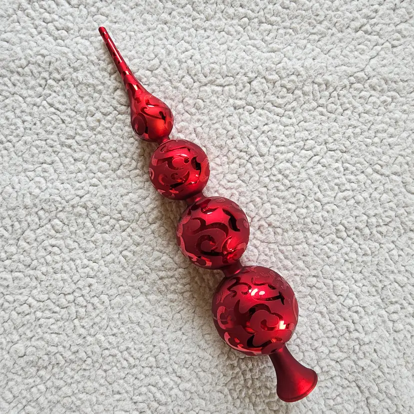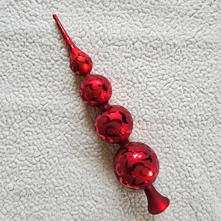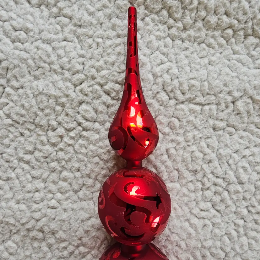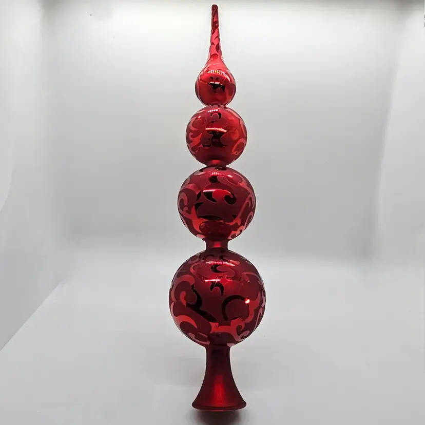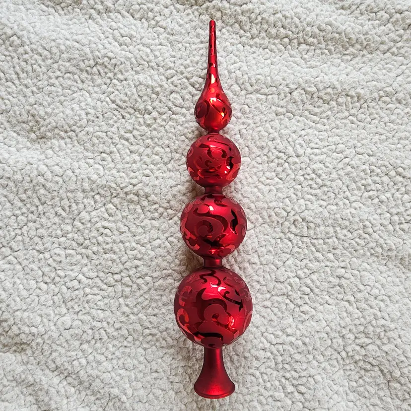 This Blown Glass Finial Christmas Tree Topper is a large, 16" tall ornament in a vibrant red color. The swirl pattern and handmade design add a touch of elegance to your holiday decor. This tree topper is perfect for adding a festive finishing touch to your Christmas tree, making it a beautiful and unique addition to your collectibles. Made from glass and embellished with intricate details, this original piece is sure to be a standout feature in your holiday display.