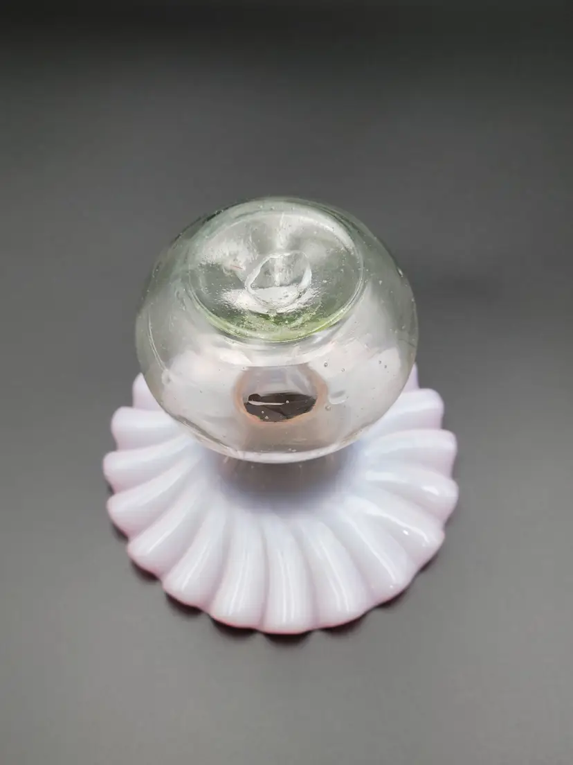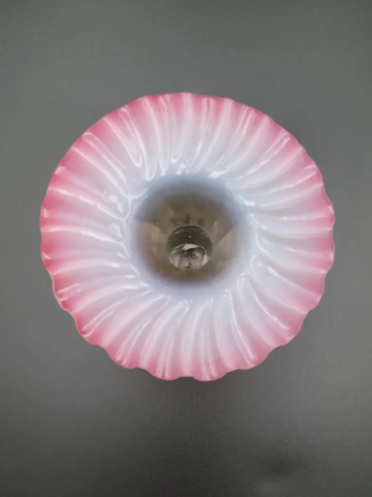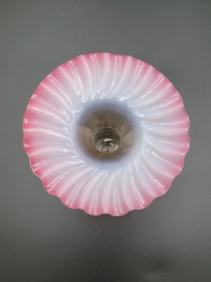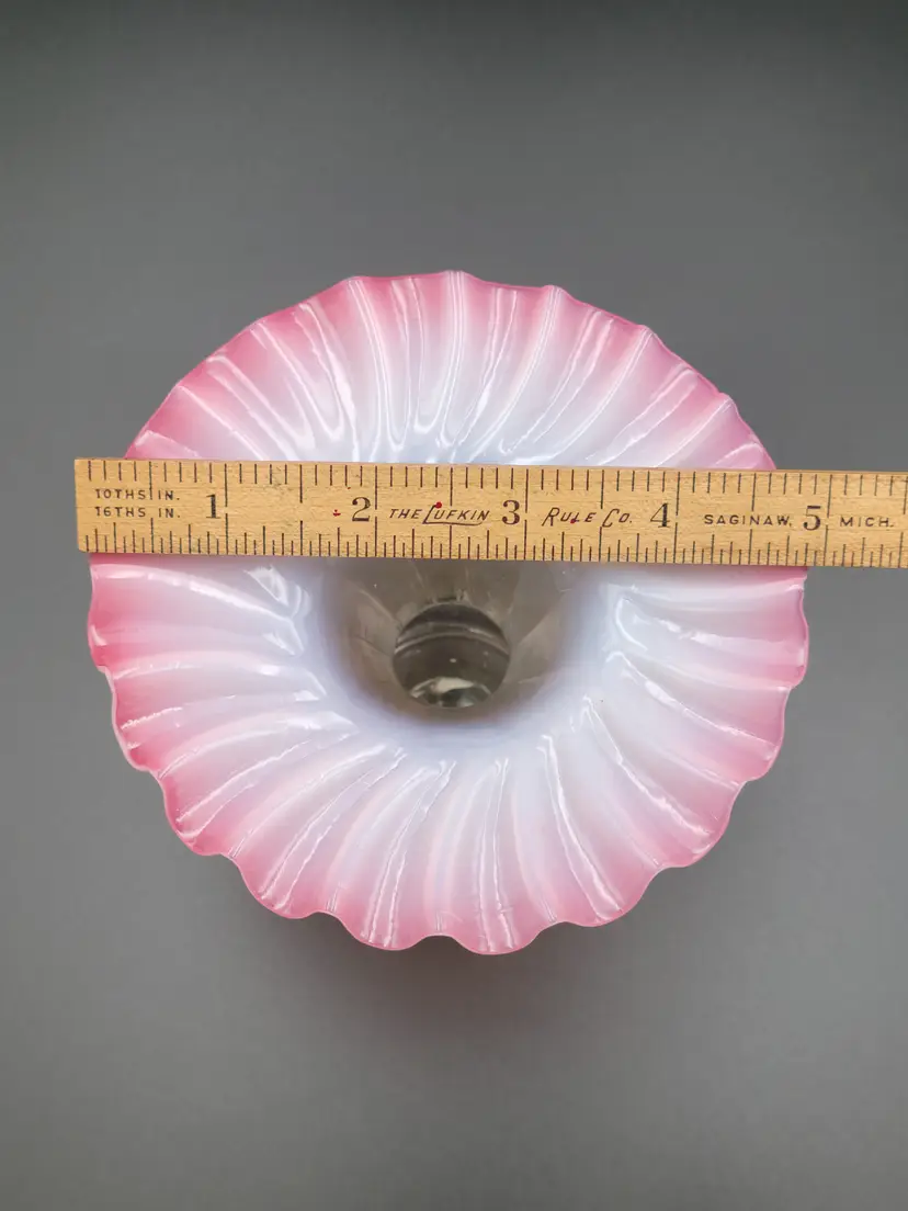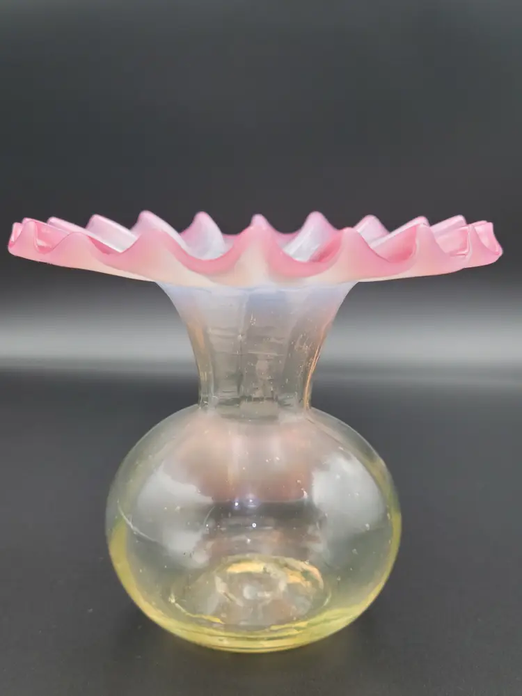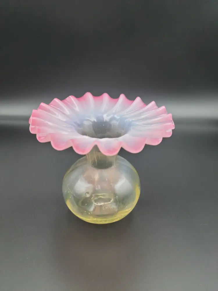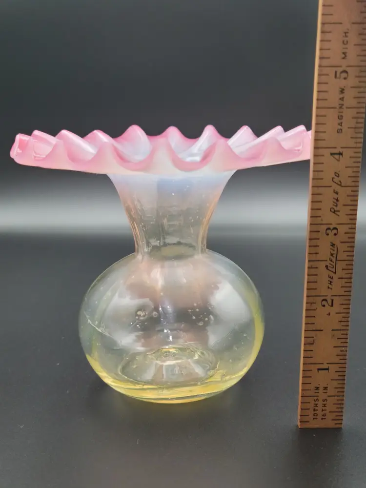 Handmade cranberry opalescent ruffled edge and vaseline glass vase that has a bright brilliant glow . Measures approximately 4 inches Tall and 5 inches across the top. The pontil is rough, No Chips Or Cracks, but has bubbles and imperfections in the glass. Thank you for looking and have a great day!