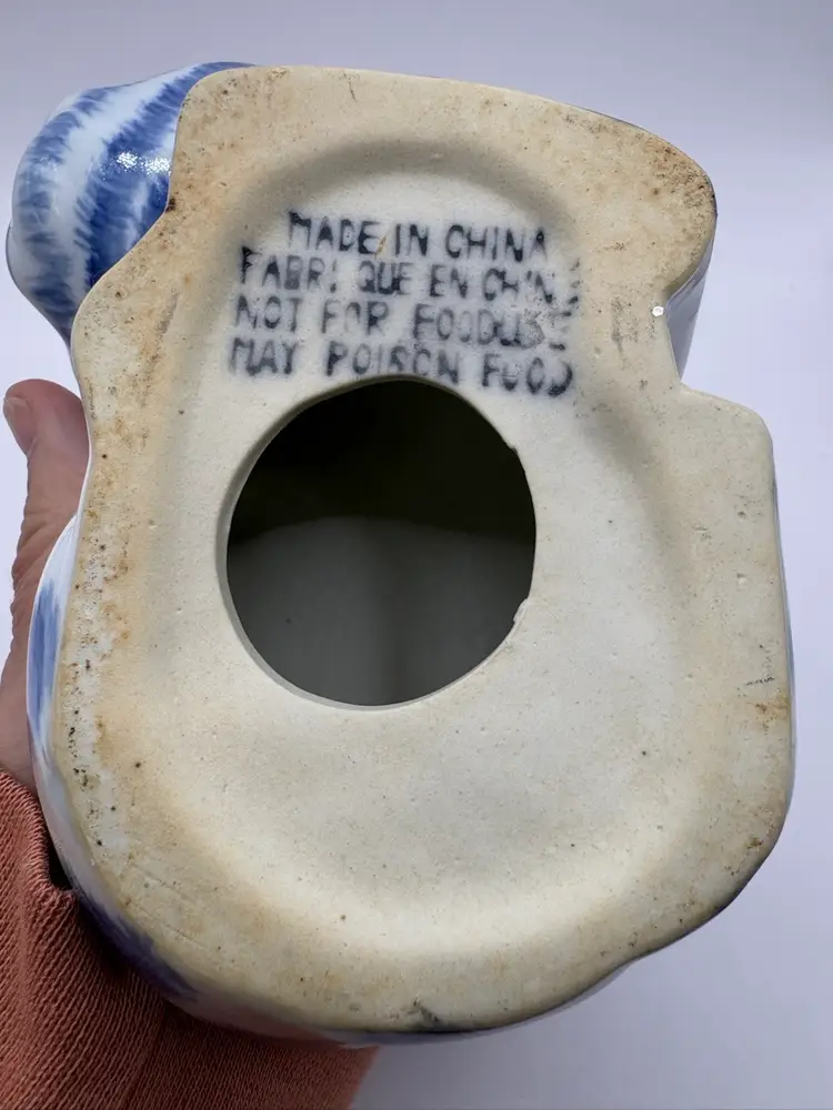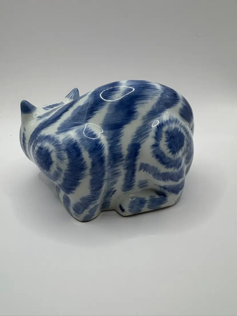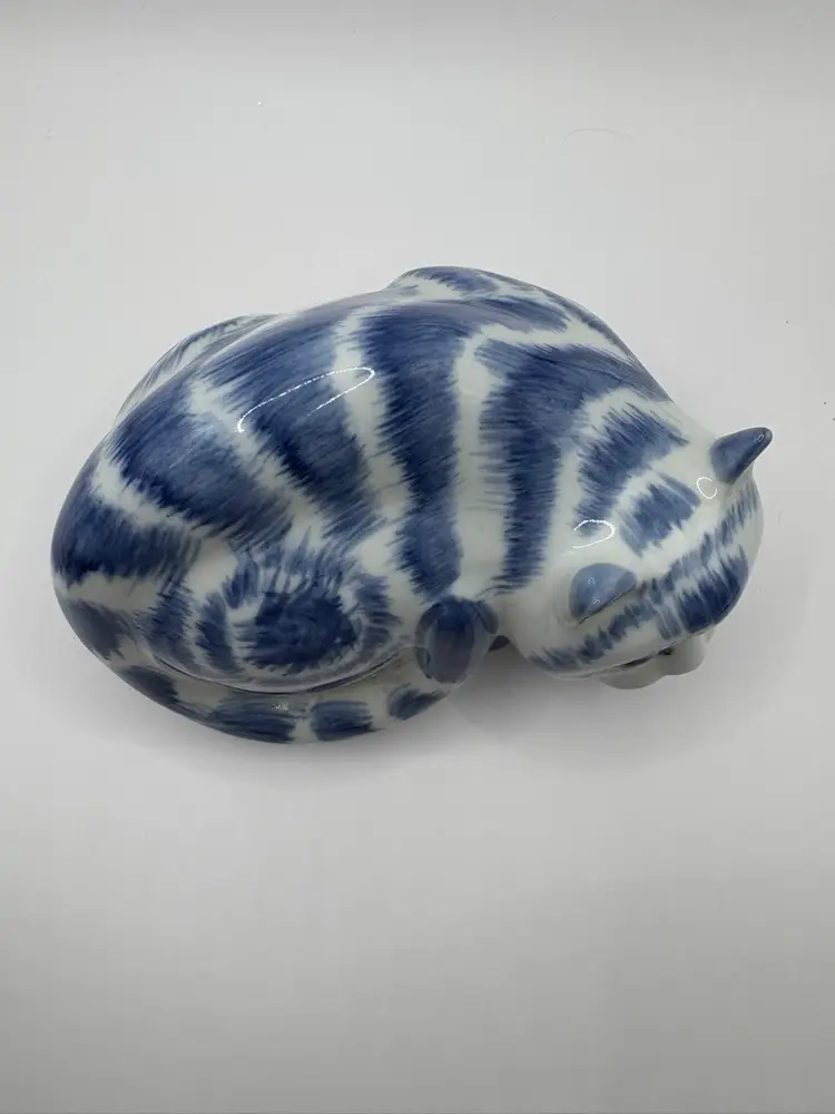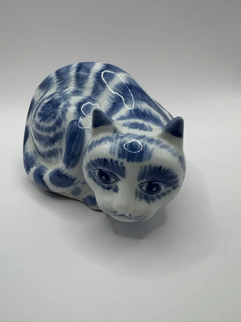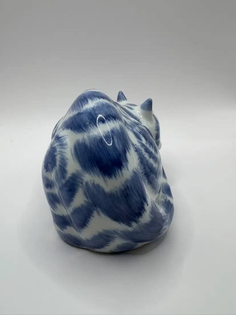 Blue and white Chinese Cat Measures 5 1/4 inches long by 3 1/2 inches at tallest Warning on bottom includes “Not for food use. May Poison Food” because one serves food on a figurine.. lol No chips or cracks