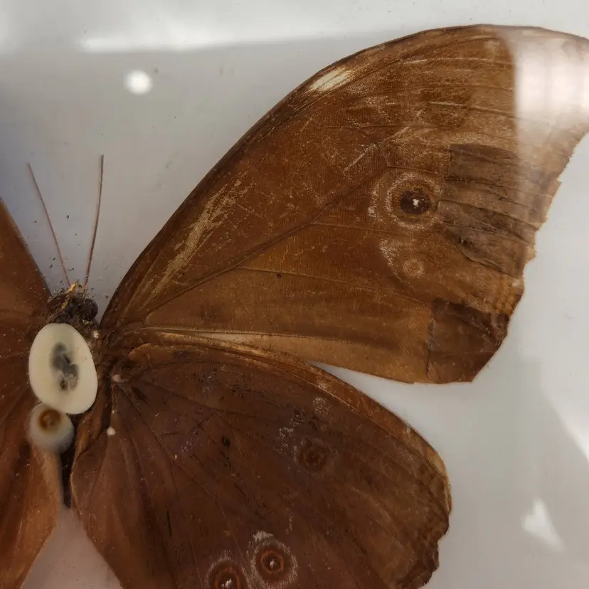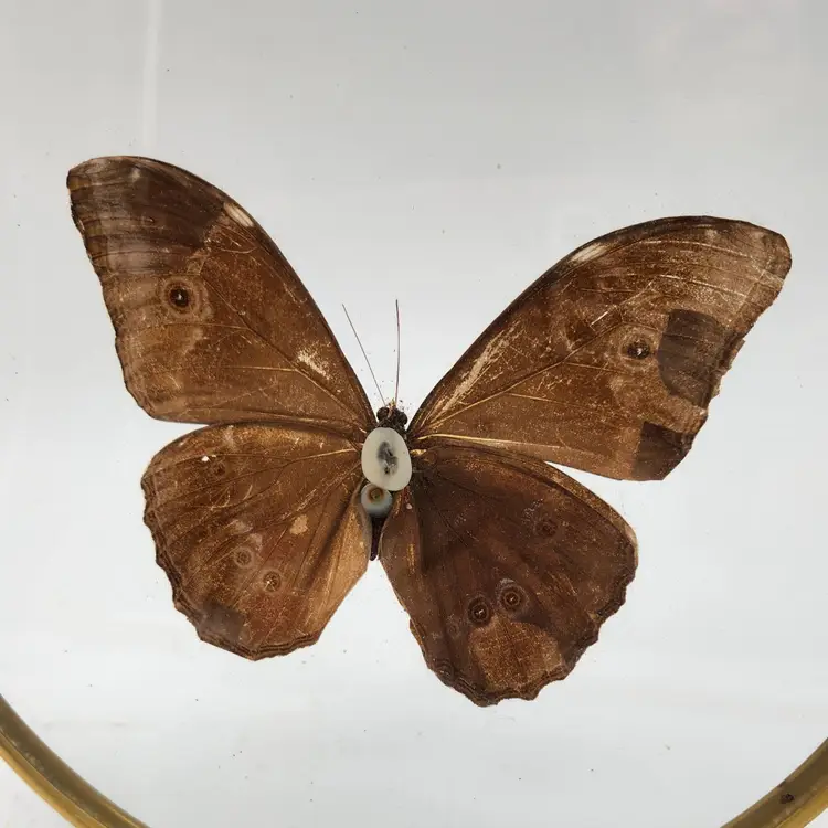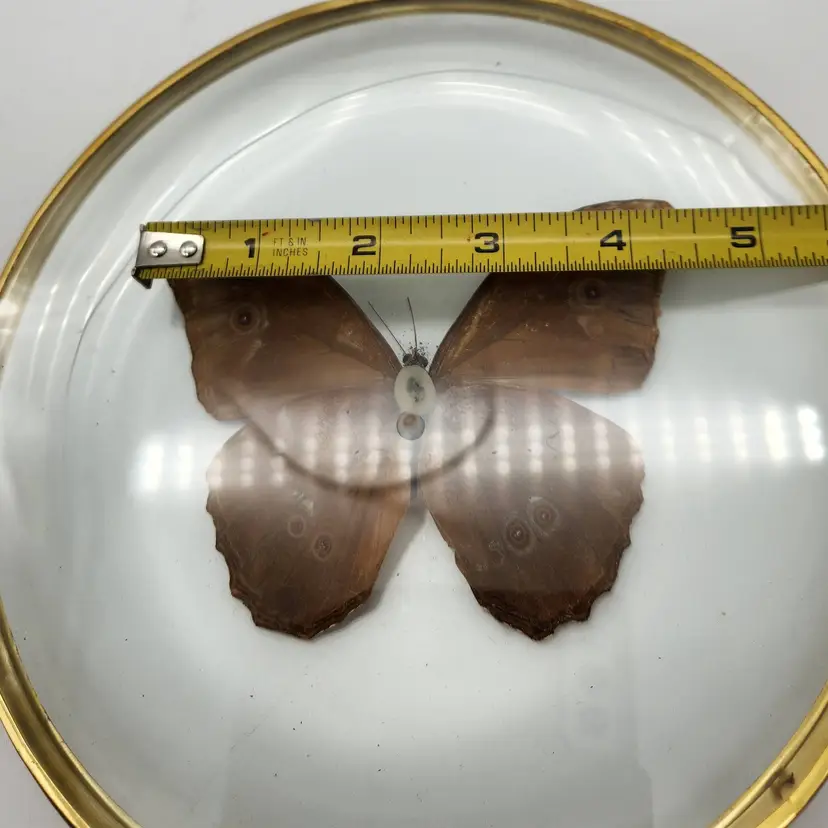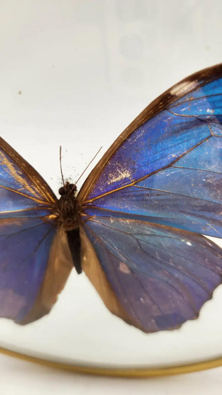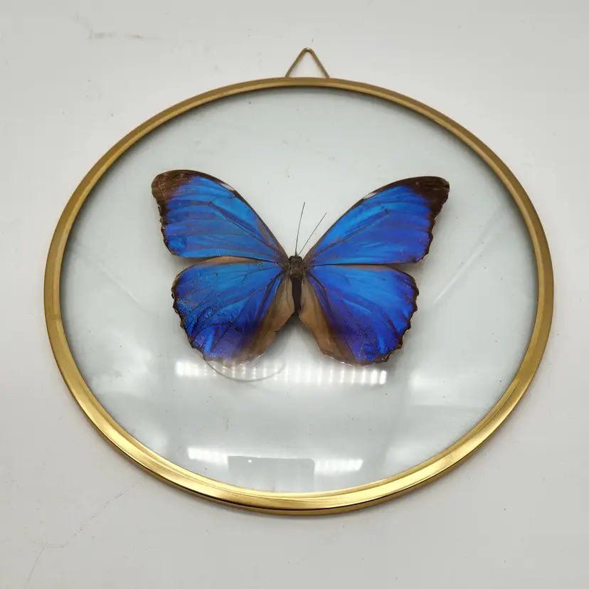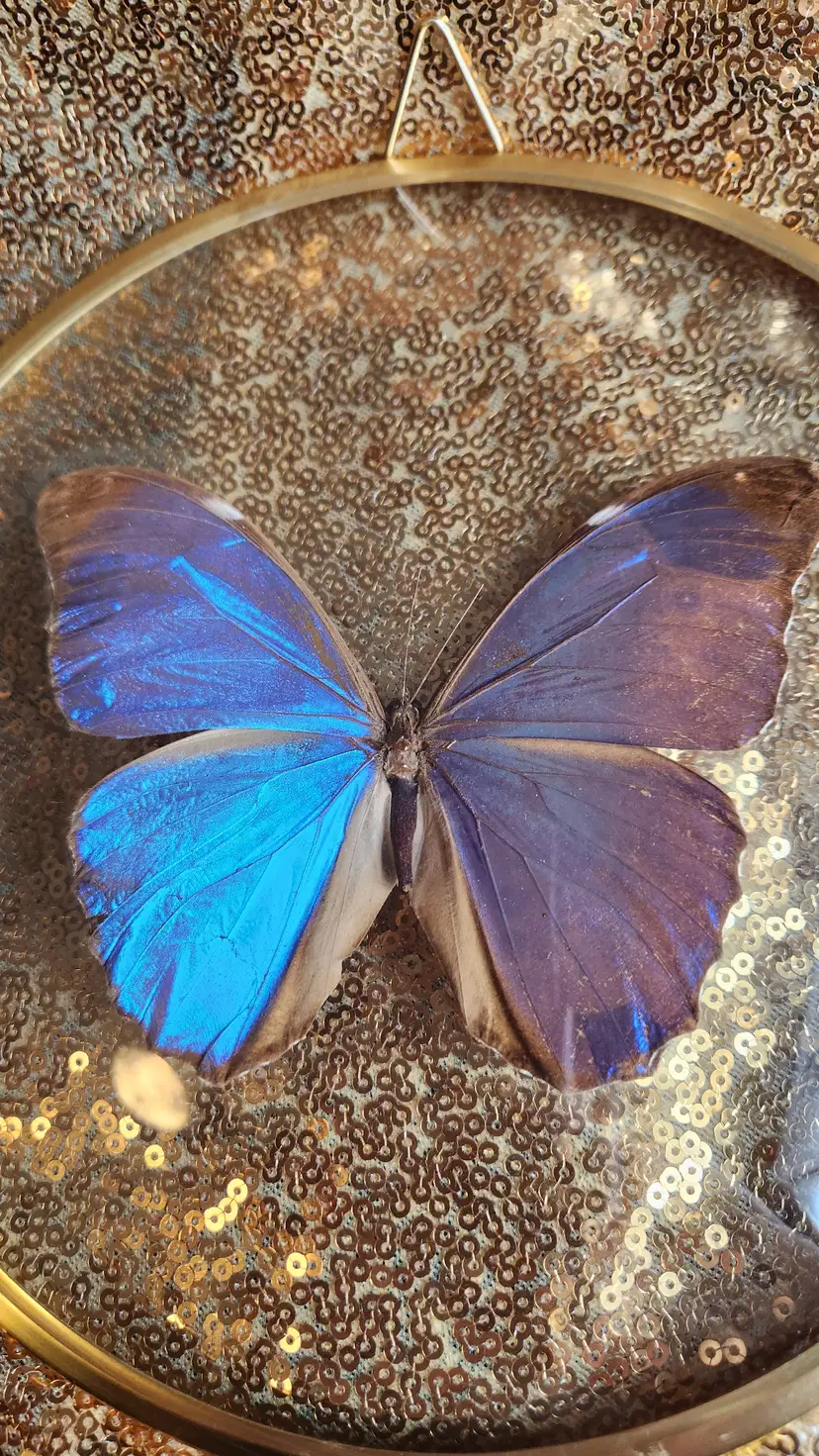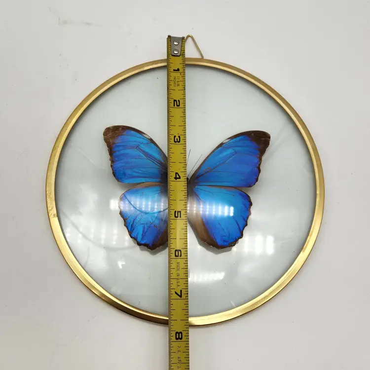 Vintage entomology at its best! Gorgeous blue under bubble glass with brass frame. 6" diameter.