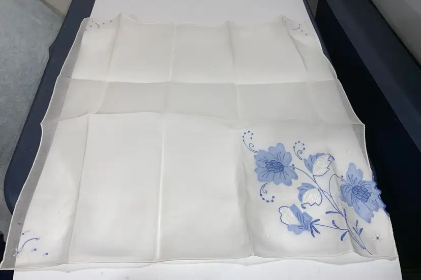 Vintage sheer blue flowers appliqué with cut out designs handkerchief hanky. Large measures 15” x 15”. Excellent condition.