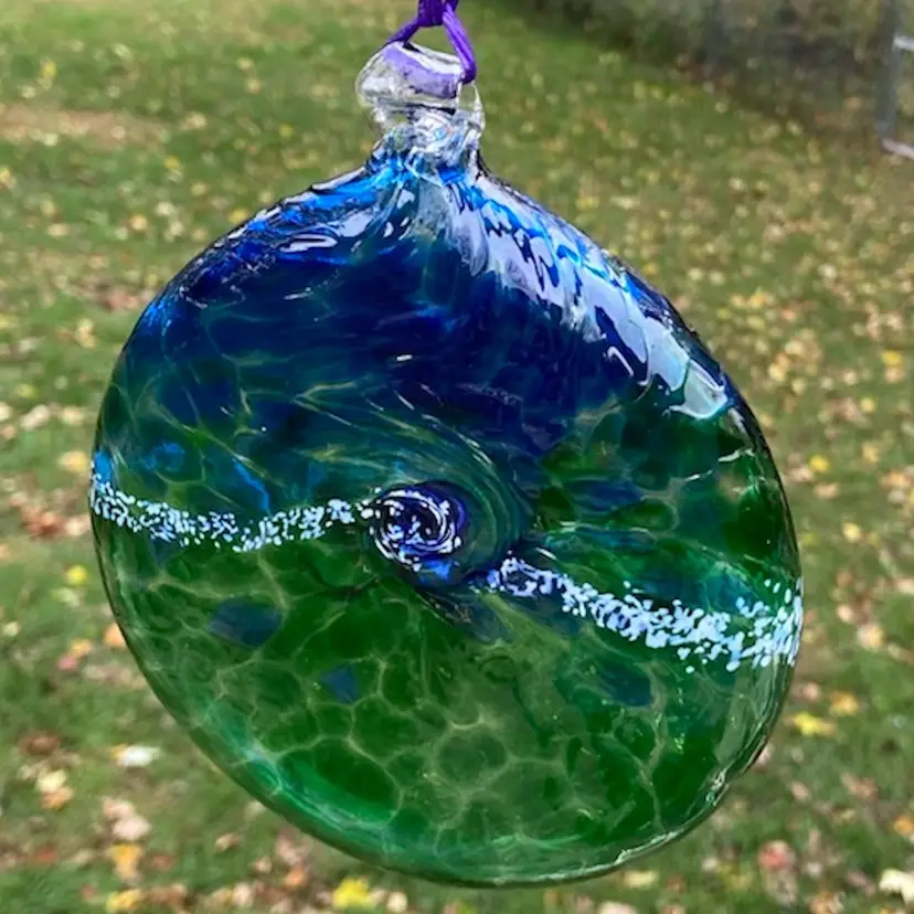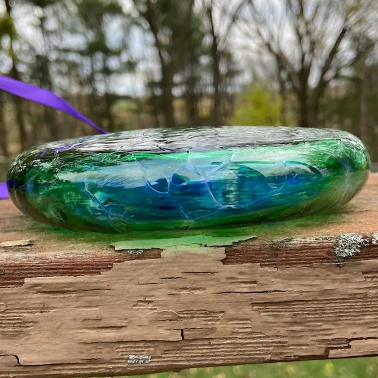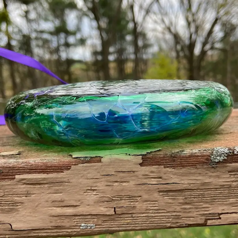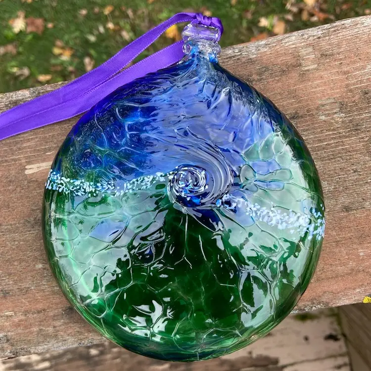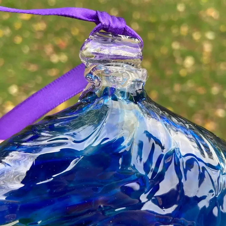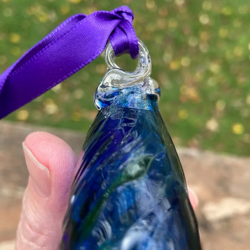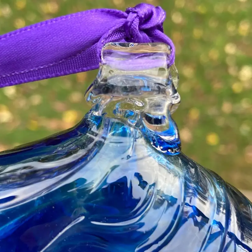 Approx: 5.25”w x 6.25”h (including hanger) x .75”d. Pre-owned condition. No chips or cracks. Purple ribbon included. See images as part of description.
