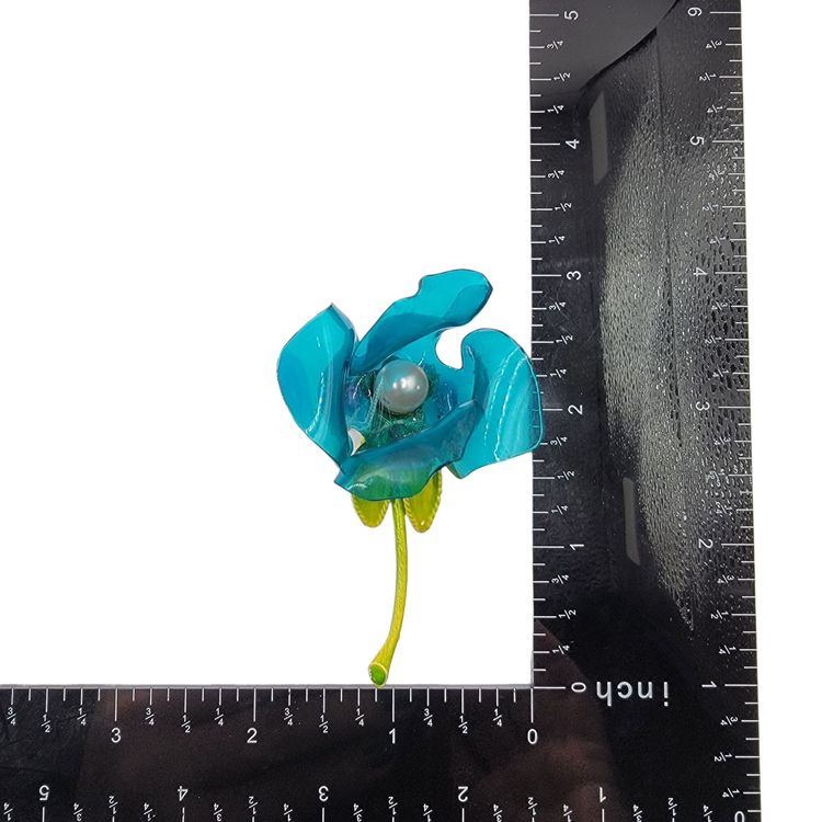 In the vibrant era of the 1960s, this exquisite blue flower brooch captures the whimsical essence of the time. Handcrafted with cellulose acetate, it showcases a stunning faux pearl center and a delicate green enamel stem. An enchanting accessory that whispers tales of elegance and style from a bygone era.