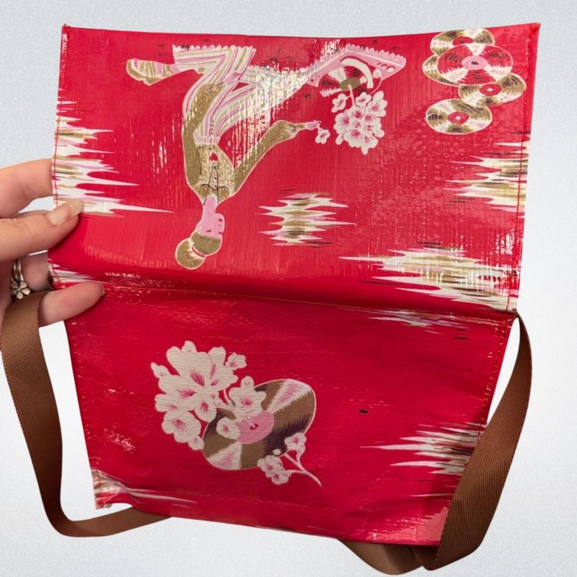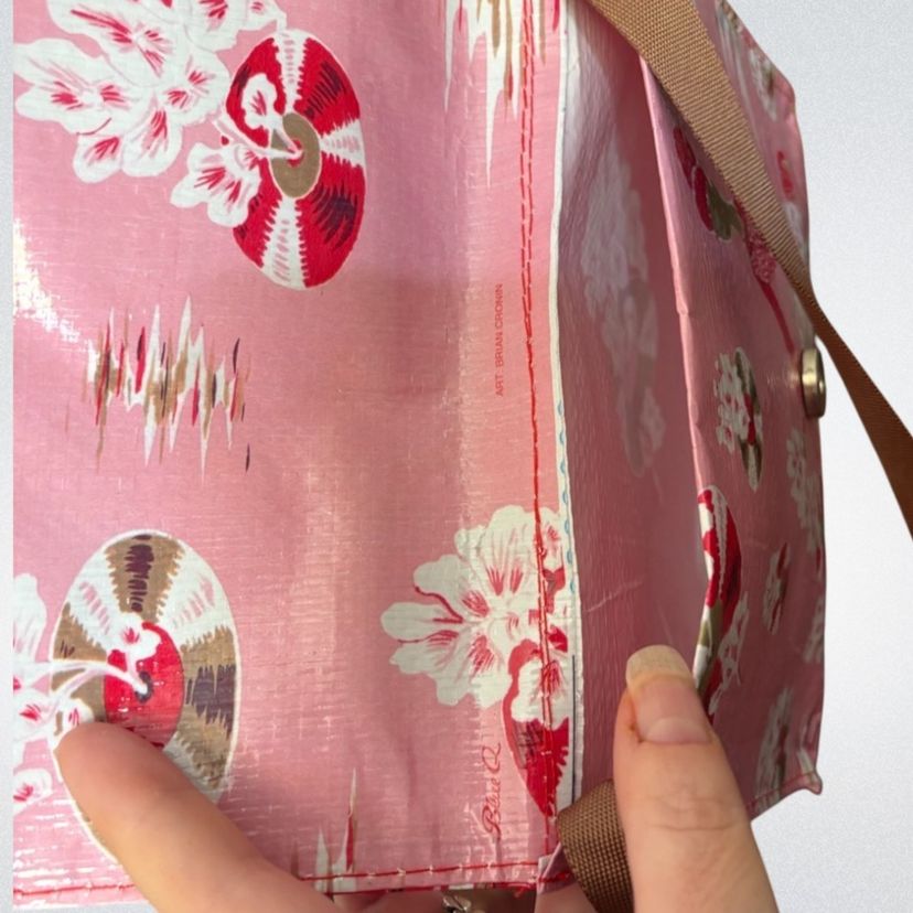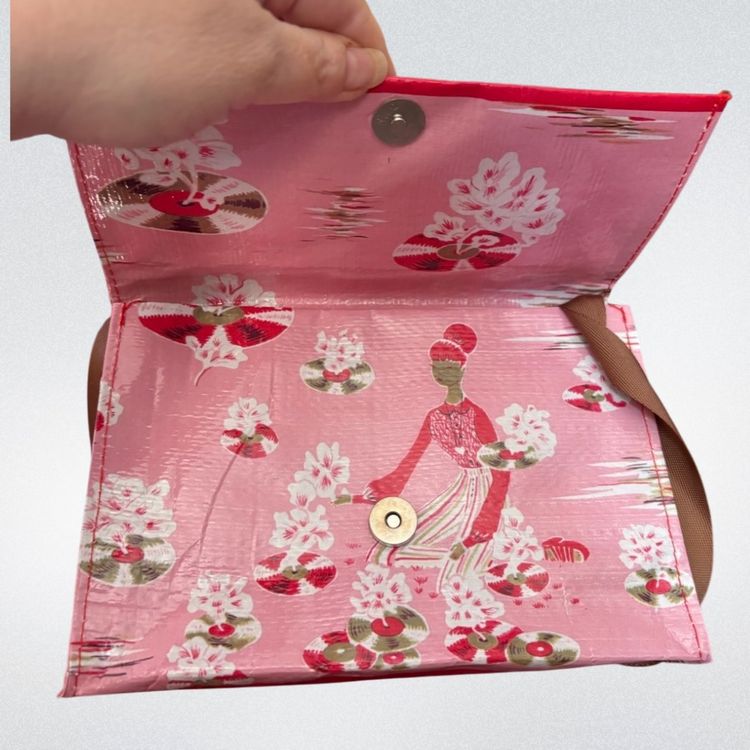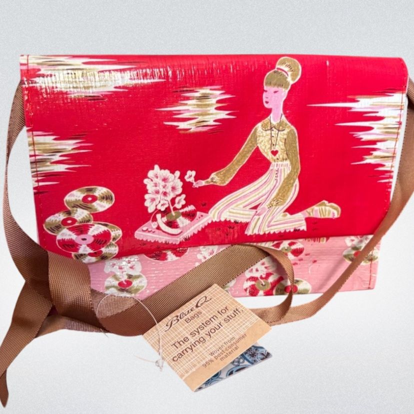 New with Tags Blue Q Crossbody about 9x6 Groovy pattern with records and flowers Outside is mostly red, inside is mostly pink Snap closure, no pockets