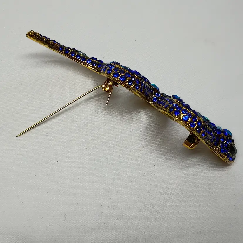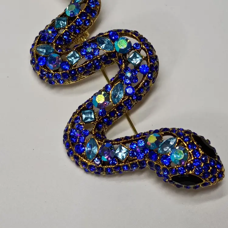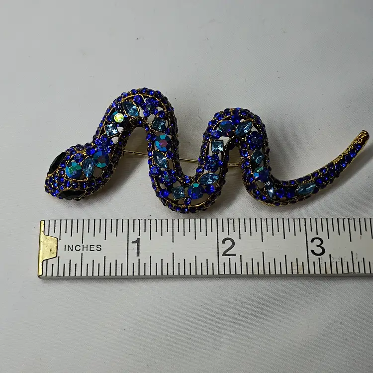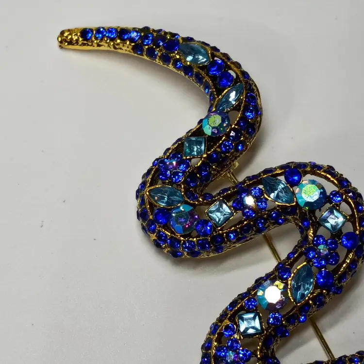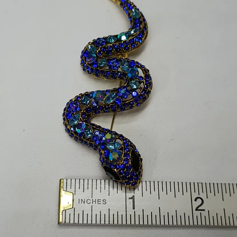 Stunning sparkly blue rhinestone snake brooch in gold tone metal. Incredible detail with multiple shades of blue stones and black accent eyes. Measures approximately as shown in pictures. Overall in great to excellent condition.
