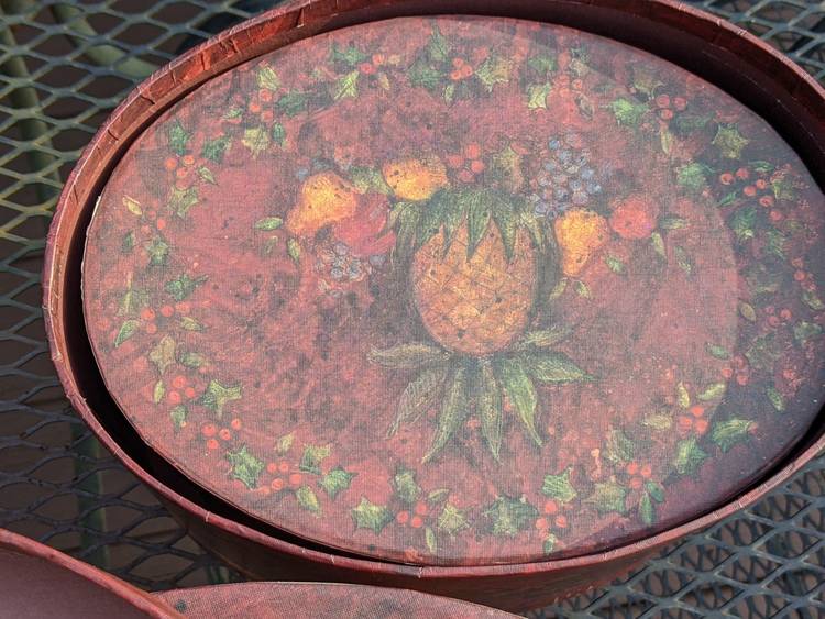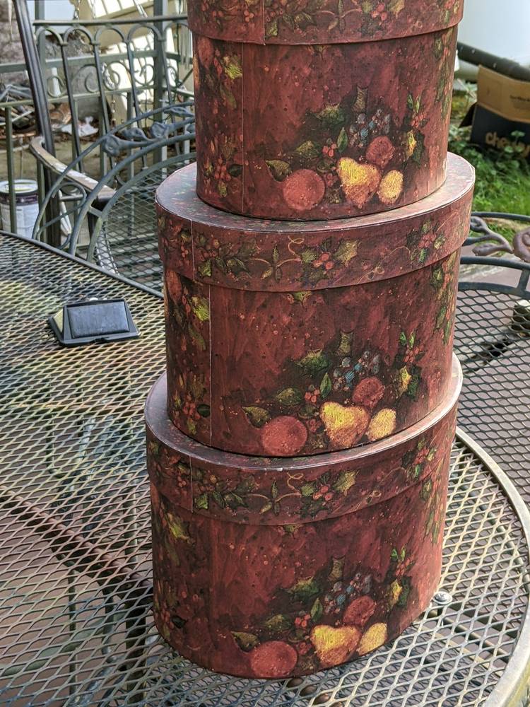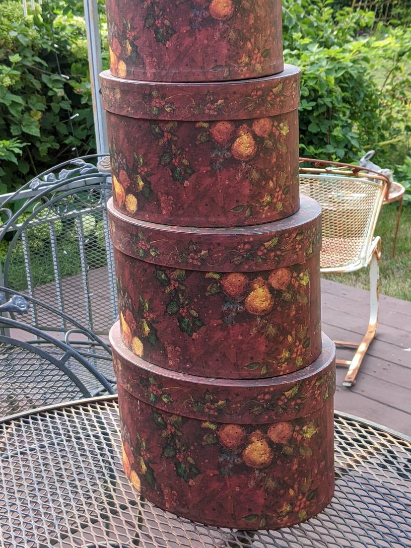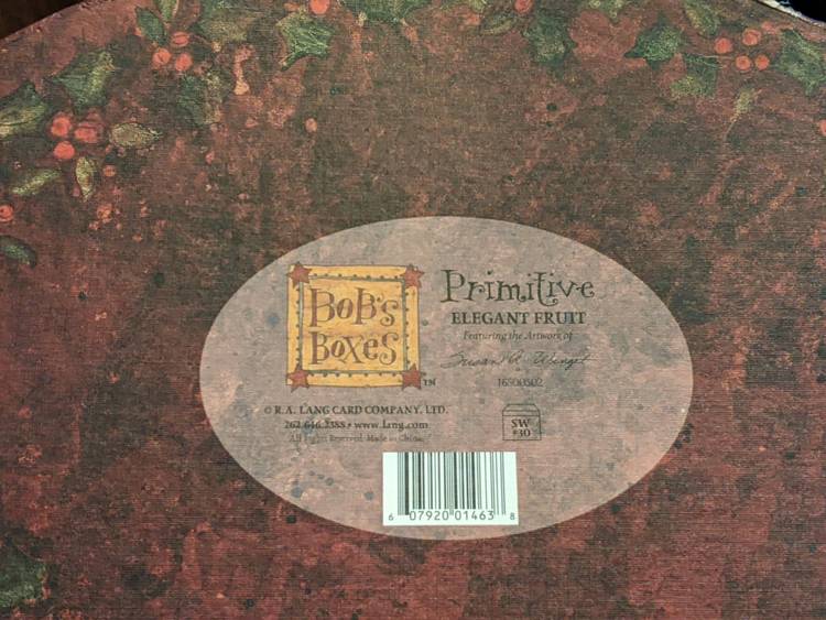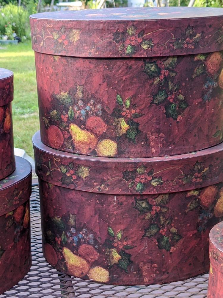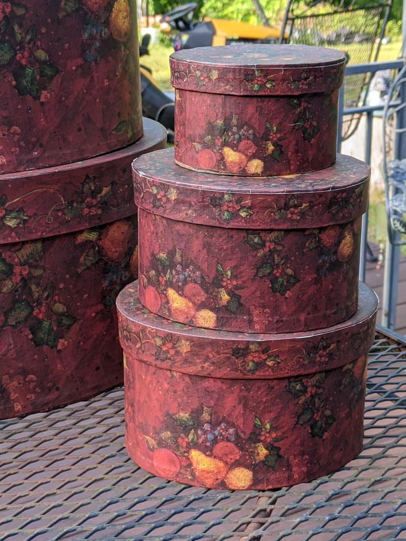 Bob's Boxes Elegant Fruit Primitive Set 7 Preowned Nesting Boxes Lang Card Co. Designed Art work by Susan Winget . they all have their covers and range in size from 13" wide x8 in tall ,11.5x7", 10"x6.5",9"x 5.5", 7"x4.5",6.5x3.75", 4.5x3.5". The last one has a bag of Christmas potpourri in it . They are wine color with pineapple and pears , holly . Very sturdy. Perfect for storage. It can fit in on a Christmas ,Winter, Castle Decor. This Item can be shipped USPS Ground or Ups Please contact me if you would like to know that shipping cost.