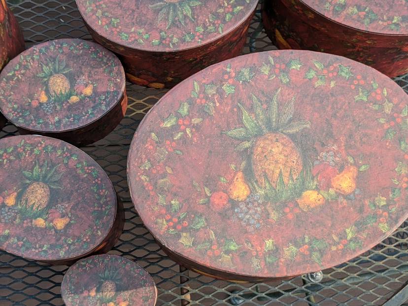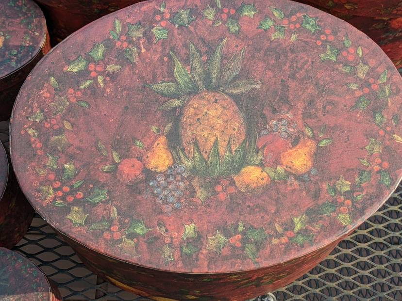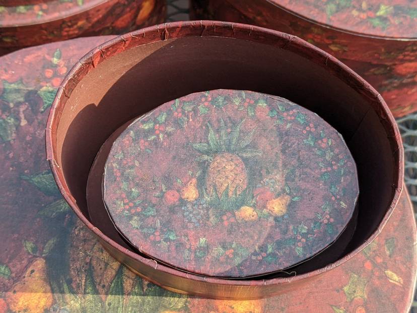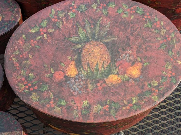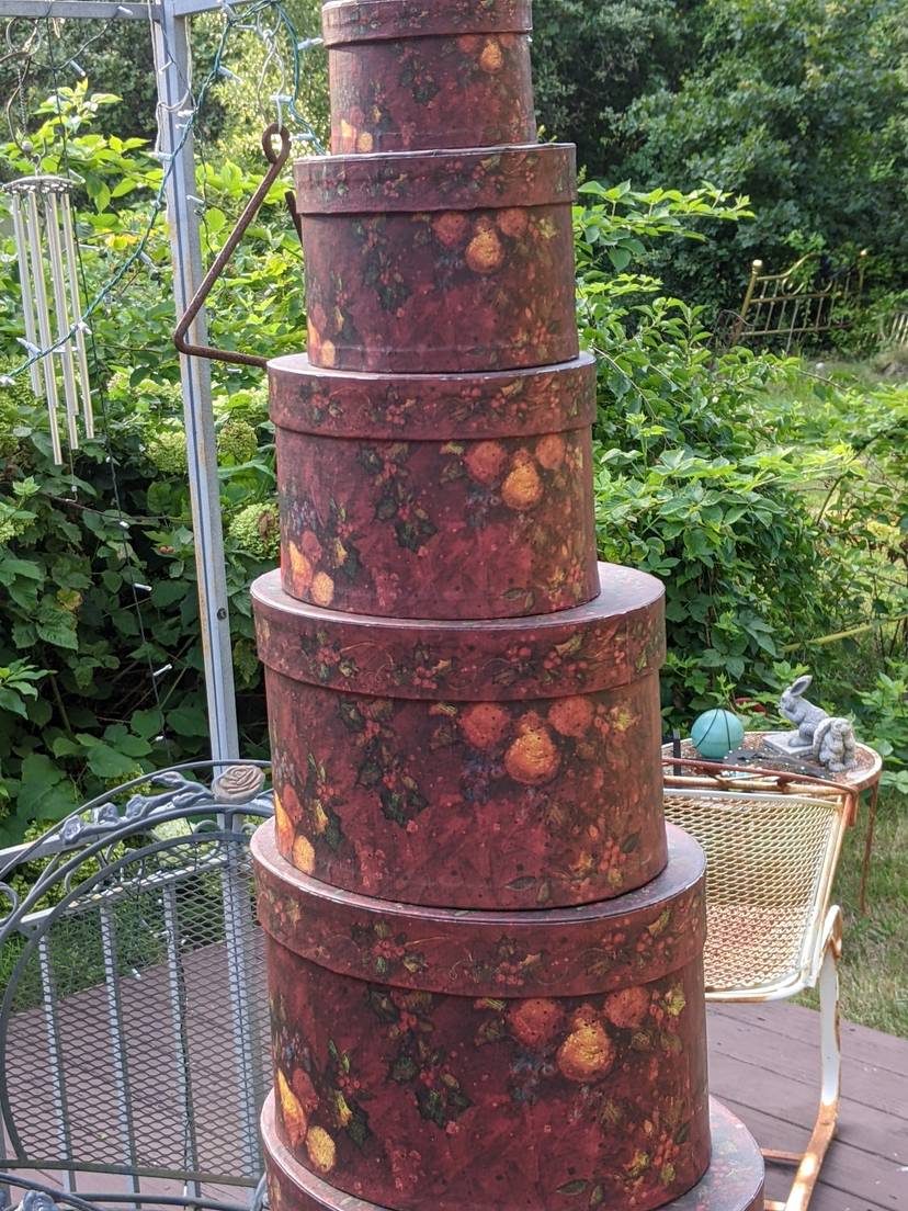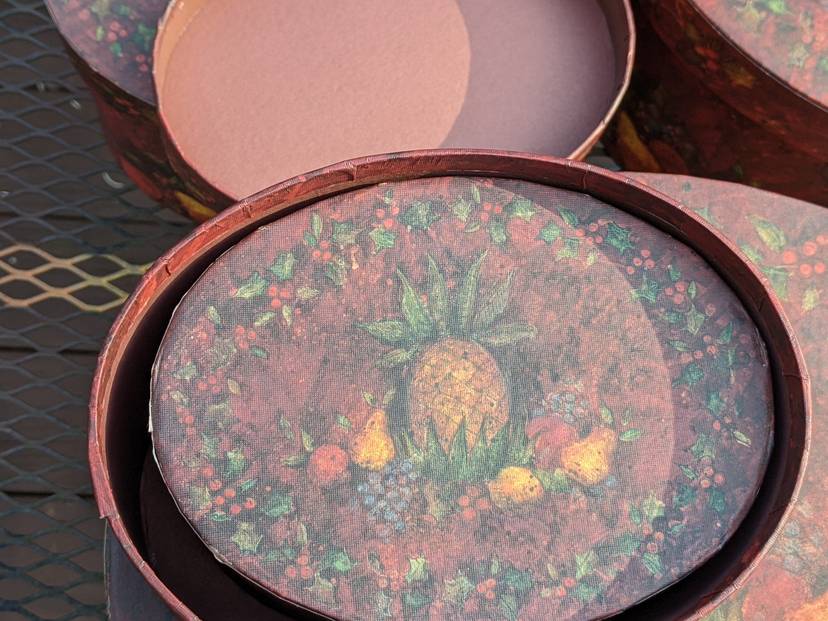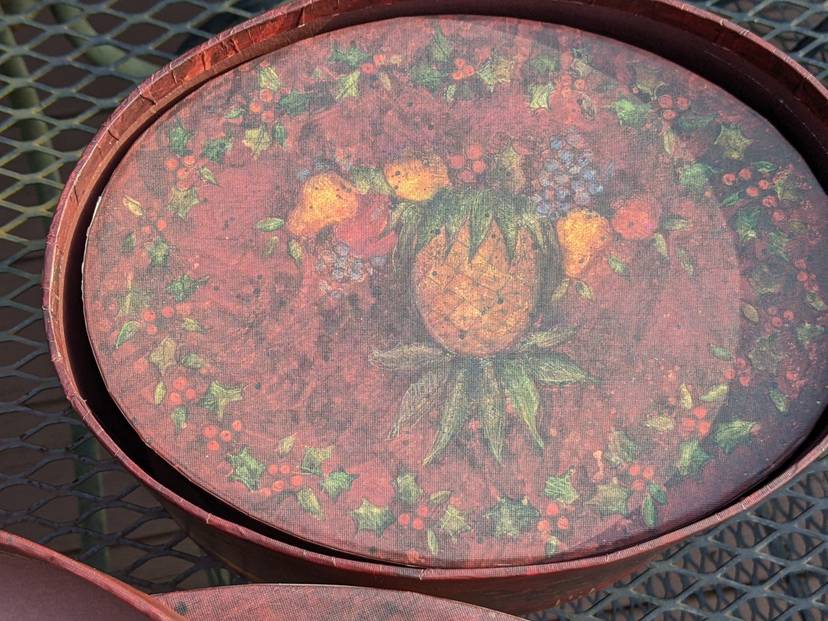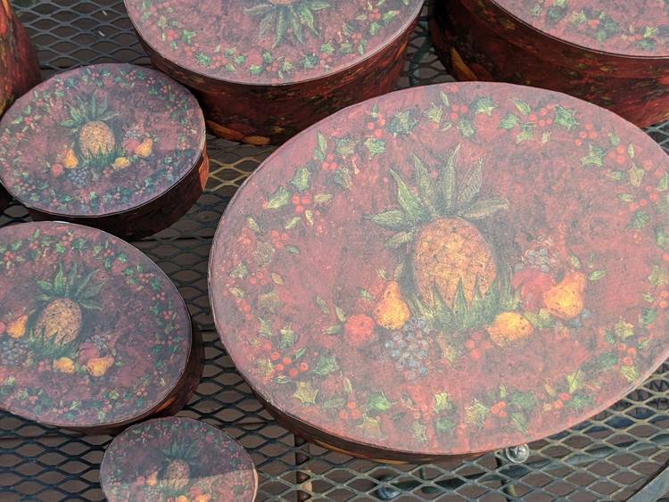 Bob's Boxes Elegant Fruit Primitive Set 7 Preowned Nesting Boxes Lang Card Co. Designed Art work by Susan Winget . they all have their covers and range in size from 13" wide x8 in tall ,11.5x7", 10"x6.5",9"x 5.5", 7"x4.5",6.5x3.75", 4.5x3.5". The last one has a bag of Christmas potpourri in it . They are wine color with pineapple and pears , holly . Very sturdy. Perfect for storage. It can fit in on a Christmas ,Winter, Castle Decor. This Item can be shipped USPS Ground or Ups Please contact me if you would like to know that shipping cost.
