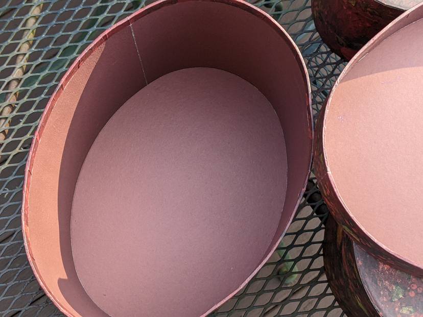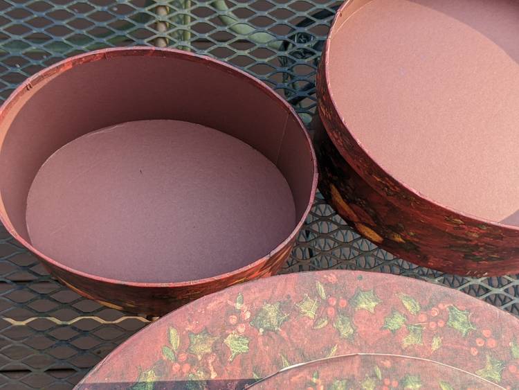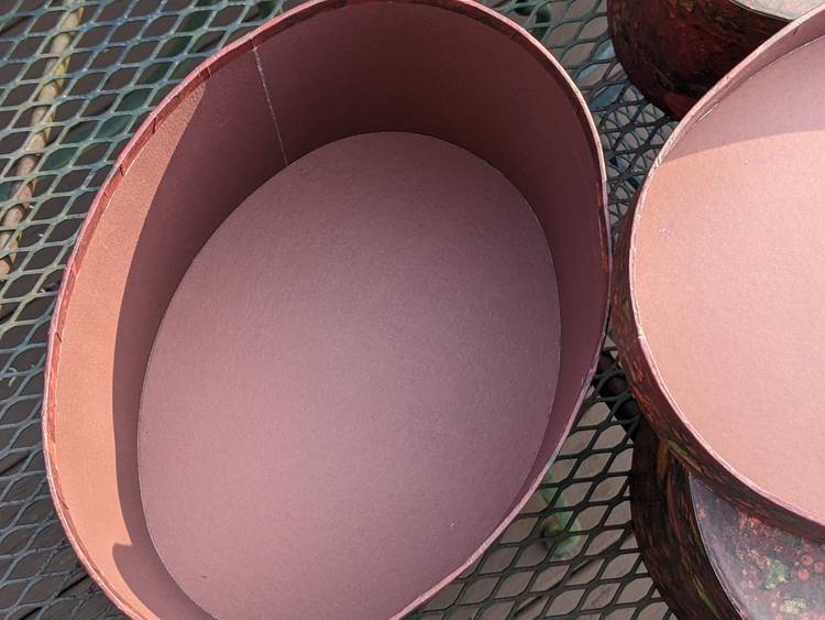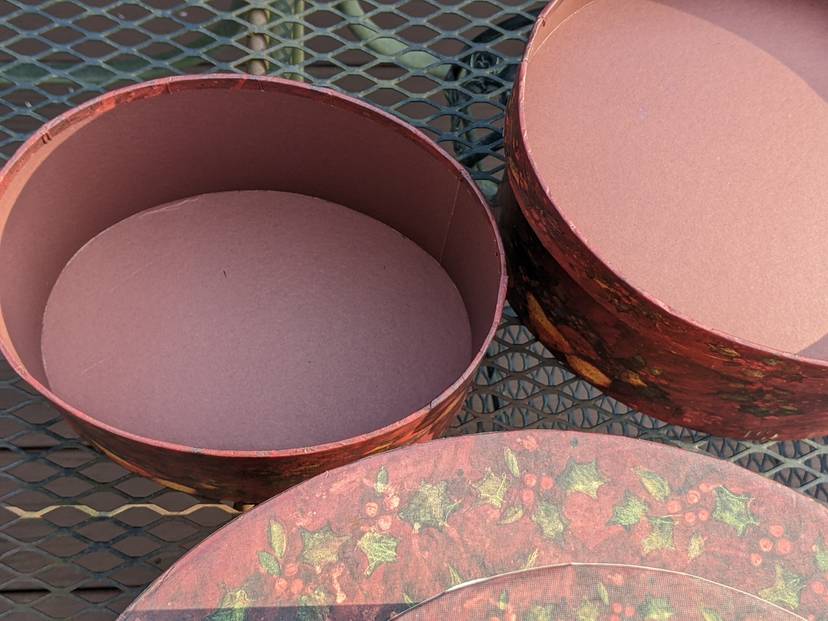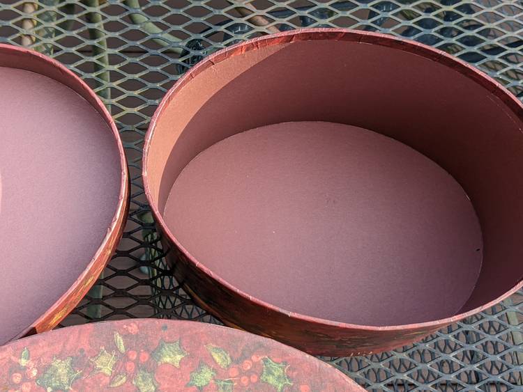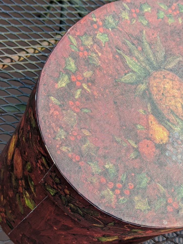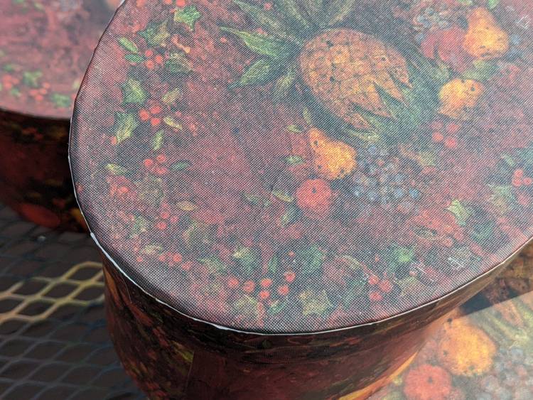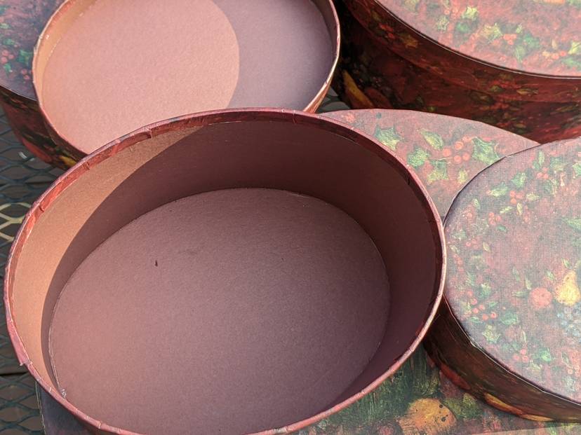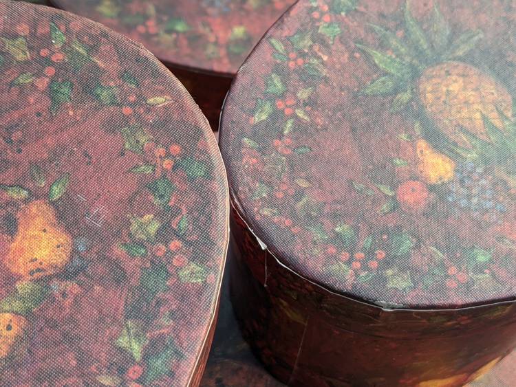Bob's Boxes Elegant Fruit Primitive Set 7 Preowned Nesting Boxes Lang Card Co. Designed Art work by Susan Winget . they all have their covers and range in size from 13" wide x8 in tall ,11.5x7", 10"x6.5",9"x 5.5", 7"x4.5",6.5x3.75", 4.5x3.5". The last one has a bag of Christmas potpourri in it . They are wine color with pineapple and pears , holly . Very sturdy. Perfect for storage. It can fit in on a Christmas ,Winter, Castle Decor. This Item can be shipped USPS Ground or Ups Please contact me if you would like to know that shipping cost.