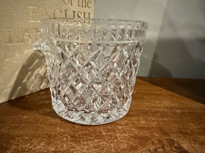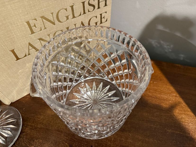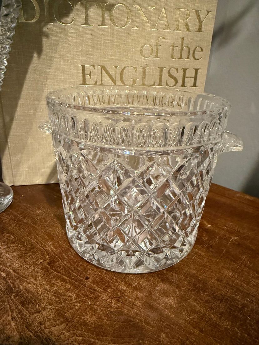Vintage Czech Republic 24% Lead Crystal Diamond Cut Ice Bucket. This elegant piece features a stunning diamond-cut pattern that catches the light beautifully. Perfect for serving ice at your next gathering or as a decorative accent. It retains its original sticker, indicating its authenticity and quality craftsmanship from the Czech Republic. In excellent pre-owned condition with no chips or cracks.
