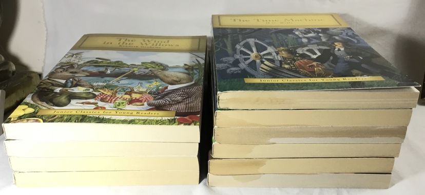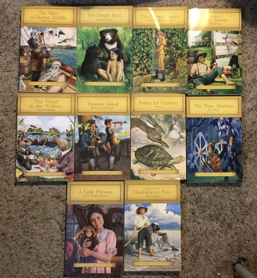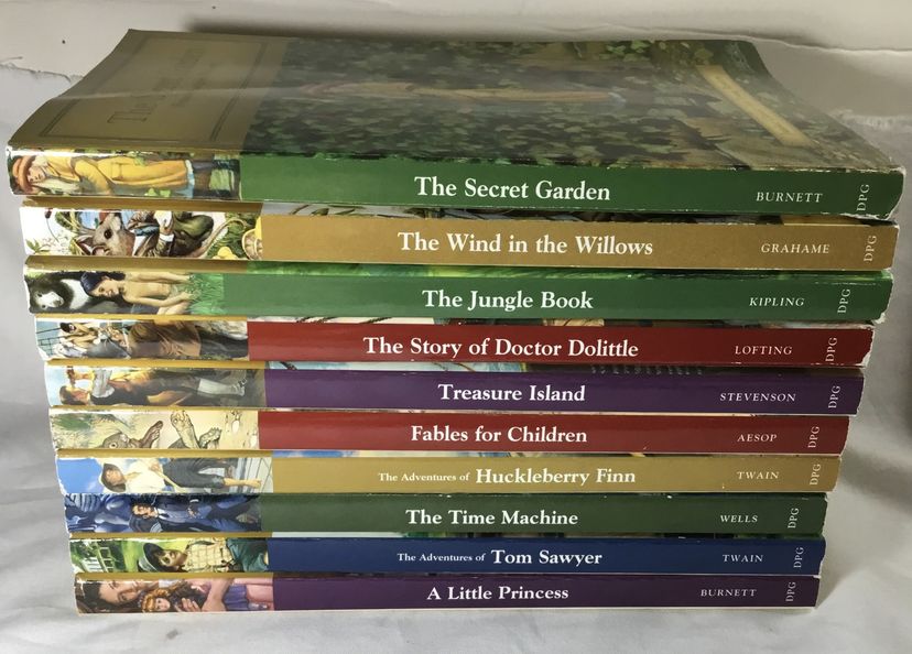 Lot of 10 Junior Classics for Young Readers books, by Dalmatian Press publishing 2 books from 2011: A Little Princess & The Time Machine. 8 books from 2012: The Jungle Book, The Secret Garden, Wind in the Willows, Dr. Doolittle, Treasure Island, Huckleberry Finn, Tom Sawyer, Aesop's Fables. All are illustrated. Minor wear on a few edges or corners.