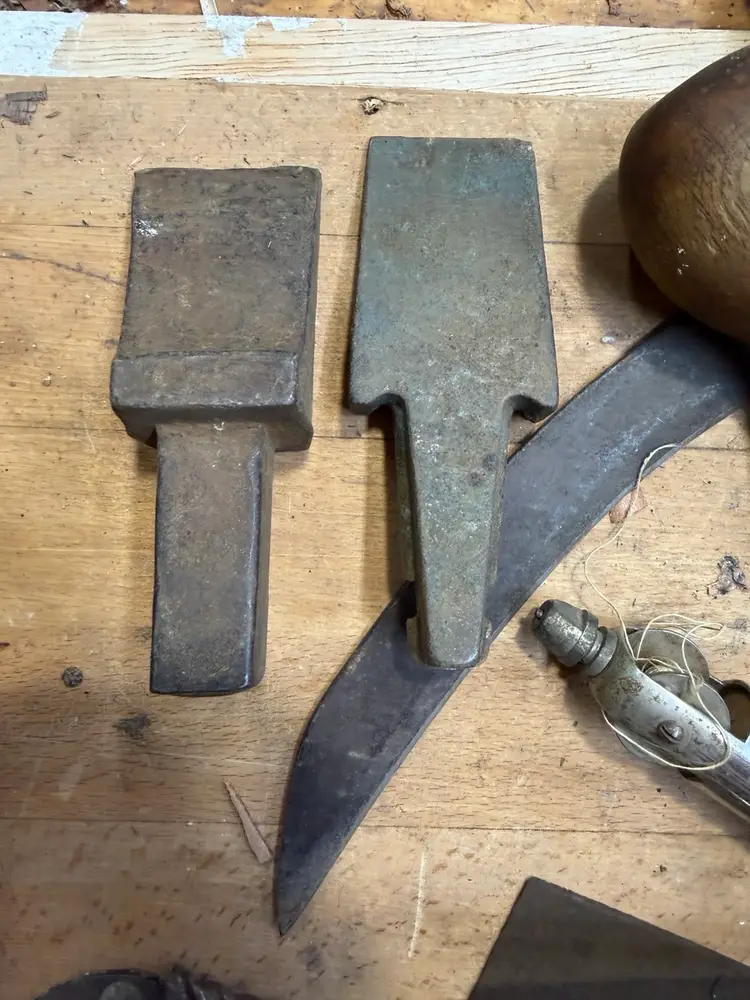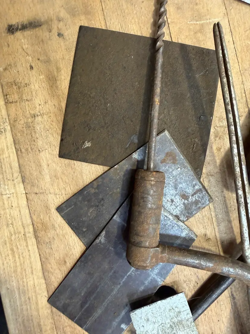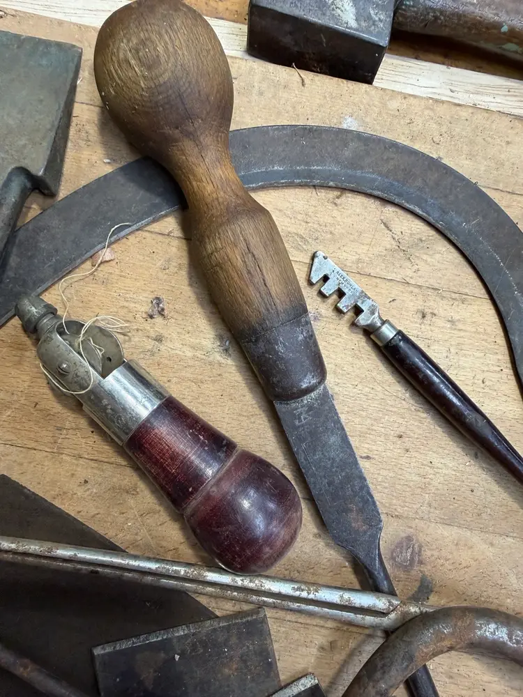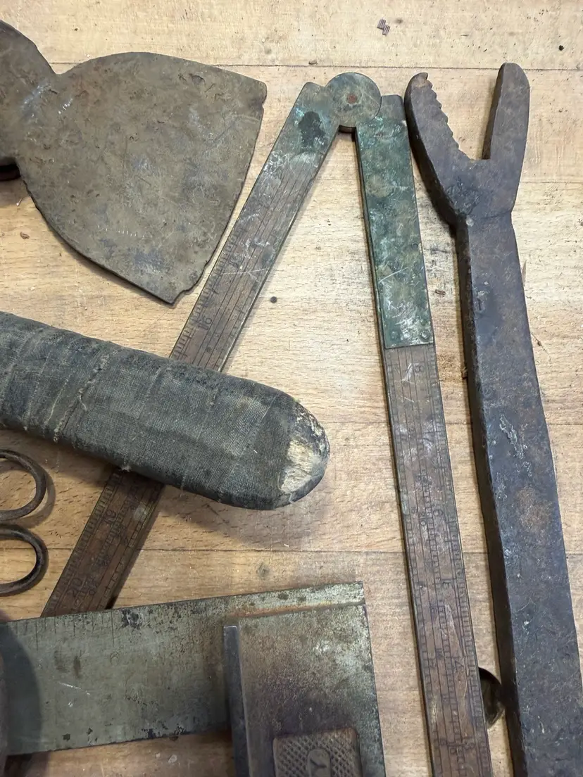 Box of miscellaneous tools. Card scrapers, long hemostat, blacksmithing (?) hot cuts (?), sickle (sharp), bit and brace, large screwdriver, folding rule with vintage repair and others.