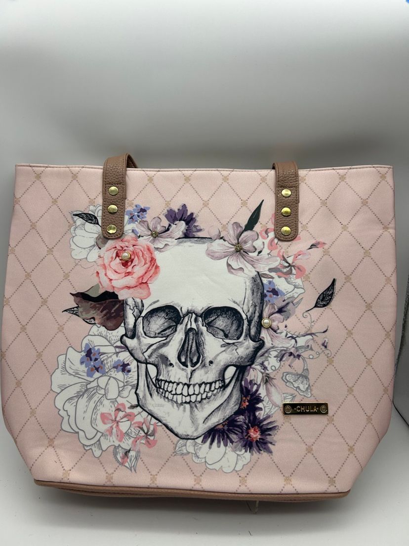 This pink sugar skull tote is perfect for computer/electronics bag for traveling . Also another perfect gift for Christmas . It measures approximately 17” wide and 13” tall. It also comes with a smaller tote.